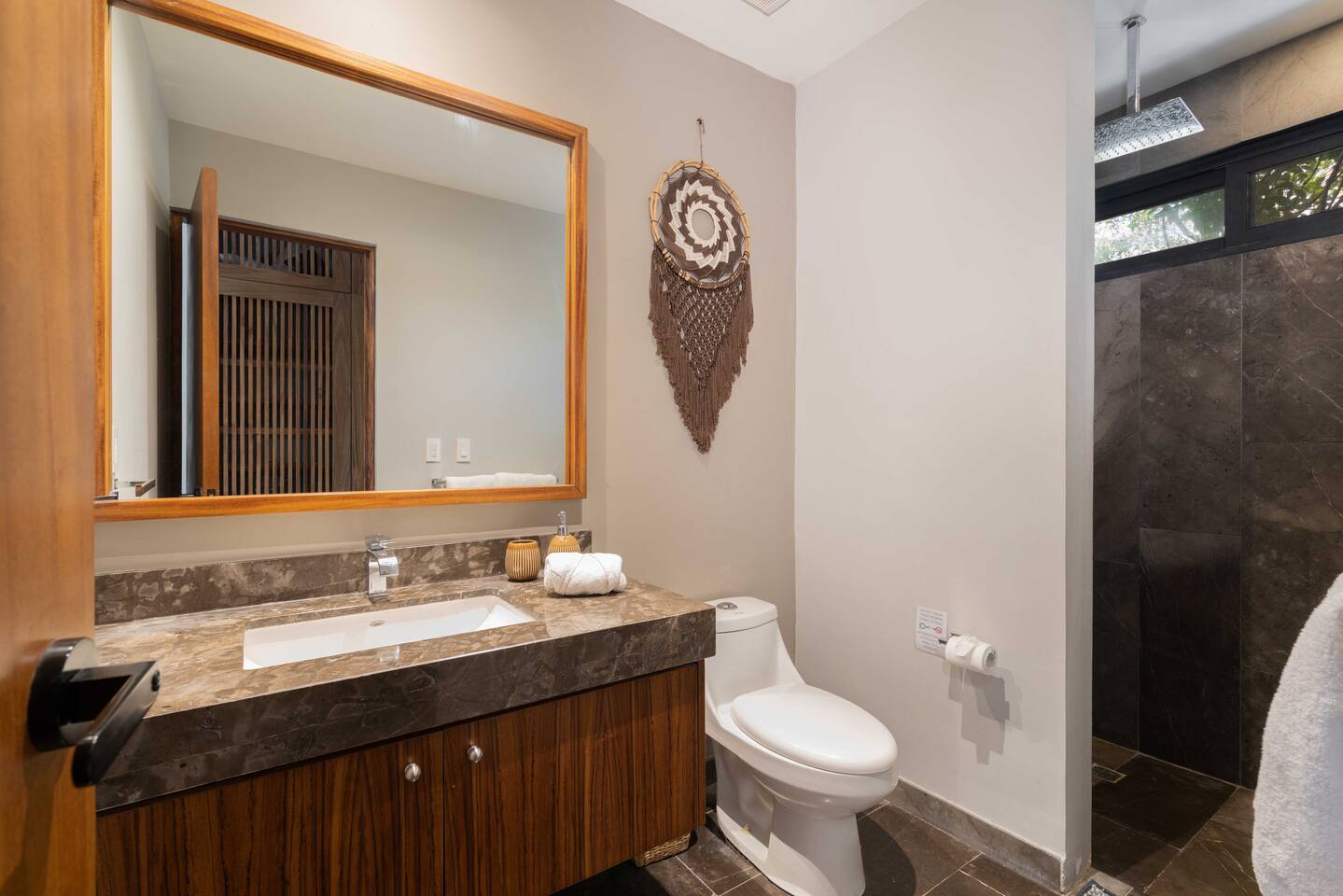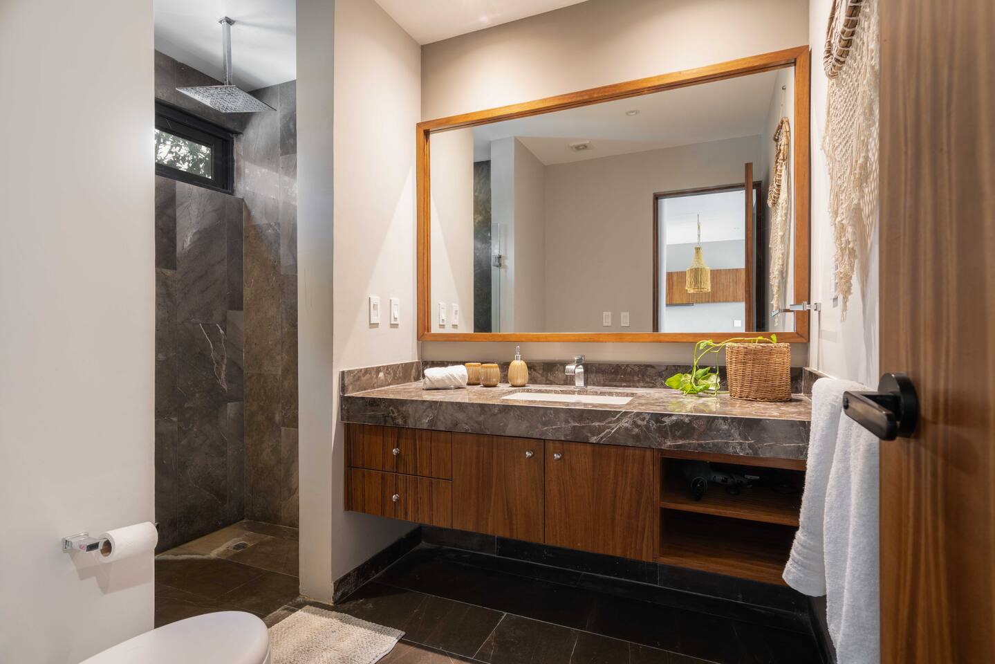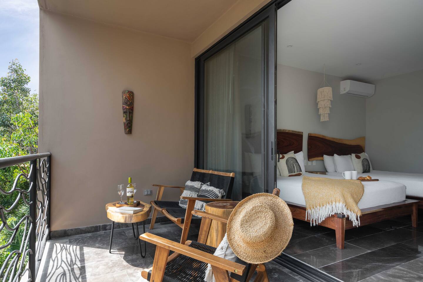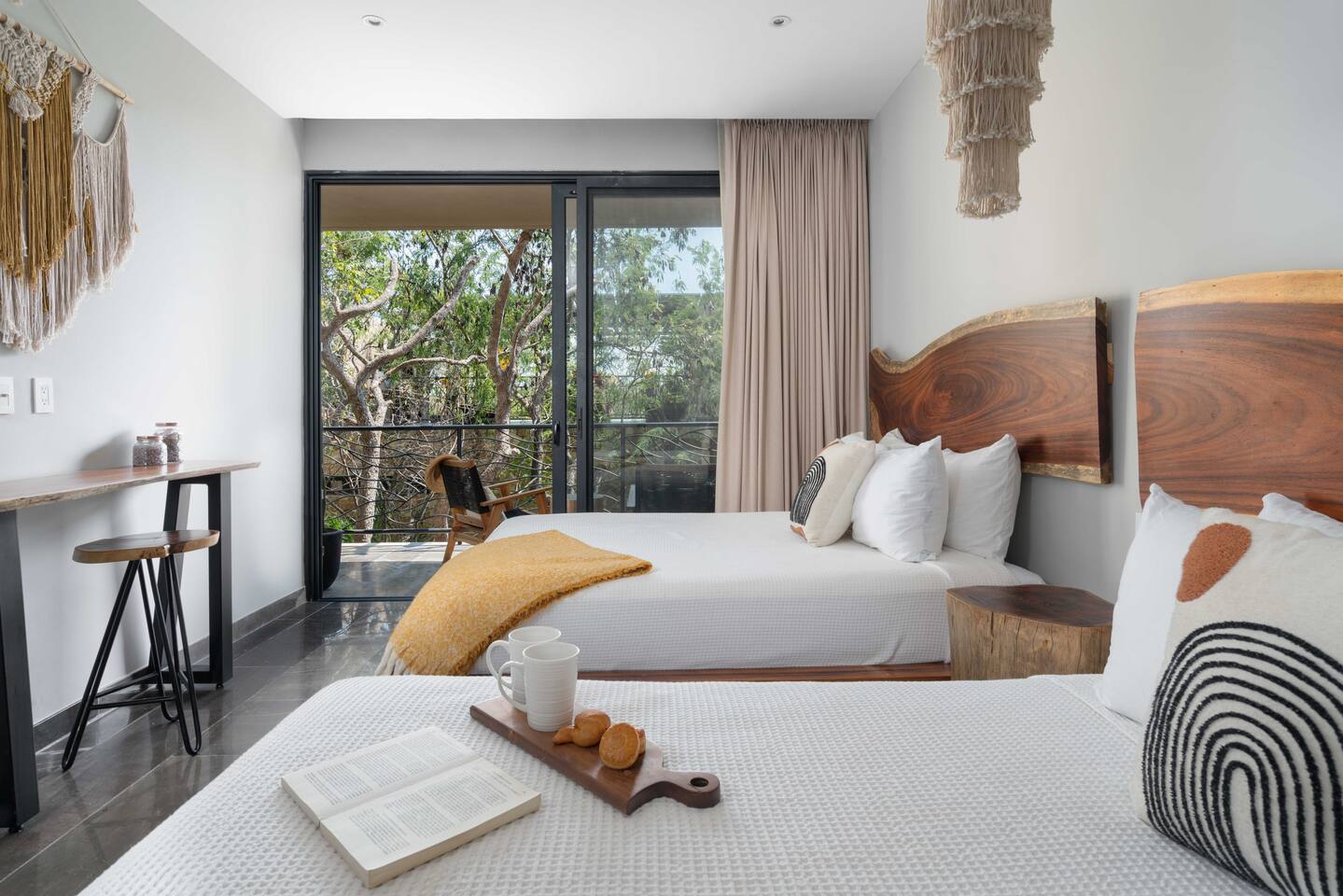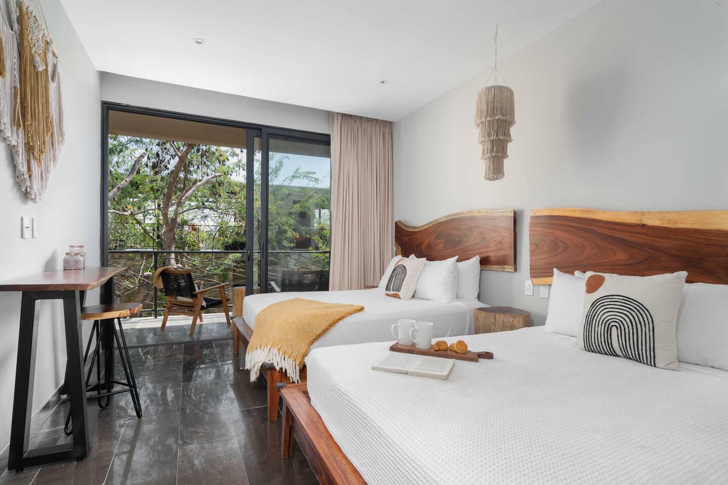 The suite is a very spacious two bedroom, with lots of natural light, high end finishes and Tulum's signature design style, high-speed wifi, and hot and cold water. The kitchen is fully equipped with high end appliances such as refrigerator, electric stovetop, high end toaster oven, blender, and coffee maker. Lots of cookware, plates and utensils. The living room has a super comfortable sectional sofa that can be used as a sofabed, with a SMART TV and applications like Netflix and Youtube. A great place to relax day or night. Open the sliding doors to the terrace for a great indoor/outdoor living space that overlooks beautiful trees and greenery. The Master bedroom is a beautiful space for optimal relaxation. A King size bed, high end mattress and darkening curtains for a feeling of ultimate luxury. Lots of closet space and a large safe in the closet to secure your items. The bedroom also walks out to the terrace for an ultra tropical feeling, Additionally, the bedroom has an ensuite bathroom with plenty of counter space and light. The Second bedroom has 2 Queen size beds with comfortable mattresses and linens, and darkening curtains for optimal sleep. Tons of closet space for clothes and belongings as well. This bedroom also has access to the terrace and its own ensuite bathroom with the same features. Your reservation also includes a full service concierge that can assist you with airport transportation, private chef services, massage and wellness services, tours and excursions, ATVs and scooter rentals, beach club reservations, and much more. The building has luxury amenities such as a stunning rooftop pool overlooking the jungle with sun loungers and a seating lounge, an outdoor kitchen and BBQ area, and an outdoor fitness space and yoga terrace. We look forward to hosting you and providing an unforgettable stay in Tulum!
