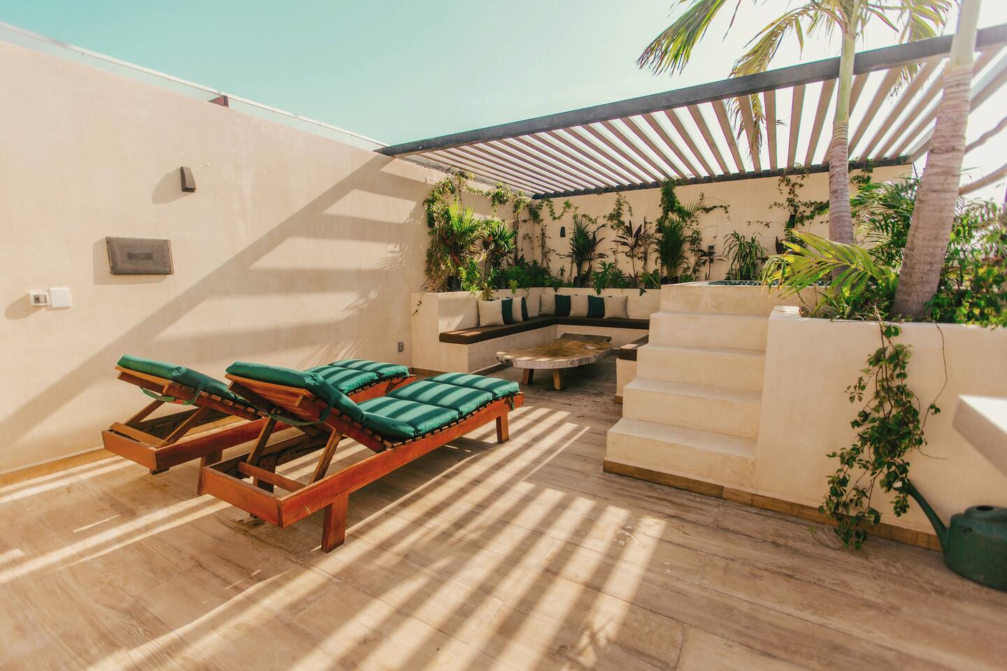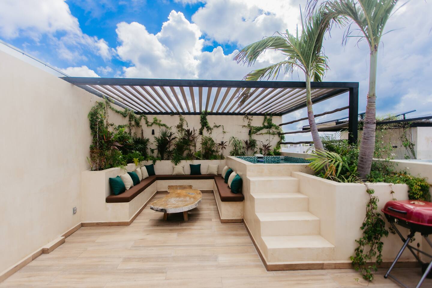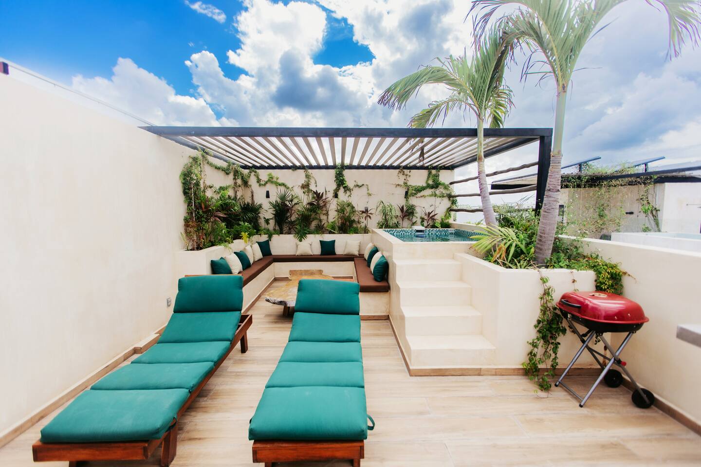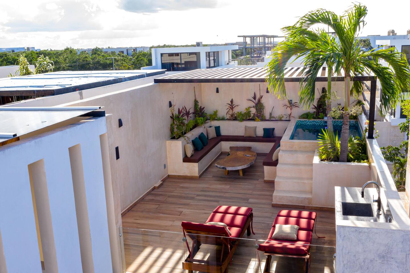 Experience a sense of calm when you arrive at Dune. Perfectly tucked away within a quiet oasis you'll be able to relax in Tulum's jungle setting. The main level pool and lounge deck are very serene, especially at night with the warm lighting and tropical trees and plants surrounding the area. The suite is a spacious modern build with lots of natural light and high end finishes. The kitchen is fully equipped with high end appliances such as refrigerator, electric stovetop, toaster oven, blender, and coffee machine. Lots of cookware, plates and utensils. Kitchen island with seating as well as a 4-person dining table. The living room has a super comfortable sectional couch, with a SMART TV and applications like Netflix and Youtube. A great place to relax day or night. The bedroom is beautifully designed for optimal relaxation. High end mattress with hotel quality linens and pillows and black out curtains. The bed also has beautiful drapery surrounding it, creating a luxurious feeling as you sleep. The bedroom also has a west facing balcony attached, where you can see some beautiful colours in the sky as the sun sets. Additionally, the bedroom has an ensuite bathroom with double sinks, a rain shower head and beautiful mosaic shower. Perhaps the best feature of this suite is the completely private rooftop lounge and pool. This space is optimal for sun-bathing as it has completely unobstructed sun exposure. There's also plenty of seating and lounge chairs and the elevated plunge pool is perfect for staying cool in the Mexico sun! 2 free bikes are included with your reservation and a free ATV* Your reservation also includes a full service concierge that can assist you with airport transportation, private chef services, massage and wellness services, tours and excursions, ATVs and scooter rentals, beach club reservations, and much more. *ATV is available for free from April to November. Please request the ATV PRIOR to completing your reservation.