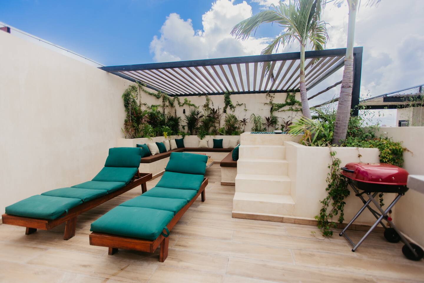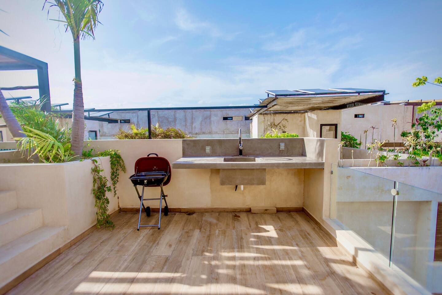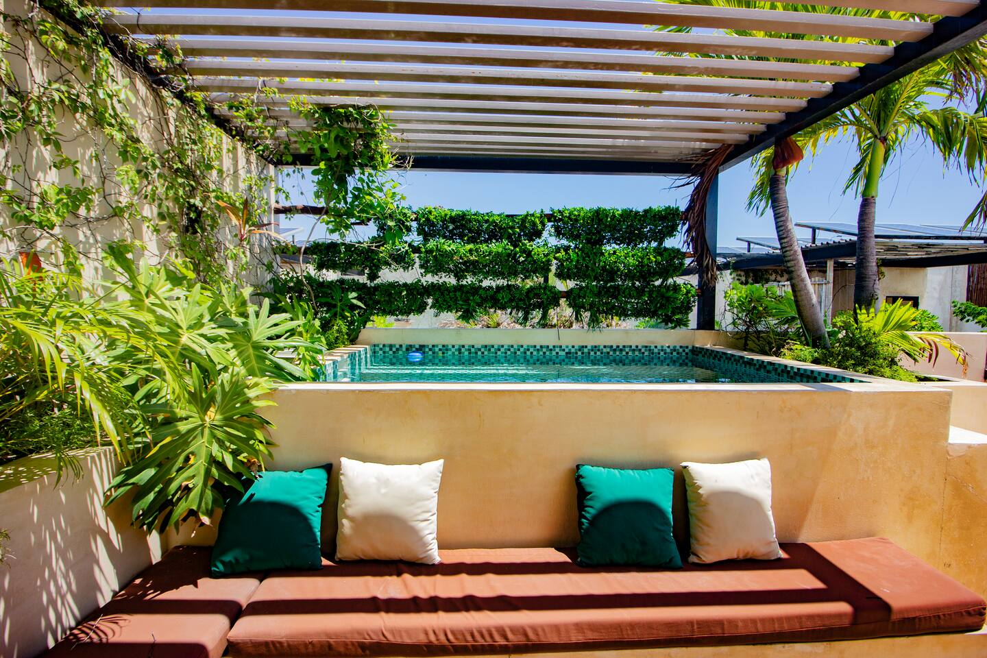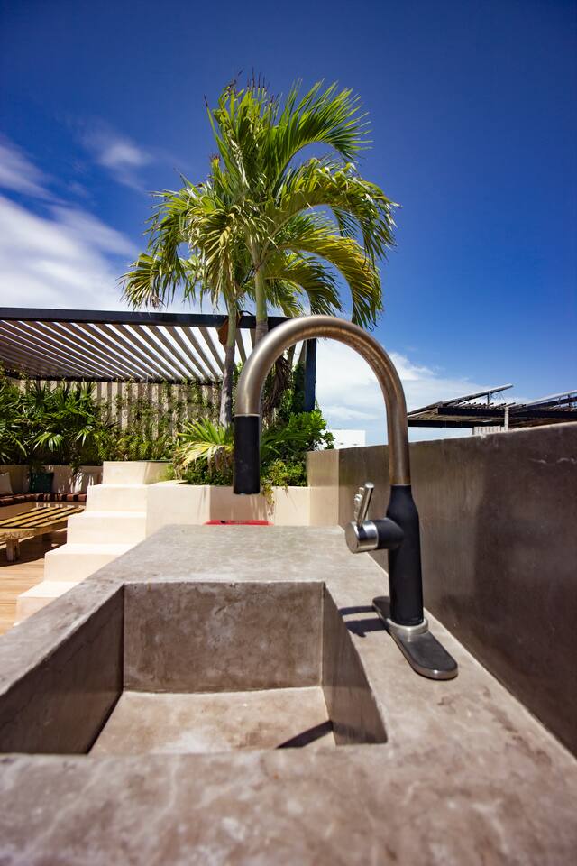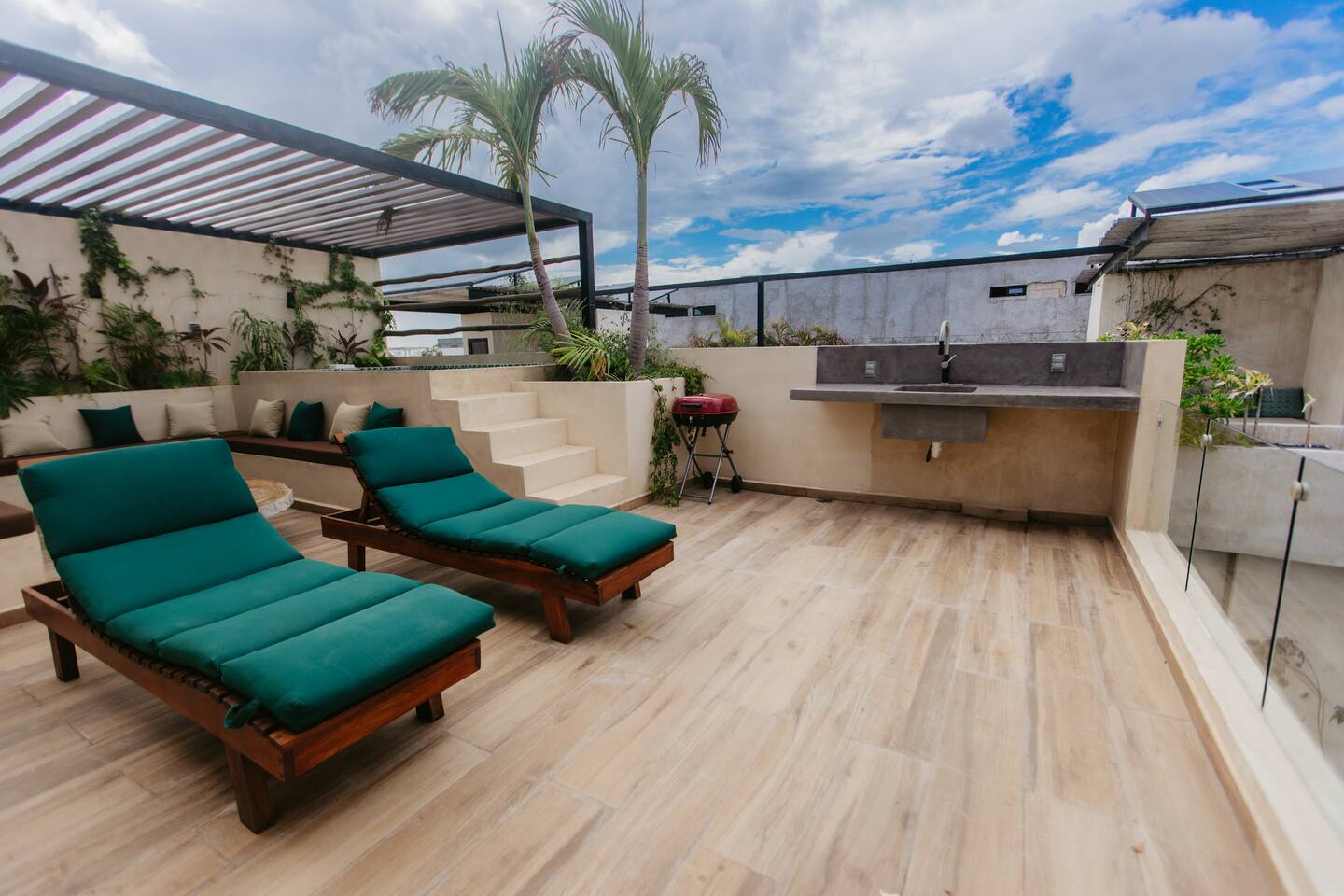 Experience a sense of calm when you arrive at Dune. Perfectly tucked away within a quiet oasis you'll be able to relax in Tulum's jungle setting. The main level pool and lounge deck are very serene, especially at night with the warm lighting and tropical trees and plants surrounding the area. The suite is a spacious modern build with lots of natural light and high end finishes. The kitchen is fully equipped with high end appliances such as refrigerator, electric stovetop, toaster oven, blender, and coffee machine. Lots of cookware, plates and utensils. Kitchen island with seating as well as a 4-person dining table. The living room has a super comfortable sectional couch, with a SMART TV and applications like Netflix and Youtube. A great place to relax day or night. The bedroom is beautifully designed for optimal relaxation. High end mattress with hotel quality linens and pillows and black out curtains. The bed also has beautiful drapery surrounding it, creating a luxurious feeling as you sleep. The bedroom also has a west facing balcony attached, where you can see some beautiful colours in the sky as the sun sets. Additionally, the bedroom has an ensuite bathroom with double sinks, a rain shower head and beautiful mosaic shower. Perhaps the best feature of this suite is the completely private rooftop lounge and pool. This space is optimal for sun-bathing as it has completely unobstructed sun exposure. There's also plenty of seating and lounge chairs and the elevated plunge pool is perfect for staying cool in the Mexico sun! 2 free bikes are included with your reservation and a free ATV* Your reservation also includes a full service concierge that can assist you with airport transportation, private chef services, massage and wellness services, tours and excursions, ATVs and scooter rentals, beach club reservations, and much more. *ATV is available for free from April to November. Please request the ATV PRIOR to completing your reservation.