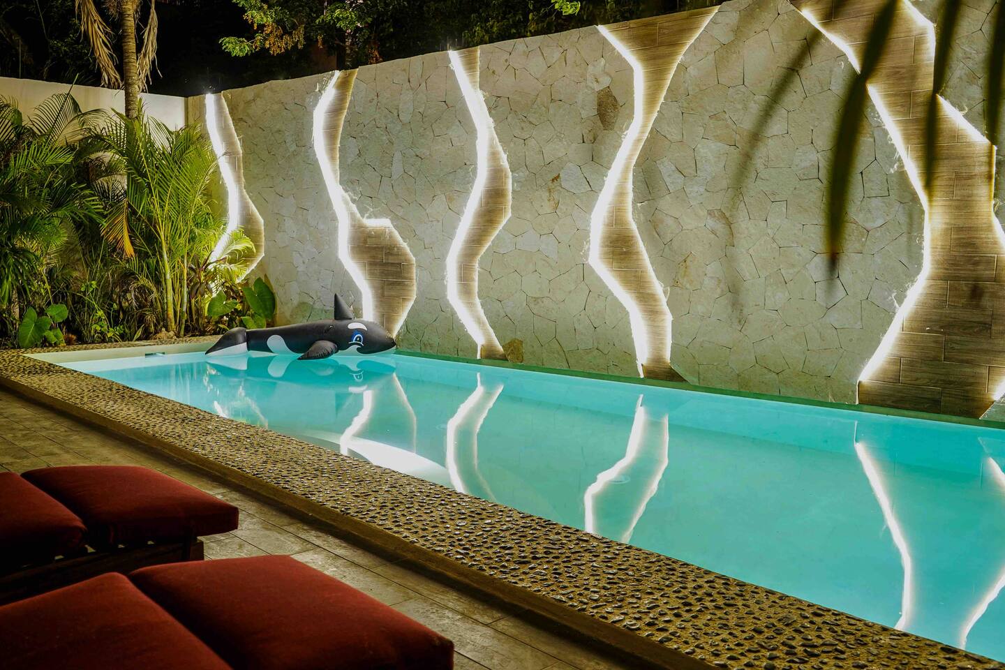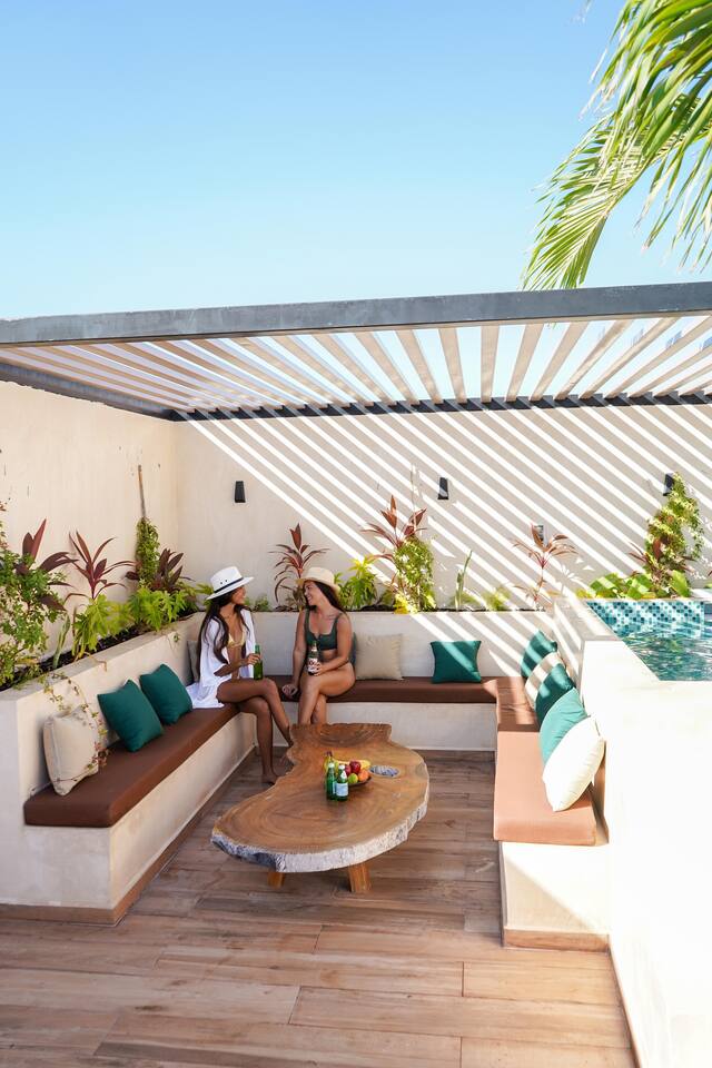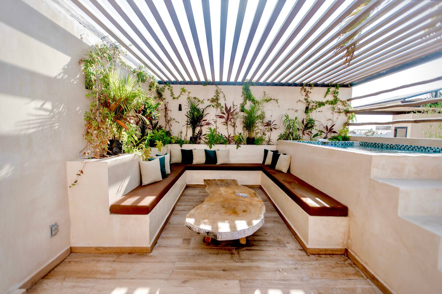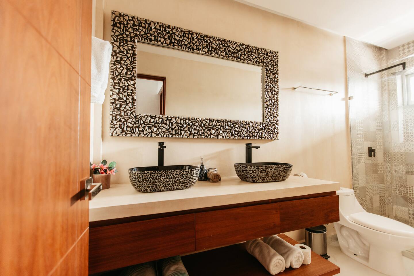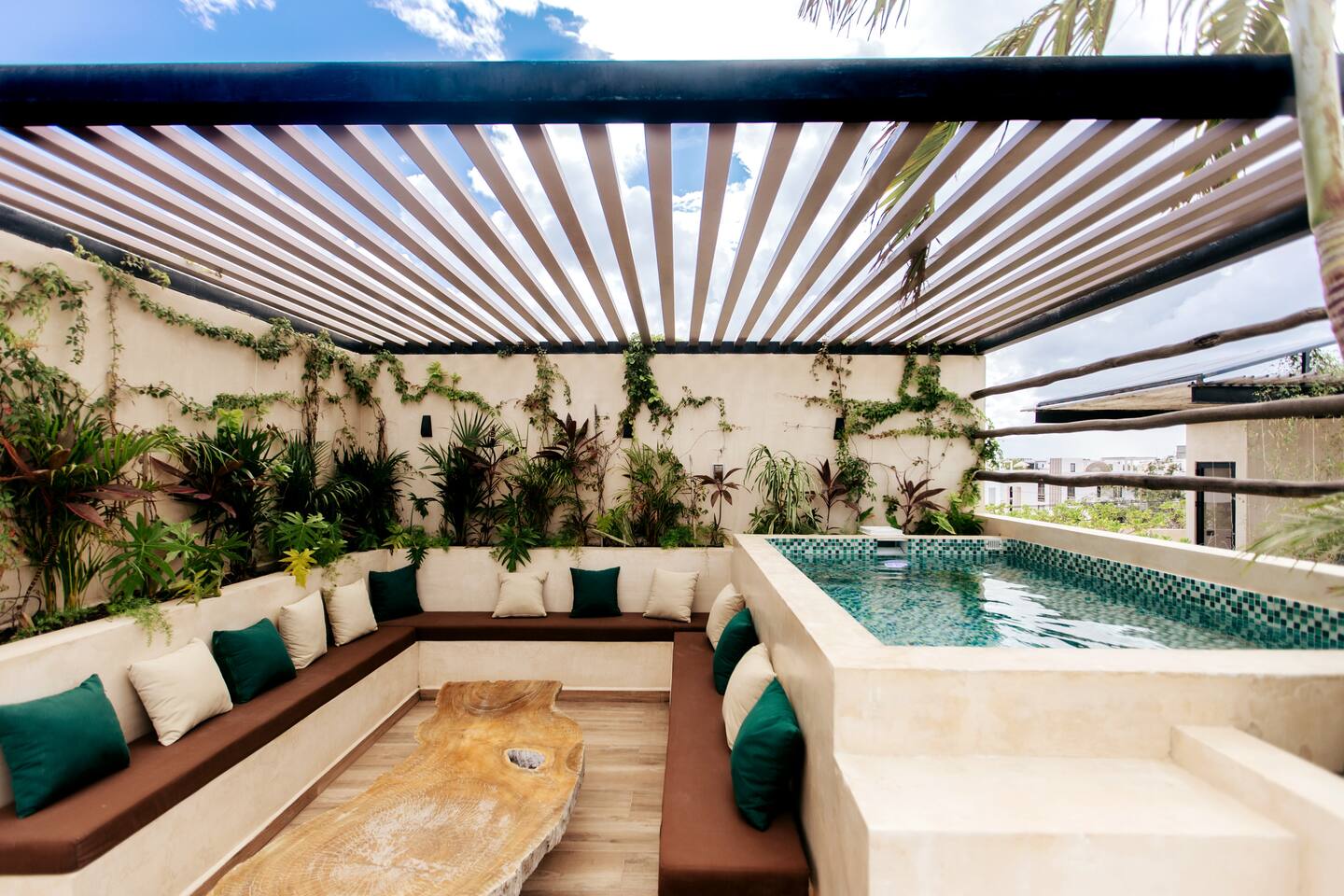Experience a sense of calm when you arrive at Dune. Perfectly tucked away within a quiet oasis you'll be able to relax in Tulum's jungle setting. The main level pool and lounge deck are very serene, especially at night with the warm lighting and tropical trees and plants surrounding the area. The suite is a spacious modern build with lots of natural light and high end finishes. The kitchen is fully equipped with high end appliances such as refrigerator, electric stovetop, toaster oven, blender, and coffee machine. Lots of cookware, plates and utensils. Kitchen island with seating as well as a 4-person dining table. The living room has a super comfortable sectional couch, with a SMART TV and applications like Netflix and Youtube. A great place to relax day or night. The bedroom is beautifully designed for optimal relaxation. High end mattress with hotel quality linens and pillows and black out curtains. The bed also has beautiful drapery surrounding it, creating a luxurious feeling as you sleep. The bedroom also has a west facing balcony attached, where you can see some beautiful colours in the sky as the sun sets. Additionally, the bedroom has an ensuite bathroom with double sinks, a rain shower head and beautiful mosaic shower. Perhaps the best feature of this suite is the completely private rooftop lounge and pool. This space is optimal for sun-bathing as it has completely unobstructed sun exposure. There's also plenty of seating and lounge chairs and the elevated plunge pool is perfect for staying cool in the Mexico sun! 2 free bikes are included with your reservation and a free ATV* Your reservation also includes a full service concierge that can assist you with airport transportation, private chef services, massage and wellness services, tours and excursions, ATVs and scooter rentals, beach club reservations, and much more. *ATV is available for free from April to November. Please request the ATV PRIOR to completing your reservation.