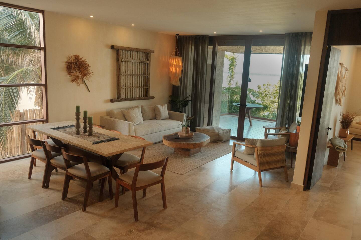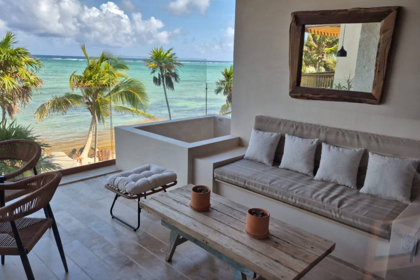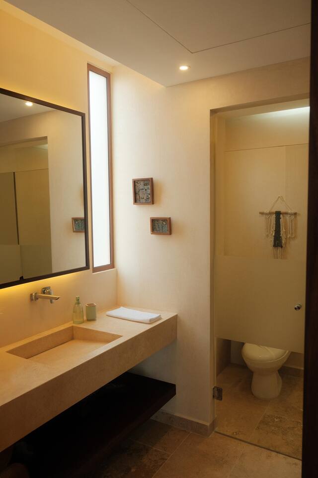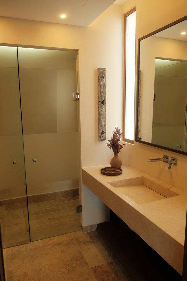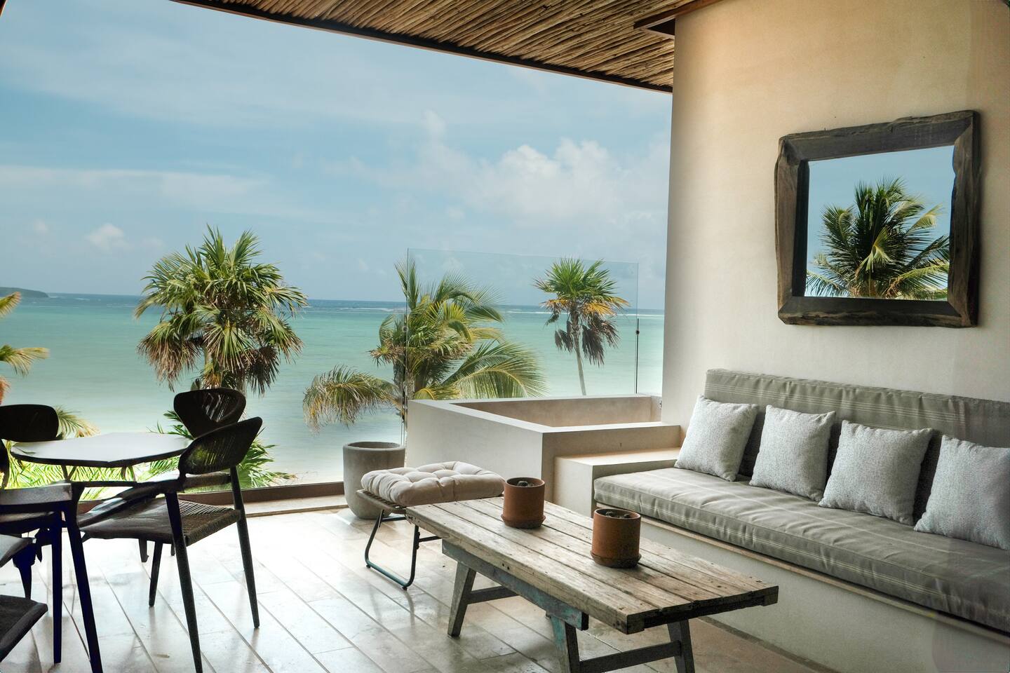 The 3 bedroom luxury condo is a modern build with natural light and high end finishes, high speed wifi, cold and hot water, and AC. The kitchen is fully equipped with high end appliances such as refrigerator, microwave, electric stovetop, blender, and coffee maker. Full dining space with a large dining table for 6. The living room has a comfortable sofa and seating area, with a SMART TV and applications like Netflix and Youtube. A great place to relax day or night. With views of the ocean from the living room, open up the balcony door and enjoy indoor/outdoor space. The large balcony has a seating area and a private plunge pool to enjoy. The bedrooms are designed for optimal relaxation. King size beds in two bedrooms and 2 Queen beds in one bedroom with incredibly comfortable mattresses and plush hotel quality linens, and lots of closet space. Ensuite bathrooms in all bedrooms with glass shower and lots of counter space. The highlight of this condo is the stunning ocean view. The gorgeous private balcony with outdoor seating and a lounge space and enough space to do yoga or meditations. Listen to the sound of the ocean in the mornings and evenings, a truly magical place to spent time. The condo also comes equipped with plenty of storage space, central air conditioning, and full floor to ceiling windows to give you the perfect view of the ocean. The building amenities include: • Gorgeous rooftop lounge with overlooking the jungle and views of the ocean and you can see the flamingos flying by each day. Comes with an outdoor dining space, outdoor kitchen, pizza oven, and rooftop pool •Gym and yoga terrace •Private beachfront •Oceanfront pool •Kayaks available to take out during your stay Your reservation also includes: a full service concierge that can assist you with airport transportation, private chef services, massage and wellness services, tours and excursions, ATVs and scooter rentals, beach club reservations, and much more.