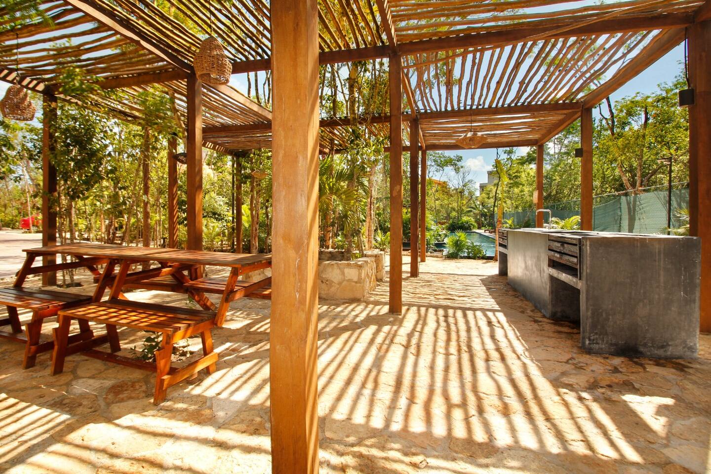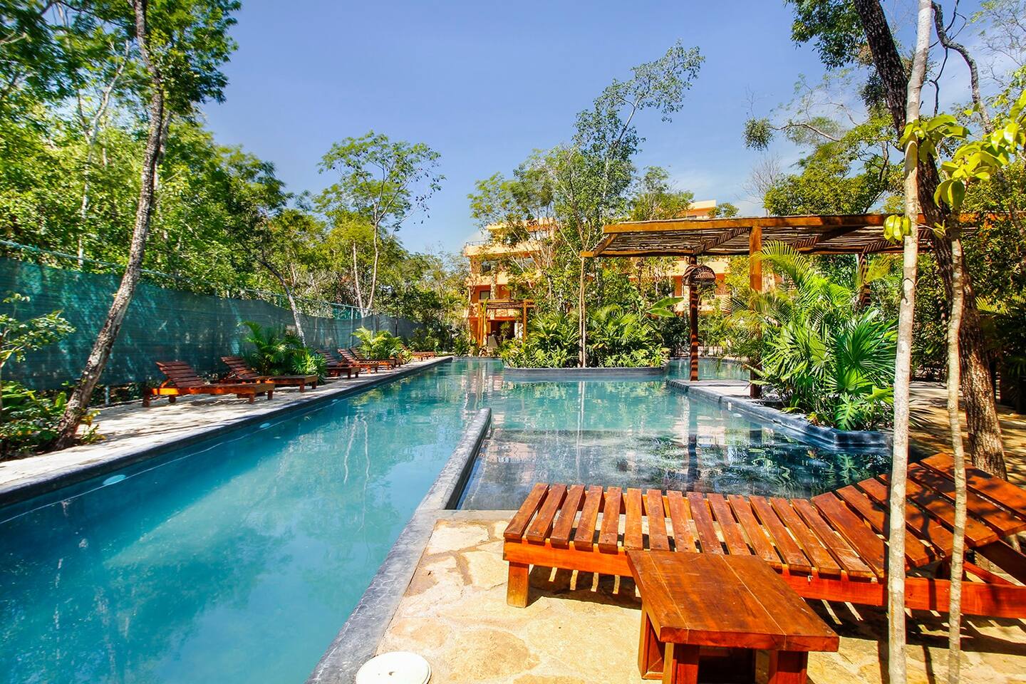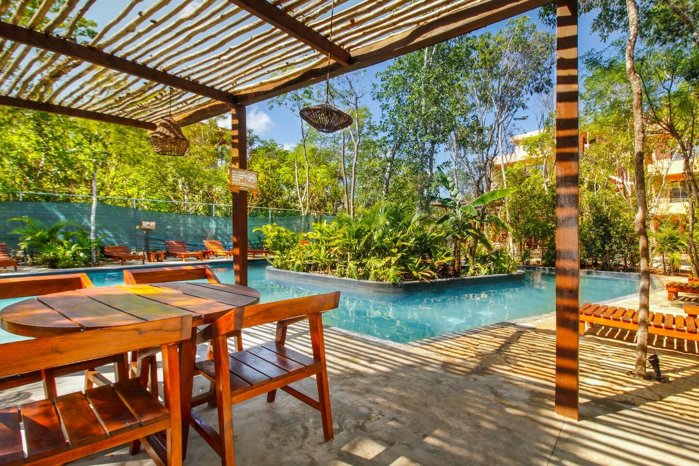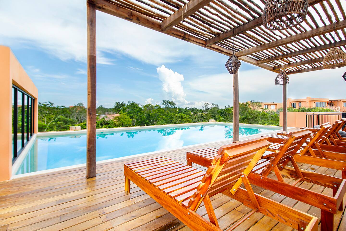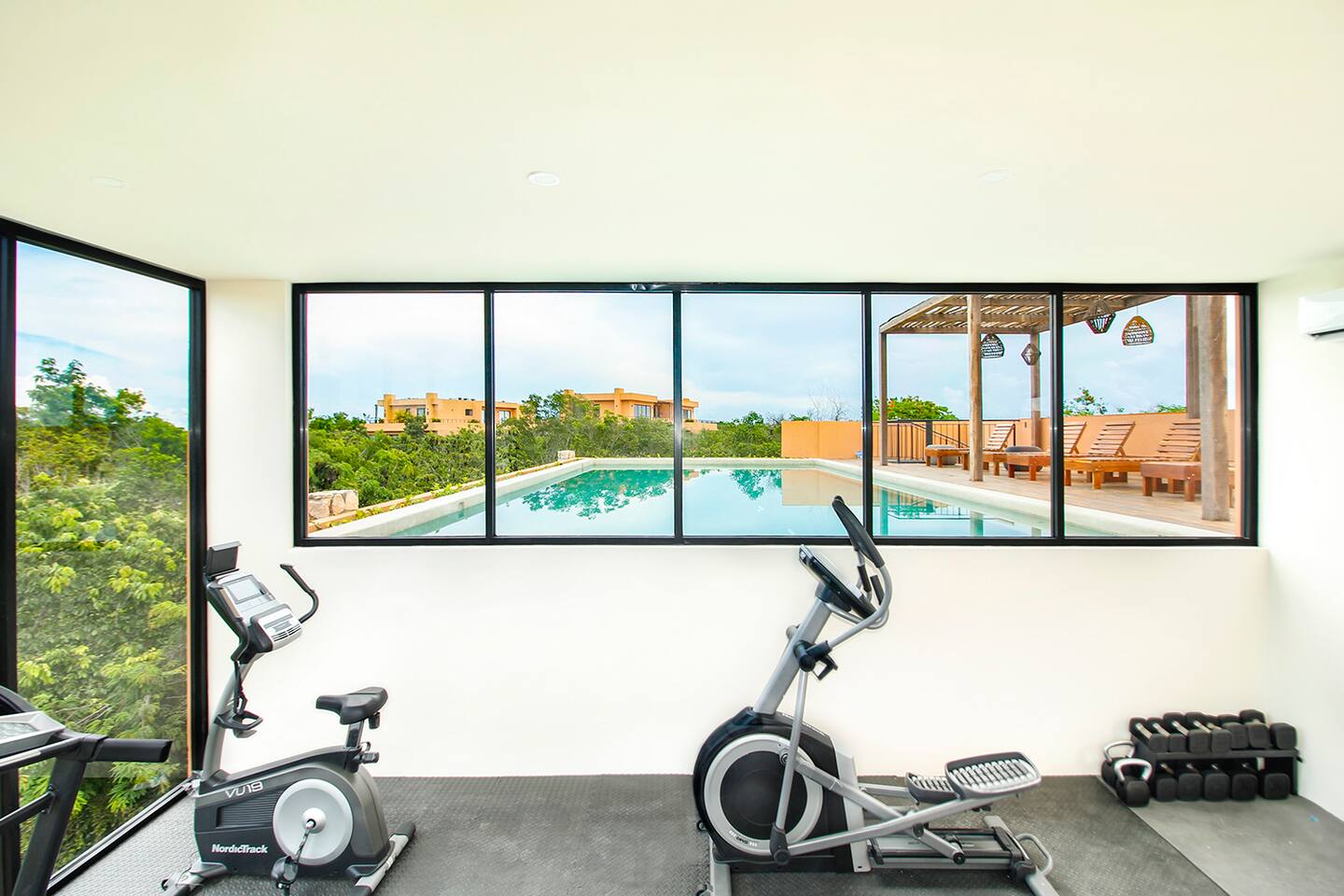 Nestled in a serene, private neighborhood surrounded by lush jungle, this charming home offers the perfect escape for those seeking tranquility and comfort. With ample outdoor space including a ground floor rear terrace with an outdoor dining table, and double terraces leading out from the upstairs master bedroom with outdoor seating, it's ideal for enjoying the natural beauty of the area. Inside, every room is equipped with air conditioning and high-speed Wi-Fi for your convenience. Each of the three bedrooms features plush mattresses, premium pillows, and hotel-quality linens as well as carefully curated decor. The master bedroom on the second floor boasts a luxurious king-size bed, two terraces, an ensuite bathroom and lots of closet space. The two bedrooms on the ground level are furnished with comfortable queen-sized beds and plenty of closet space. Towels, including both bath and pool towels, are provided throughout your stay. The open-concept living and dining area on the ground level is perfect for entertaining or relaxing with loved ones. The fully equipped kitchen, complete with a gas range, allows for easy meal preparation, while the large dining tables, both inside and outside, are great for family meals. The spacious living room features a comfortable sectional sofa and a flat-screen smart TV with streaming services like Netflix and YouTube for your entertainment. The highlight of this home is the amazing amenities within the complex including two gyms, two pools (one kid friendly, one adults only), co-working space, outdoor kitchen and BBQ area, hammock area, dog park, childrens park, guest parking, and 24 hour security. This home combines modern comfort with a peaceful jungle retreat, offering the perfect blend of relaxation and luxury. Your reservation also includes a full service concierge that can assist you with airport transportation, private chef services, massage and wellness services, tours and excursions, ATVs and scooter rentals, beach club reservations, and much more. We look forward to hosting you and providing an unforgettable stay in Tulum!