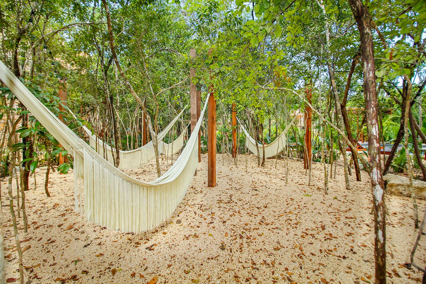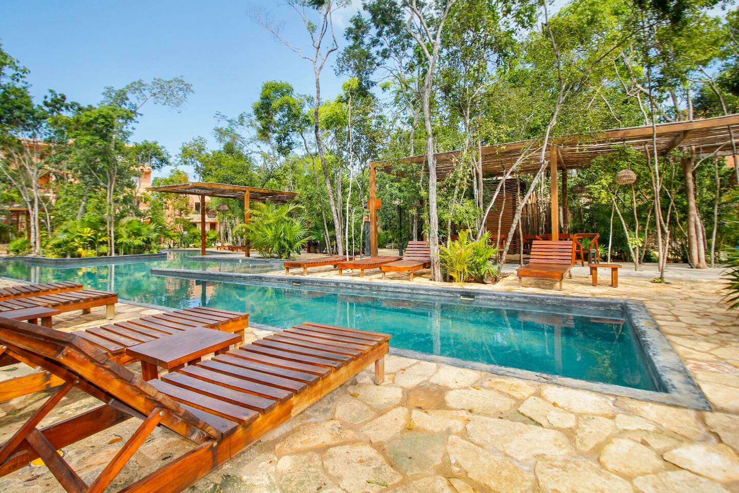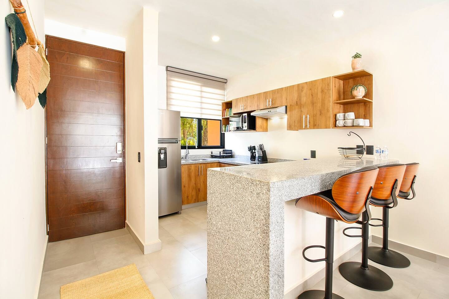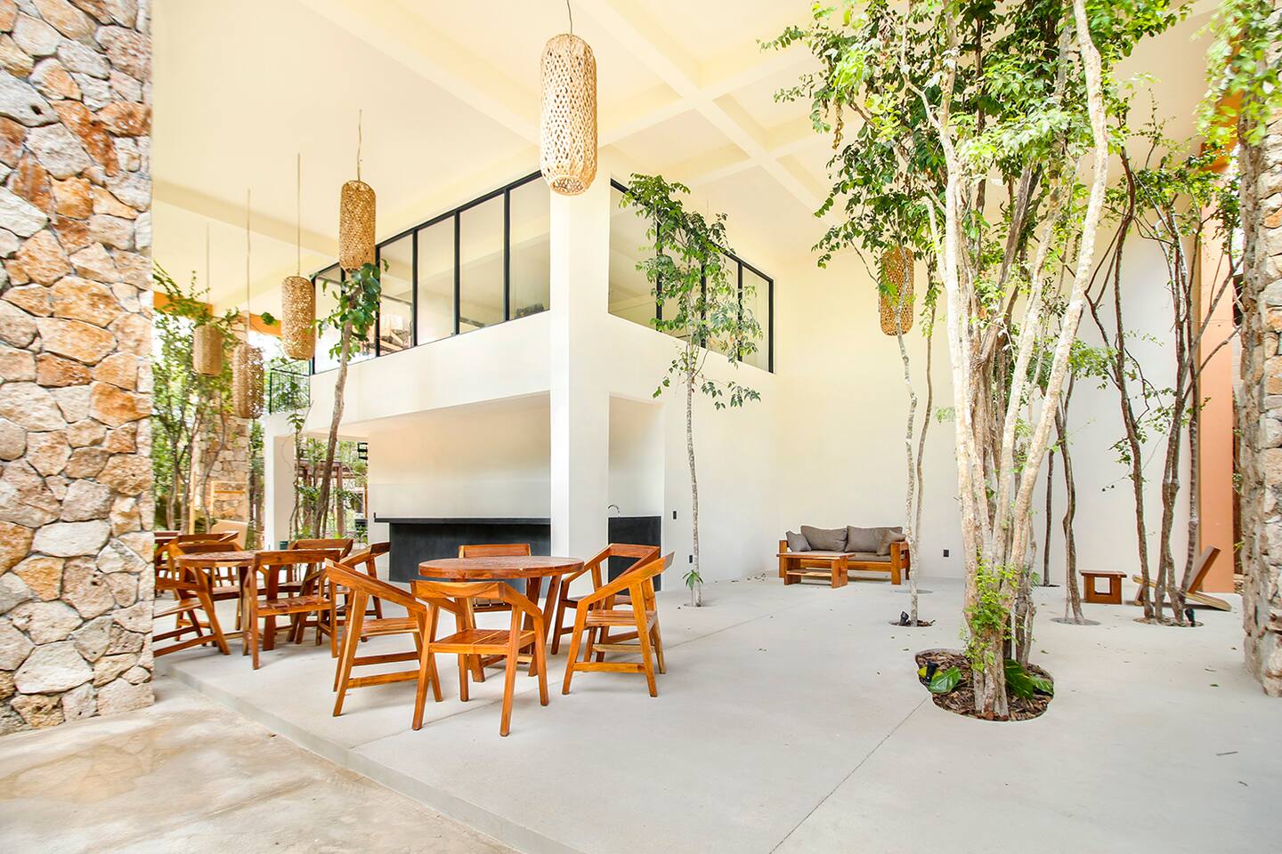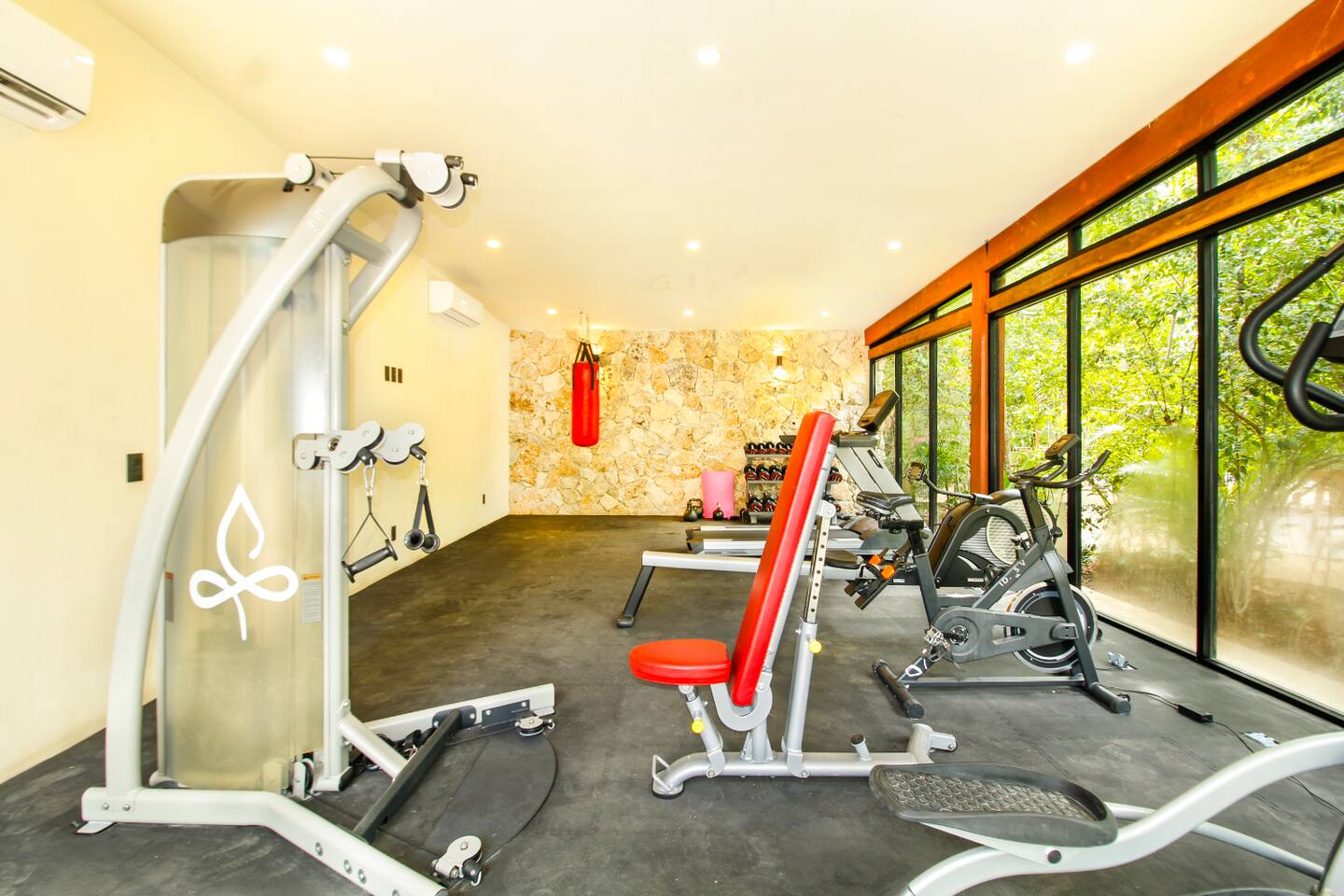 Nestled in a serene, private neighborhood surrounded by lush jungle, this charming home offers the perfect escape for those seeking tranquility and comfort. With ample outdoor space including a ground floor rear terrace with an outdoor dining table, and double terraces leading out from the upstairs master bedroom with outdoor seating, it's ideal for enjoying the natural beauty of the area. Inside, every room is equipped with air conditioning and high-speed Wi-Fi for your convenience. Each of the three bedrooms features plush mattresses, premium pillows, and hotel-quality linens as well as carefully curated decor. The master bedroom on the second floor boasts a luxurious king-size bed, two terraces, an ensuite bathroom and lots of closet space. The two bedrooms on the ground level are furnished with comfortable queen-sized beds and plenty of closet space. Towels, including both bath and pool towels, are provided throughout your stay. The open-concept living and dining area on the ground level is perfect for entertaining or relaxing with loved ones. The fully equipped kitchen, complete with a gas range, allows for easy meal preparation, while the large dining tables, both inside and outside, are great for family meals. The spacious living room features a comfortable sectional sofa and a flat-screen smart TV with streaming services like Netflix and YouTube for your entertainment. The highlight of this home is the amazing amenities within the complex including two gyms, two pools (one kid friendly, one adults only), co-working space, outdoor kitchen and BBQ area, hammock area, dog park, childrens park, guest parking, and 24 hour security. This home combines modern comfort with a peaceful jungle retreat, offering the perfect blend of relaxation and luxury. Your reservation also includes a full service concierge that can assist you with airport transportation, private chef services, massage and wellness services, tours and excursions, ATVs and scooter rentals, beach club reservations, and much more. We look forward to hosting you and providing an unforgettable stay in Tulum!