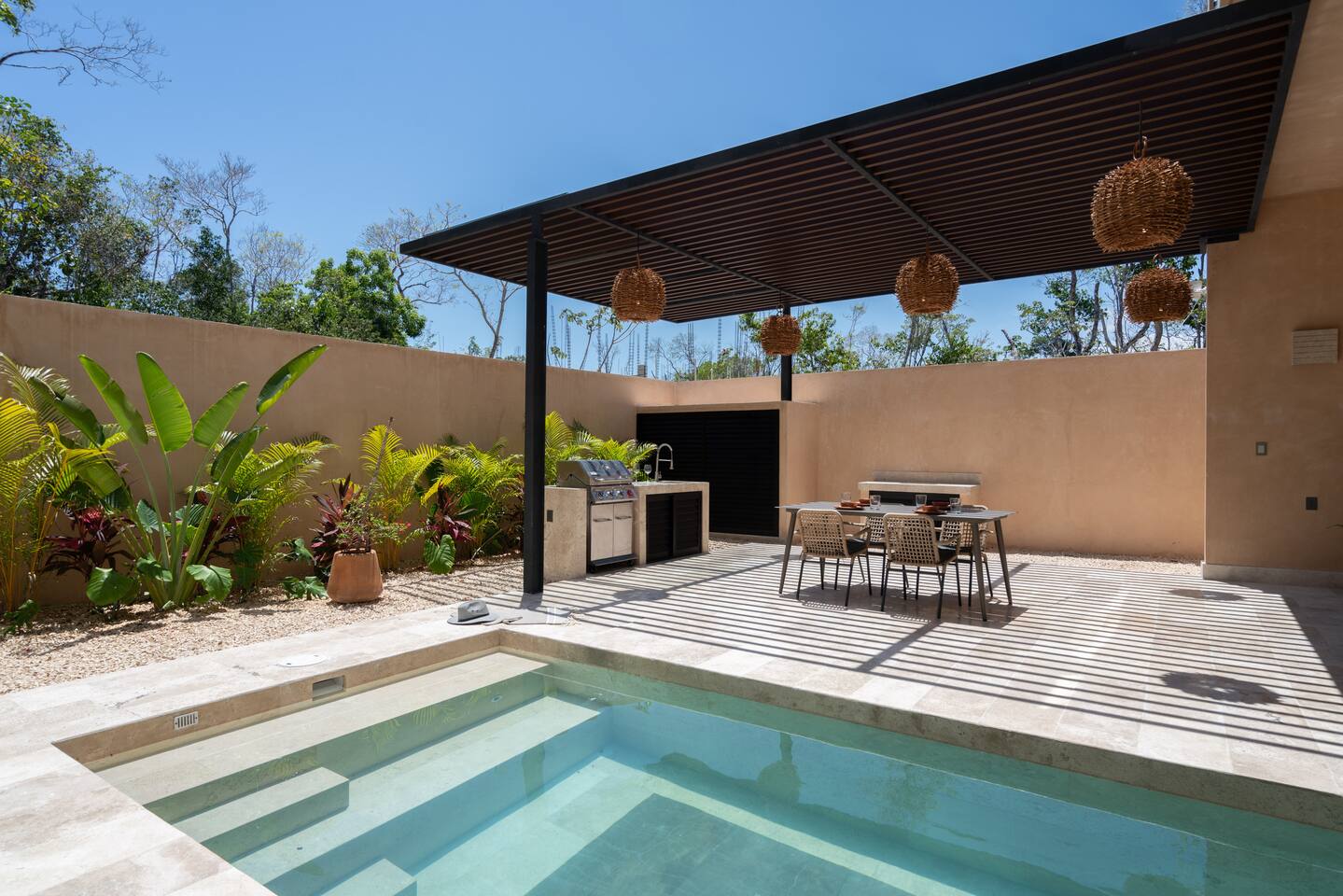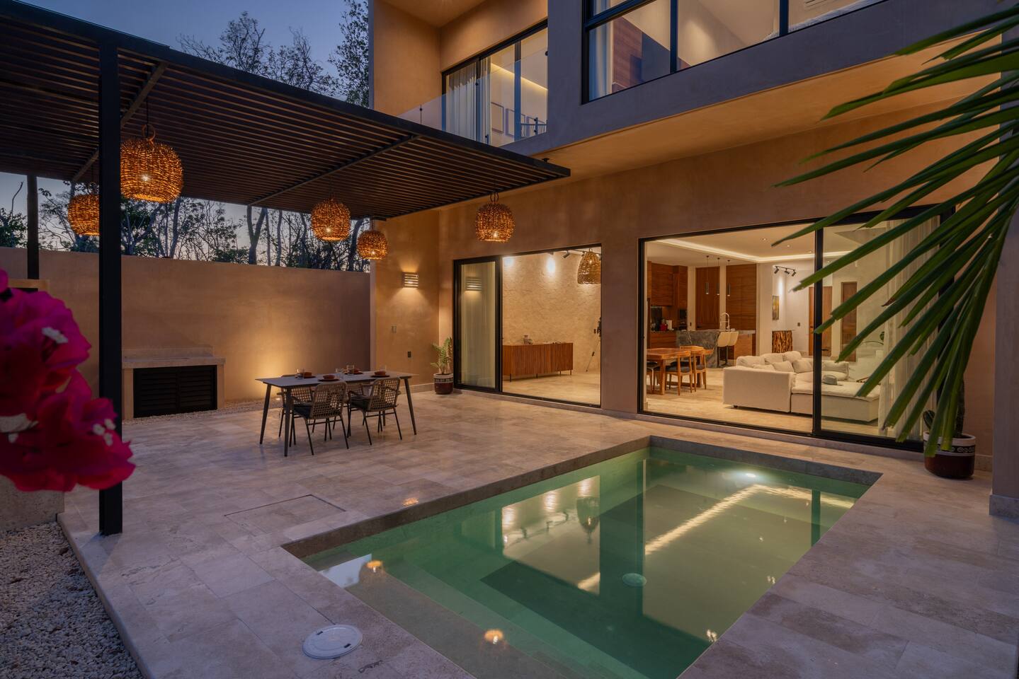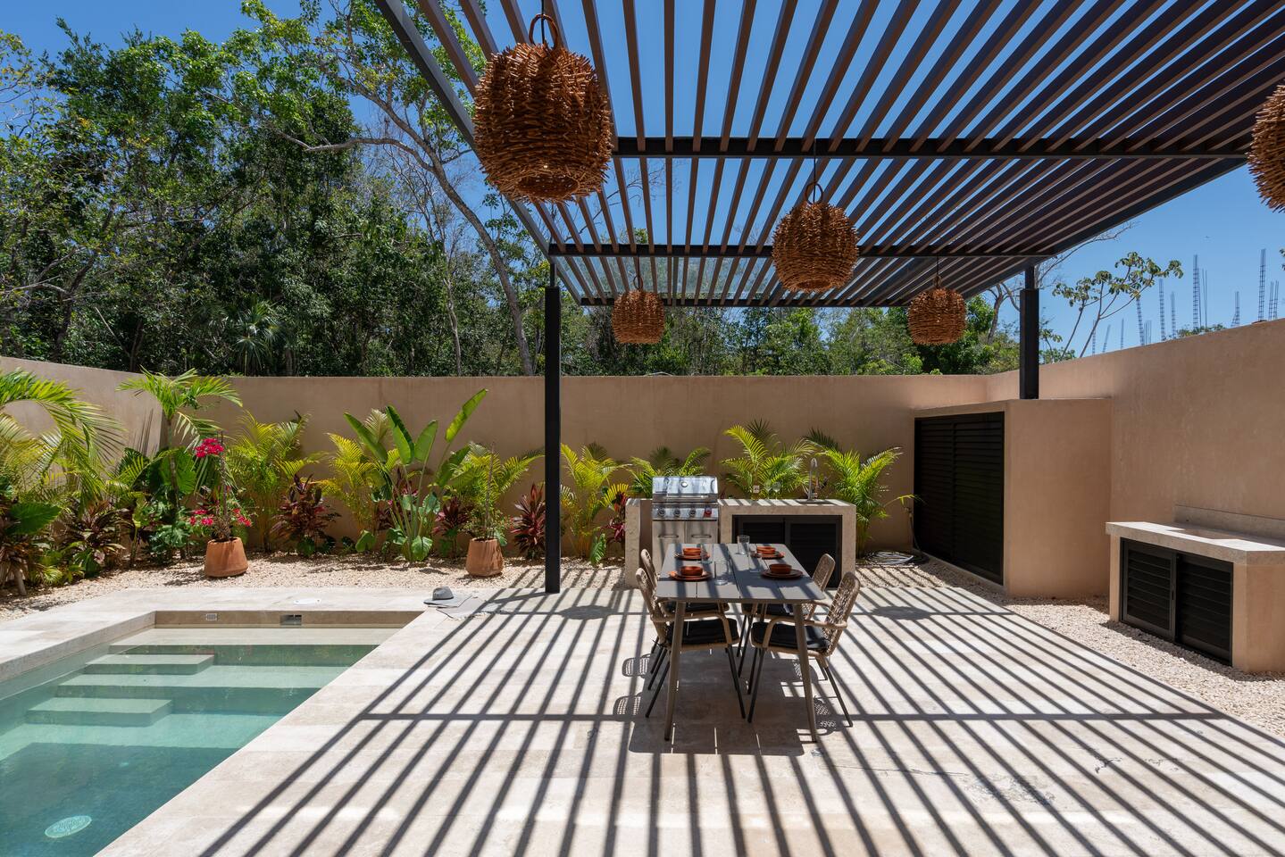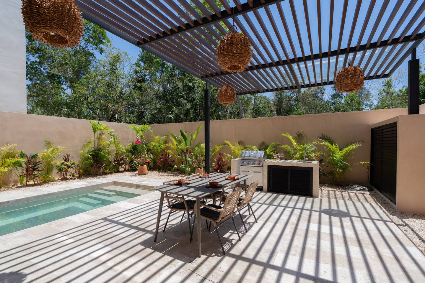 Luxurious private oasis, a hidden gem nestled in the heart of Tulum within the exclusive gated community of Kaybé. This stunning four-bedroom, two-story home blends modern sophistication with the beauty of the surrounding jungle, creating the perfect retreat for a relaxing and unforgettable stay. As you step inside, you’re welcomed by a bright and spacious open-concept living area designed with contemporary elegance and comfort in mind. Large windows allow natural light to flood the home, creating a seamless connection between the indoor living space and the lush outdoor surroundings. The massive fully equipped kitchen is a true highlight of the home, featuring high-end appliances, expansive countertops, and plenty of space for cooking, entertaining, and gathering with family and friends. Just steps away, the dining and living areas flow effortlessly together, making the entire home feel open, airy, and inviting. Each of the four bedrooms is thoughtfully designed for comfort and privacy, with plush bedding, generous storage, and beautifully designed bathrooms. The home also includes a private gym, allowing you to keep up with your fitness routine without ever leaving the property. Step outside to your private backyard oasis. Surrounded by tropical greenery, you’ll find a beautiful pool, outdoor dining area, and BBQ — the perfect setting for relaxing afternoons, sunbathing, or enjoying meals under the stars. This home also offers private parking for two vehicles and is located within the prestigious Kaybé gated community, which provides 24-hour security with a QR code access system for peace of mind. Guests also enjoy access to Kaybé’s exceptional common amenities, including a massive resort-style pool, jacuzzi, sauna, clubhouse, pool lounge, fully equipped gym, paddle courts, children’s play area, and a relaxing spa. The community is surrounded by scenic jungle paths that are perfect for biking or peaceful walks through nature. This home is more than just a place to stay, it’s a private sanctuary where luxury, comfort, and nature come together to create an unforgettable Tulum experience. 🌴✨