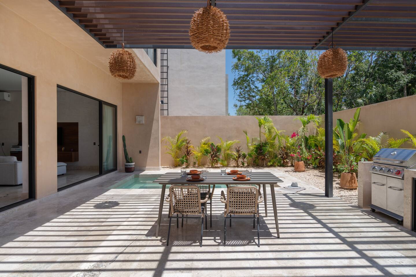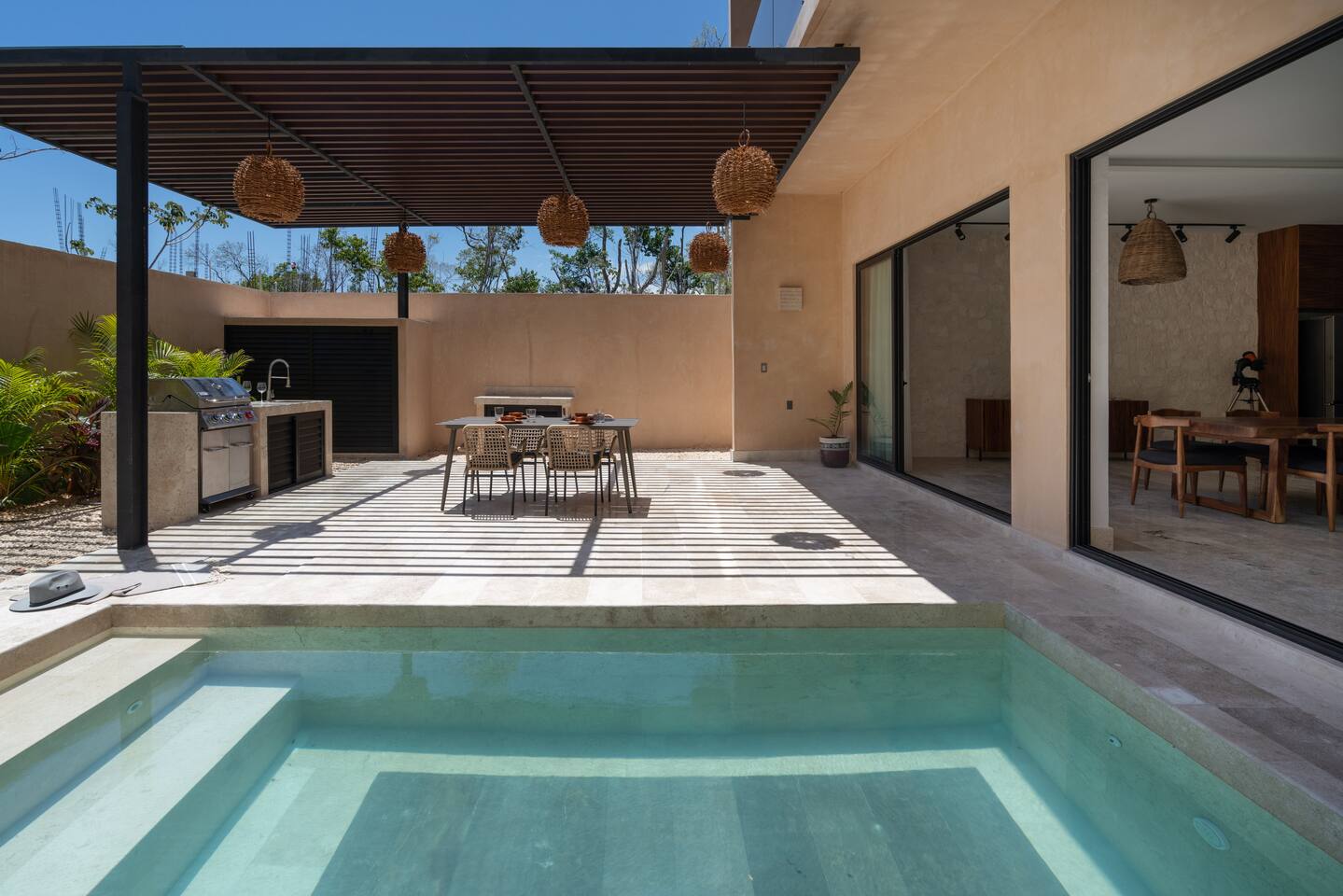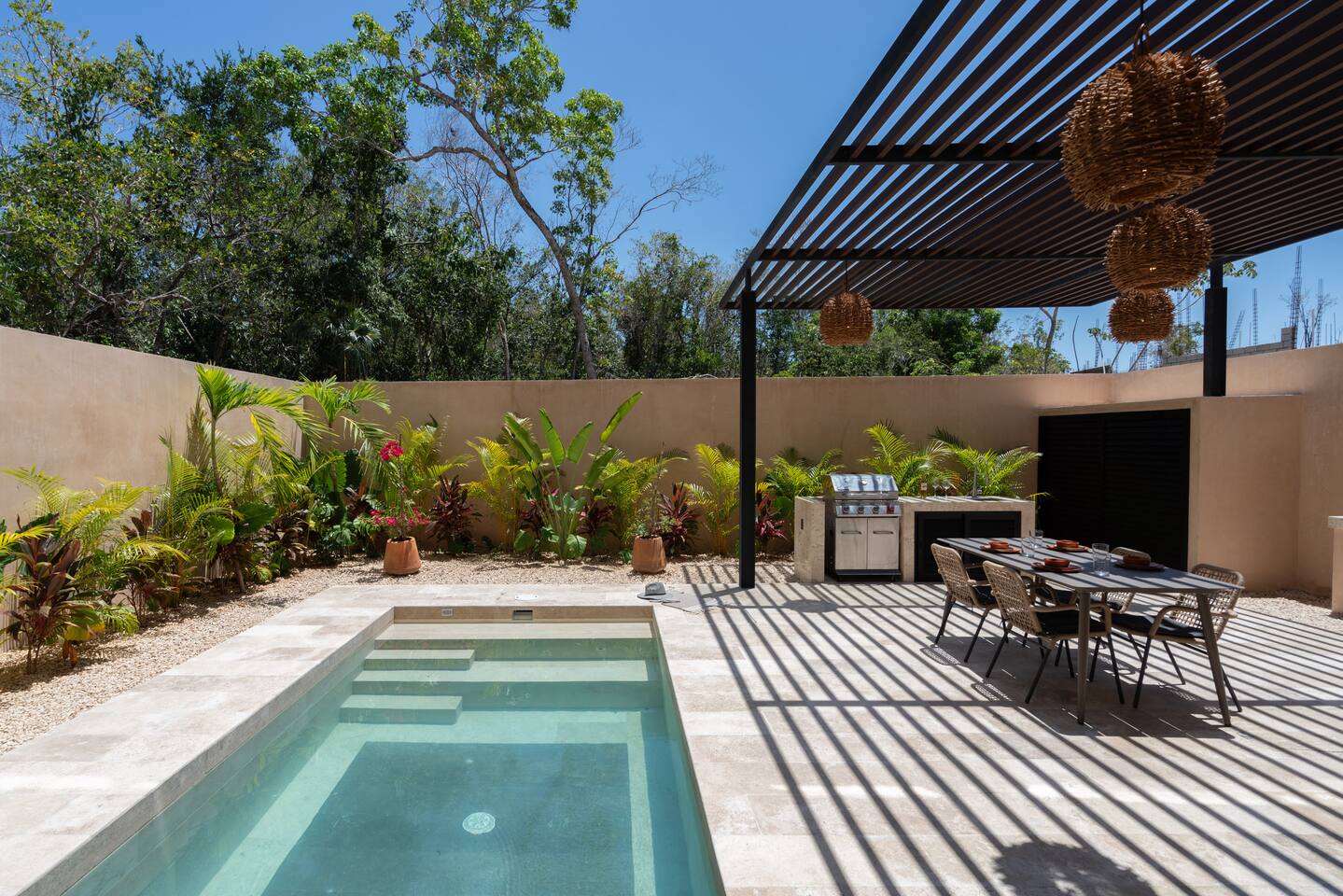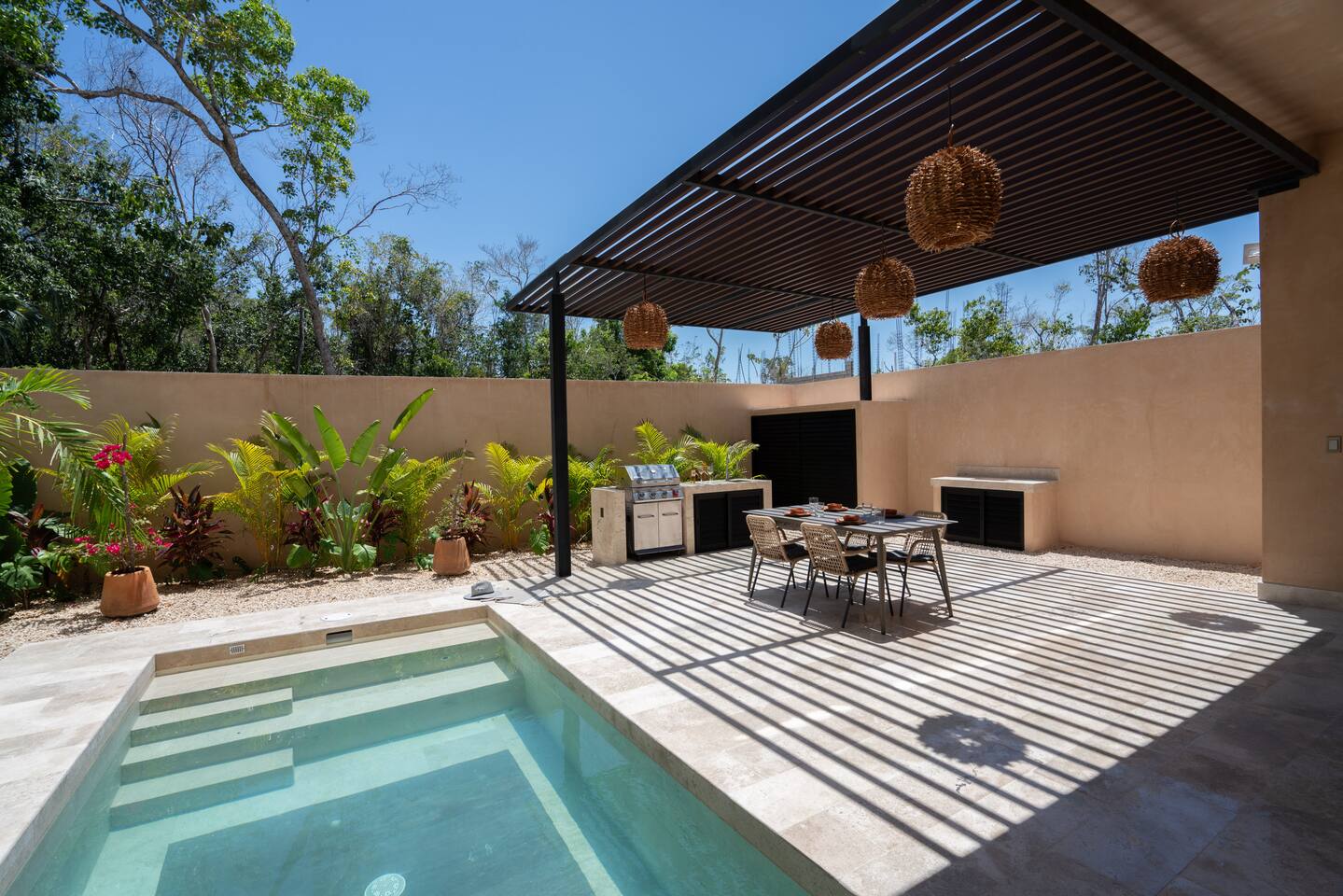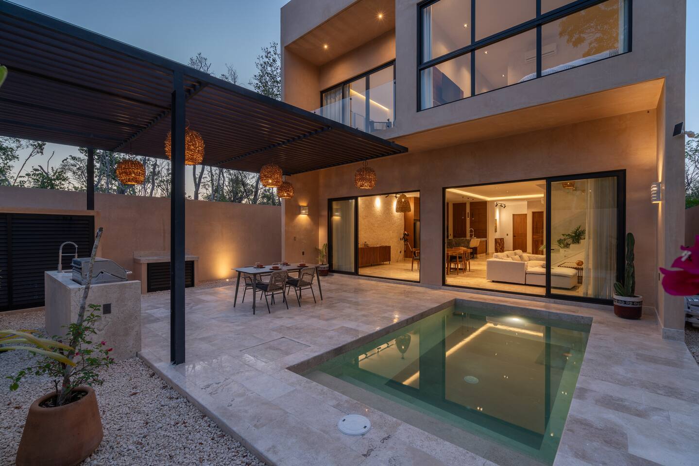 Luxurious private oasis, a hidden gem nestled in the heart of Tulum within the exclusive gated community of Kaybé. This stunning four-bedroom, two-story home blends modern sophistication with the beauty of the surrounding jungle, creating the perfect retreat for a relaxing and unforgettable stay. As you step inside, you’re welcomed by a bright and spacious open-concept living area designed with contemporary elegance and comfort in mind. Large windows allow natural light to flood the home, creating a seamless connection between the indoor living space and the lush outdoor surroundings. The massive fully equipped kitchen is a true highlight of the home, featuring high-end appliances, expansive countertops, and plenty of space for cooking, entertaining, and gathering with family and friends. Just steps away, the dining and living areas flow effortlessly together, making the entire home feel open, airy, and inviting. Each of the four bedrooms is thoughtfully designed for comfort and privacy, with plush bedding, generous storage, and beautifully designed bathrooms. The home also includes a private gym, allowing you to keep up with your fitness routine without ever leaving the property. Step outside to your private backyard oasis. Surrounded by tropical greenery, you’ll find a beautiful pool, outdoor dining area, and BBQ — the perfect setting for relaxing afternoons, sunbathing, or enjoying meals under the stars. This home also offers private parking for two vehicles and is located within the prestigious Kaybé gated community, which provides 24-hour security with a QR code access system for peace of mind. Guests also enjoy access to Kaybé’s exceptional common amenities, including a massive resort-style pool, jacuzzi, sauna, clubhouse, pool lounge, fully equipped gym, paddle courts, children’s play area, and a relaxing spa. The community is surrounded by scenic jungle paths that are perfect for biking or peaceful walks through nature. This home is more than just a place to stay, it’s a private sanctuary where luxury, comfort, and nature come together to create an unforgettable Tulum experience. 🌴✨