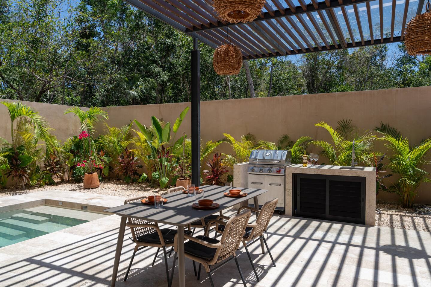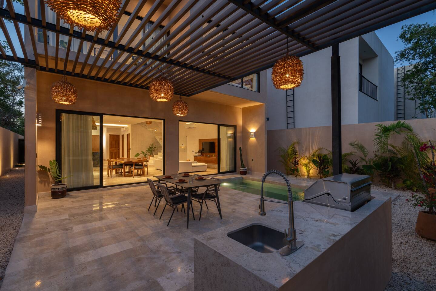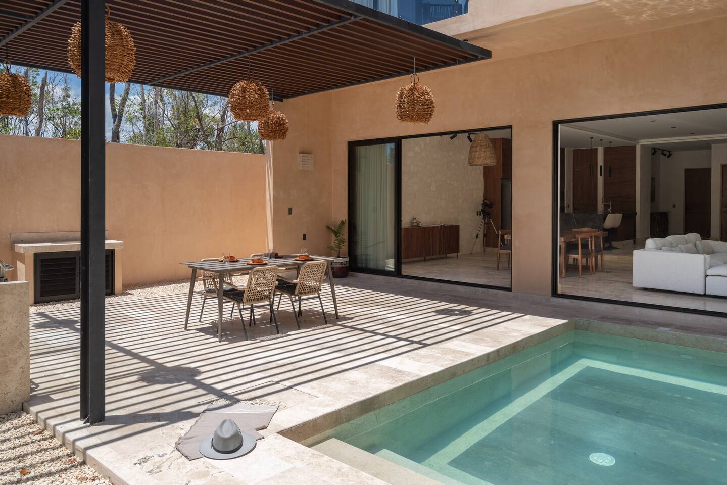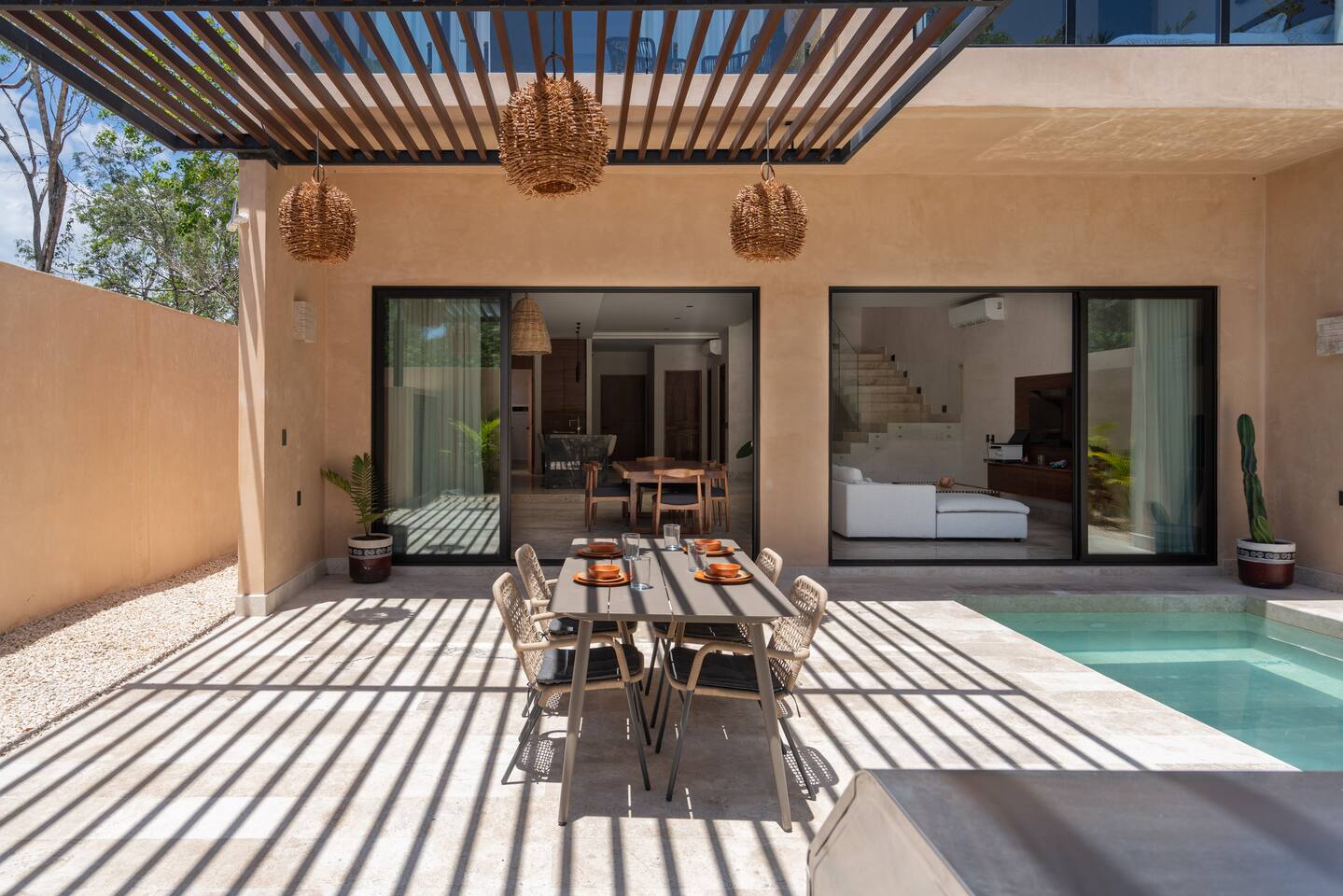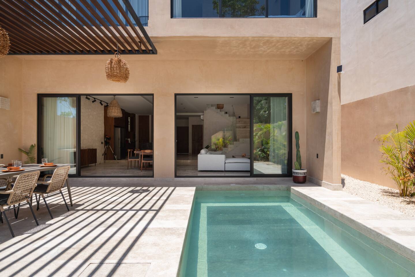Luxurious private oasis, a hidden gem nestled in the heart of Tulum within the exclusive gated community of Kaybé. This stunning four-bedroom, two-story home blends modern sophistication with the beauty of the surrounding jungle, creating the perfect retreat for a relaxing and unforgettable stay. As you step inside, you’re welcomed by a bright and spacious open-concept living area designed with contemporary elegance and comfort in mind. Large windows allow natural light to flood the home, creating a seamless connection between the indoor living space and the lush outdoor surroundings. The massive fully equipped kitchen is a true highlight of the home, featuring high-end appliances, expansive countertops, and plenty of space for cooking, entertaining, and gathering with family and friends. Just steps away, the dining and living areas flow effortlessly together, making the entire home feel open, airy, and inviting. Each of the four bedrooms is thoughtfully designed for comfort and privacy, with plush bedding, generous storage, and beautifully designed bathrooms. The home also includes a private gym, allowing you to keep up with your fitness routine without ever leaving the property. Step outside to your private backyard oasis. Surrounded by tropical greenery, you’ll find a beautiful pool, outdoor dining area, and BBQ — the perfect setting for relaxing afternoons, sunbathing, or enjoying meals under the stars. This home also offers private parking for two vehicles and is located within the prestigious Kaybé gated community, which provides 24-hour security with a QR code access system for peace of mind. Guests also enjoy access to Kaybé’s exceptional common amenities, including a massive resort-style pool, jacuzzi, sauna, clubhouse, pool lounge, fully equipped gym, paddle courts, children’s play area, and a relaxing spa. The community is surrounded by scenic jungle paths that are perfect for biking or peaceful walks through nature. This home is more than just a place to stay, it’s a private sanctuary where luxury, comfort, and nature come together to create an unforgettable Tulum experience. 🌴✨