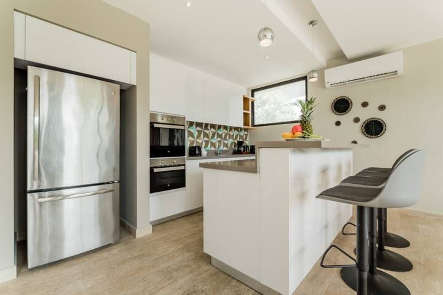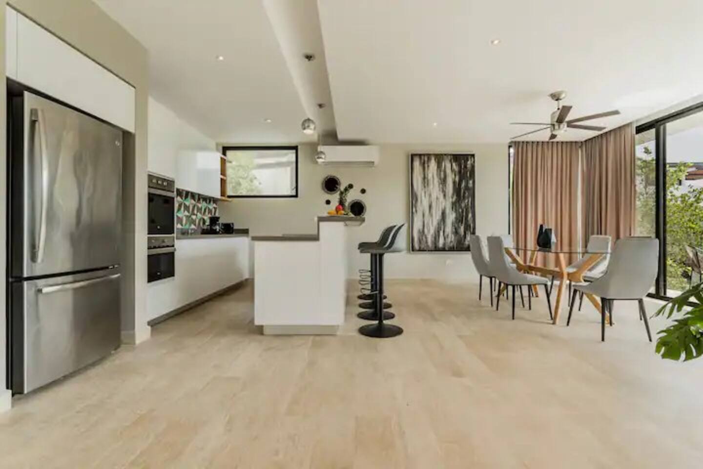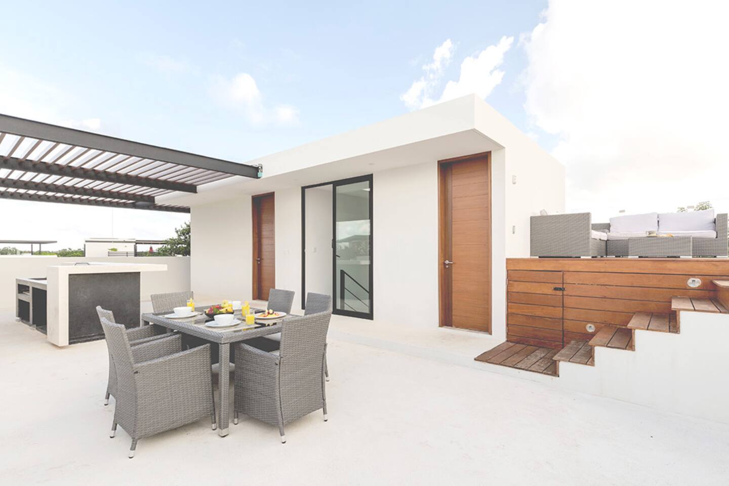 Perfectly situated in Tulum's jungle neighbourhood of La Veleta, you'll get to experience local culture while having the security of a private residence. When you first arrive, you'll be greeted by reception and experience the luxury atmosphere of the pool and garden areas. The condo is a spacious two storey build with lots of natural light and high end finishes, high-speed wifi, and hot and cold water. The kitchen is fully equipped with high end appliances such as refrigerator, electric stovetop, high end toaster oven, blender, and coffee maker. Lots of cookware, plates and utensils. The living room has lots of comfortable seating, with a SMART TV and applications like Netflix and Youtube. A great place to relax day or night. Open the sliding doors to the balcony for a great indoor/outdoor living space. The bedrooms are designed for optimal relaxation. Two bedrooms are located on the first floor of the condo, the master has an ensuite bathroom. Room darkening curtains and plenty of closet space. The third bedroom is located on the second floor of the condo and walks out to the private rooftop terrace for a very tropical feel. There is a bathroom as well on the terrace (not an en-suite). All bedrooms are very spacious with King beds and hotel quality linens. The highlight of this suite is the completely private rooftop terrace with private pool, tons of tanning space and lounge chairs, outdoor bar, and charcoal grill. The master bedroom of the suite is located on the second floor and walks out to the terrace for a very tropical vacation feel. Your reservation also includes a full service concierge that can assist you with airport transportation, private chef services, massage and wellness services, tours and excursions, ATVs and scooter rentals, beach club reservations, and much more.