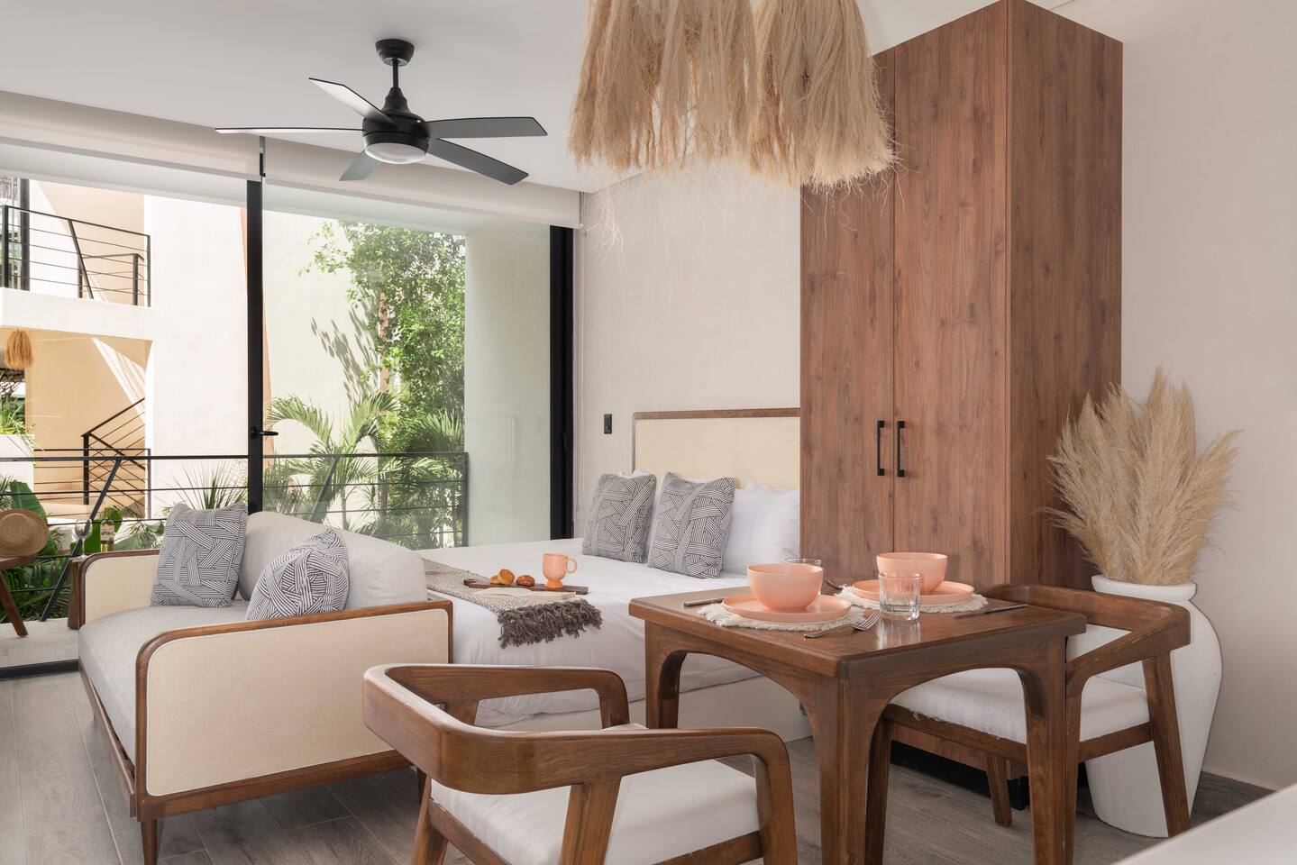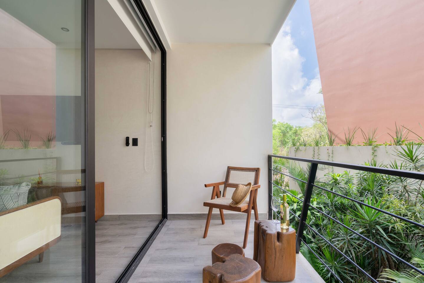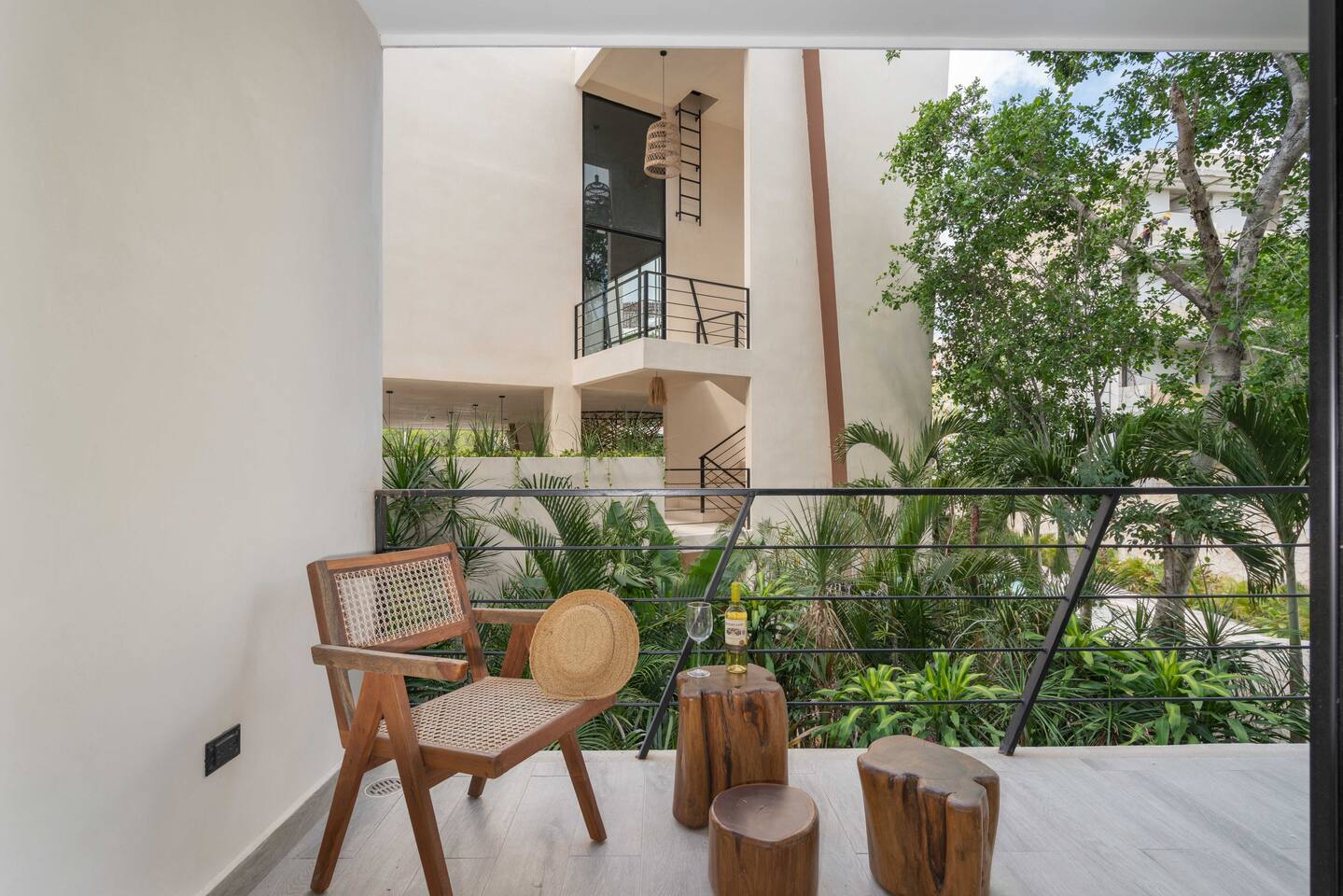 As you enter the suite, you'll be greeted with a modern and stylish interior design that perfectly blends with the natural surroundings of Tulum. The space features an open-concept layout with a comfortable king-sized bed, a cozy seating space with a sofa, and a dining table for two. The highlight of this suite is the large balcony that overlooks the lush greenery within the courtyard. You can sit back, relax, and enjoy your morning coffee or a refreshing drink in the evening while taking in the atmosphere. This suite is located in a newer location called Region 15, just a few minutes away from Tulum's vibrant downtown and the world-renowned Tulum ruins and Sian Ka'an Archeological zone. The beach is just a short drive away, where you can enjoy the crystal clear waters of the Caribbean Sea and the soft white sand beaches. Your reservation also includes a full service concierge that can assist you with airport transportation, private chef services, massage and wellness services, tours and excursions, ATVs and scooter rentals, beach club reservations, and much more. Whether you're looking for a romantic getaway, a solo adventure, or a fun-filled vacation with friends, our suite in Tulum is the perfect choice for your next escape. Come and experience the beauty and magic of Tulum!