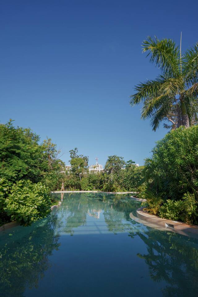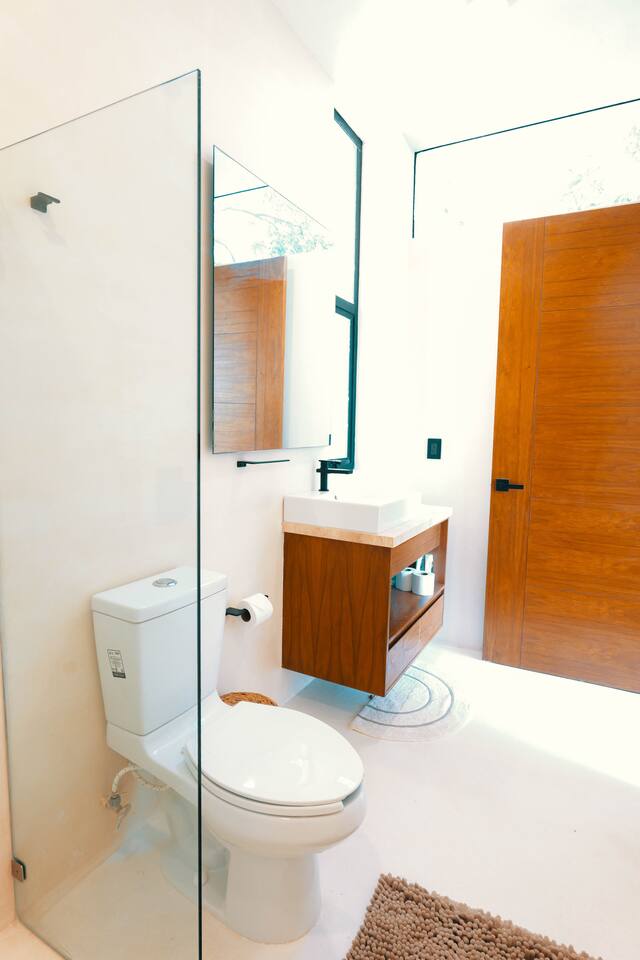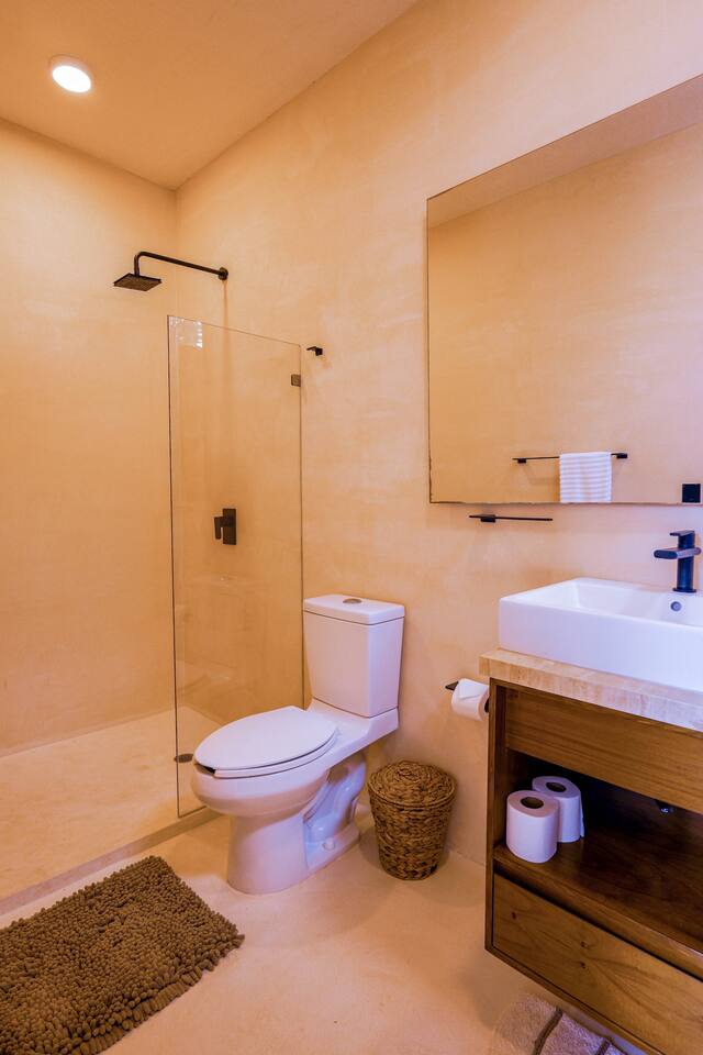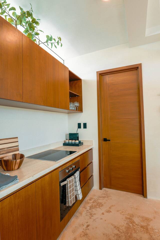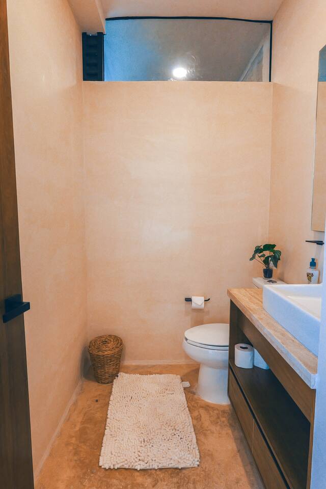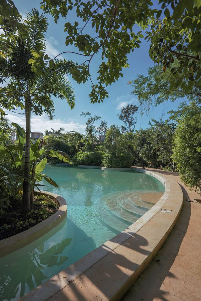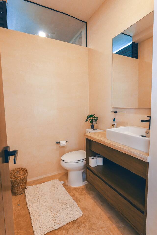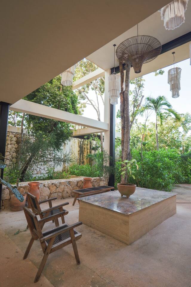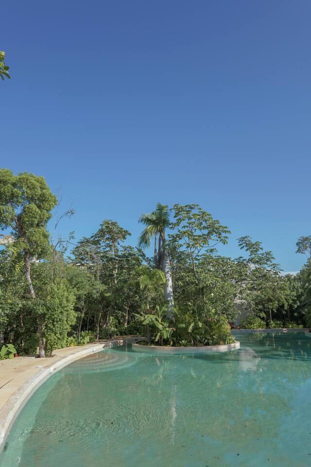 Nestled in a quiet neighborhood surrounded by lush jungle, this charming condo offers the perfect escape for those seeking tranquility and comfort. The rooms are equipped with air conditioning and high-speed Wi-Fi for your convenience. The bedroom features a plush mattress, premium pillows, and hotel-quality linens, lots of closet space, as well as carefully curated decor. The bedroom has a King bed and ensuite bathroom. Towels, including both bath and pool towels, are provided throughout your stay. The open-concept living and dining area is perfect for entertaining or relaxing with loved ones. The fully equipped kitchen, complete with a full oven allows for easy meal preparation, while the dining table is great for family meals. The spacious living room features a comfortable sofa and a flat-screen smart TV with streaming services like Netflix and YouTube for your entertainment. The large terrace opens up from the living room with floor to ceiling sliding glass doors to create a beautiful indoor/outdoor atmosphere to enjoy. The building also comes with amazing amenities within the complex including a jungle gym, a massive pool, co-working/multi-use space, and children's park, guest parking, and 24 hour security. This home combines modern comfort with a peaceful jungle retreat, offering the perfect blend of relaxation and luxury. Your reservation also includes a full service concierge that can assist you with airport transportation, private chef services, massage and wellness services, tours and excursions, ATVs and scooter rentals, beach club reservations, and much more. We look forward to hosting you and providing an unforgettable stay in Tulum!