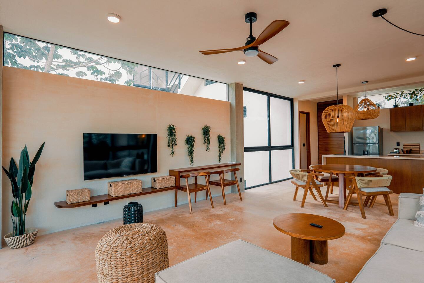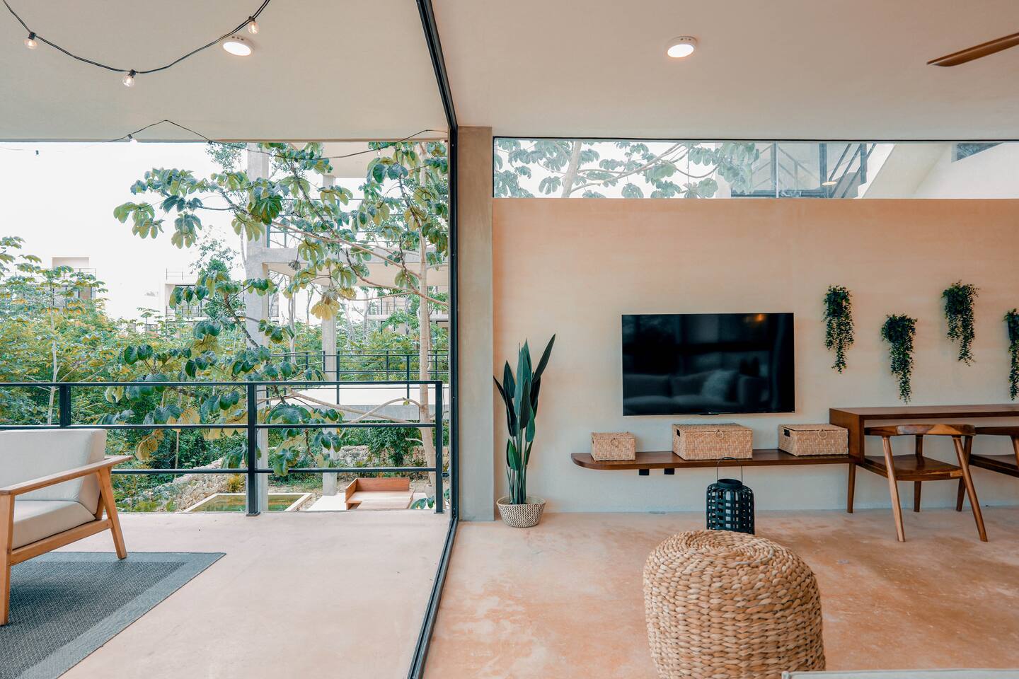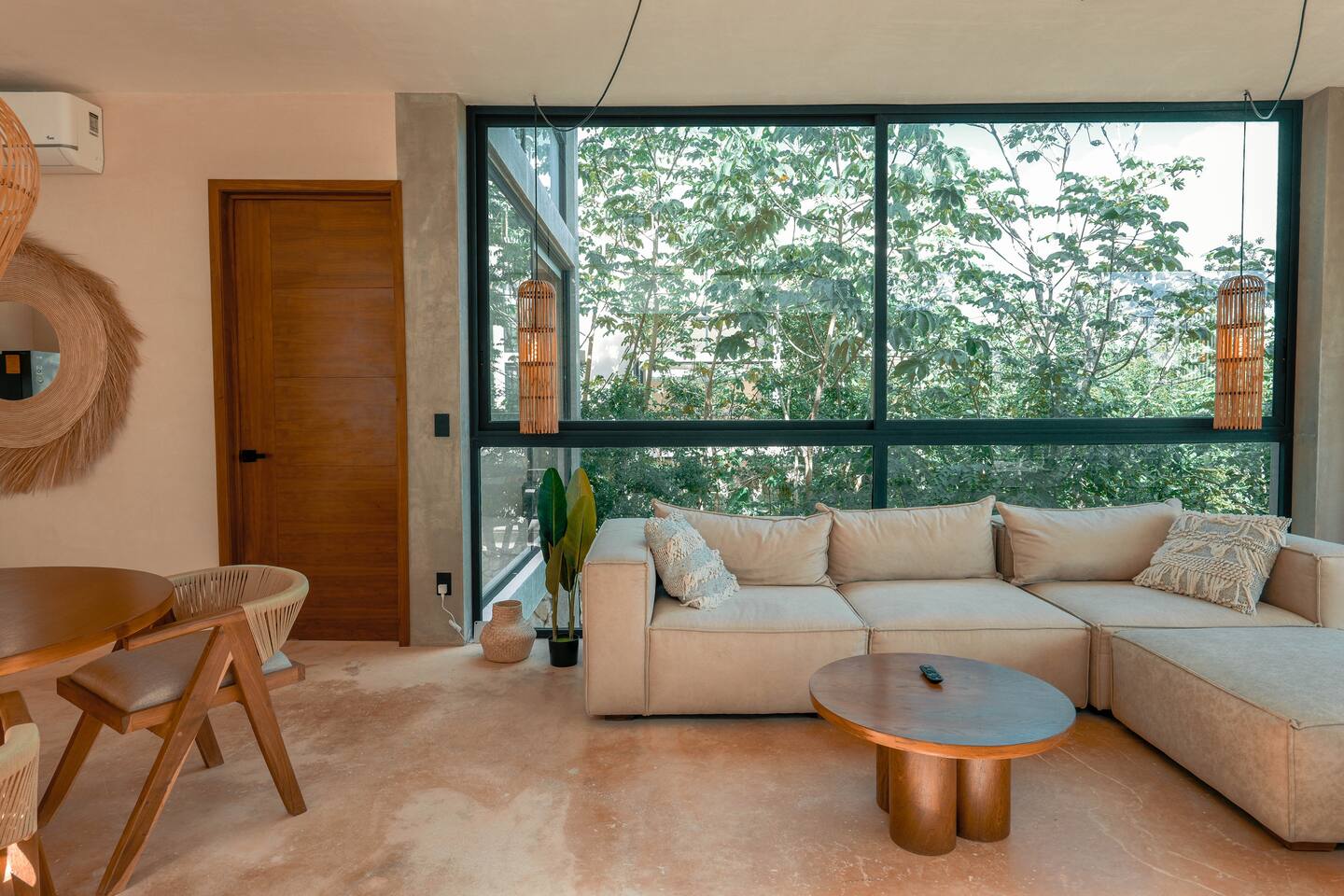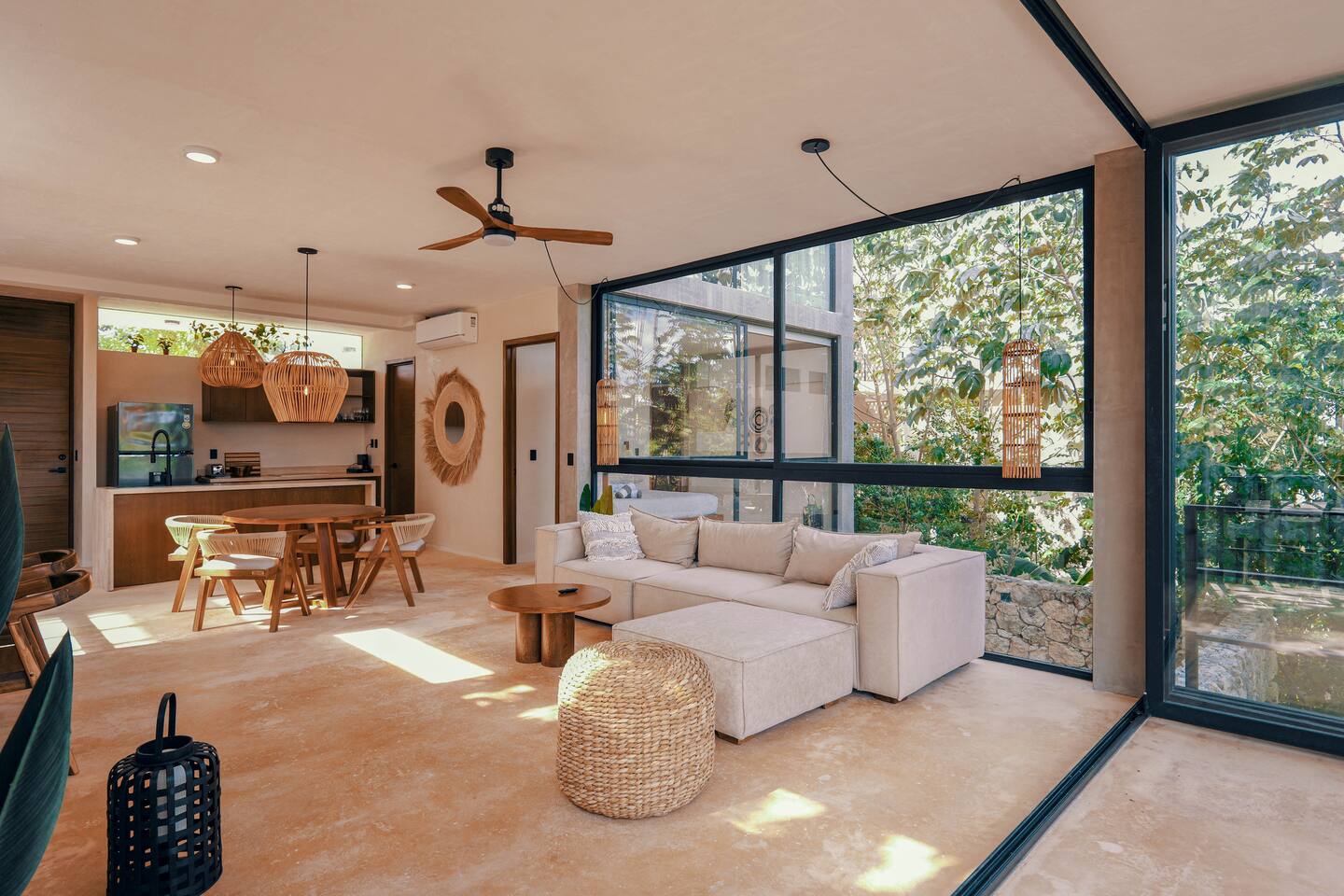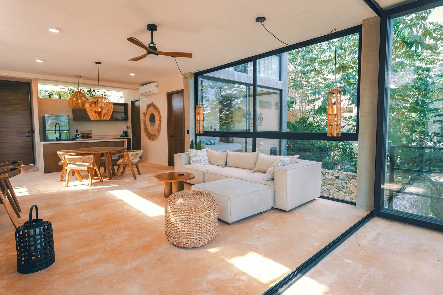 Nestled in a quiet neighborhood surrounded by lush jungle, this charming condo offers the perfect escape for those seeking tranquility and comfort. The rooms are equipped with air conditioning and high-speed Wi-Fi for your convenience. The bedroom features a plush mattress, premium pillows, and hotel-quality linens, lots of closet space, as well as carefully curated decor. The bedroom has a King bed and ensuite bathroom. Towels, including both bath and pool towels, are provided throughout your stay. The open-concept living and dining area is perfect for entertaining or relaxing with loved ones. The fully equipped kitchen, complete with a full oven allows for easy meal preparation, while the dining table is great for family meals. The spacious living room features a comfortable sofa and a flat-screen smart TV with streaming services like Netflix and YouTube for your entertainment. The large terrace opens up from the living room with floor to ceiling sliding glass doors to create a beautiful indoor/outdoor atmosphere to enjoy. The building also comes with amazing amenities within the complex including a jungle gym, a massive pool, co-working/multi-use space, and children's park, guest parking, and 24 hour security. This home combines modern comfort with a peaceful jungle retreat, offering the perfect blend of relaxation and luxury. Your reservation also includes a full service concierge that can assist you with airport transportation, private chef services, massage and wellness services, tours and excursions, ATVs and scooter rentals, beach club reservations, and much more. We look forward to hosting you and providing an unforgettable stay in Tulum!