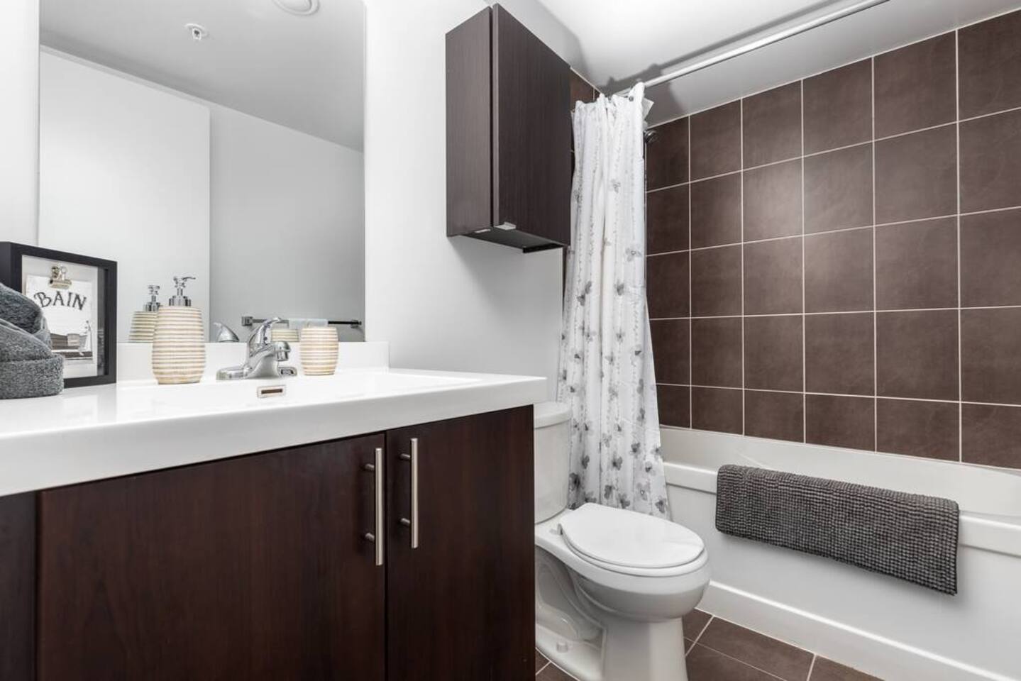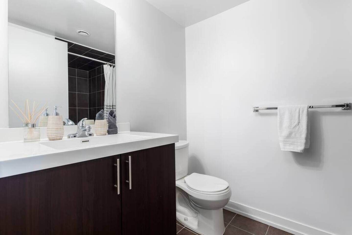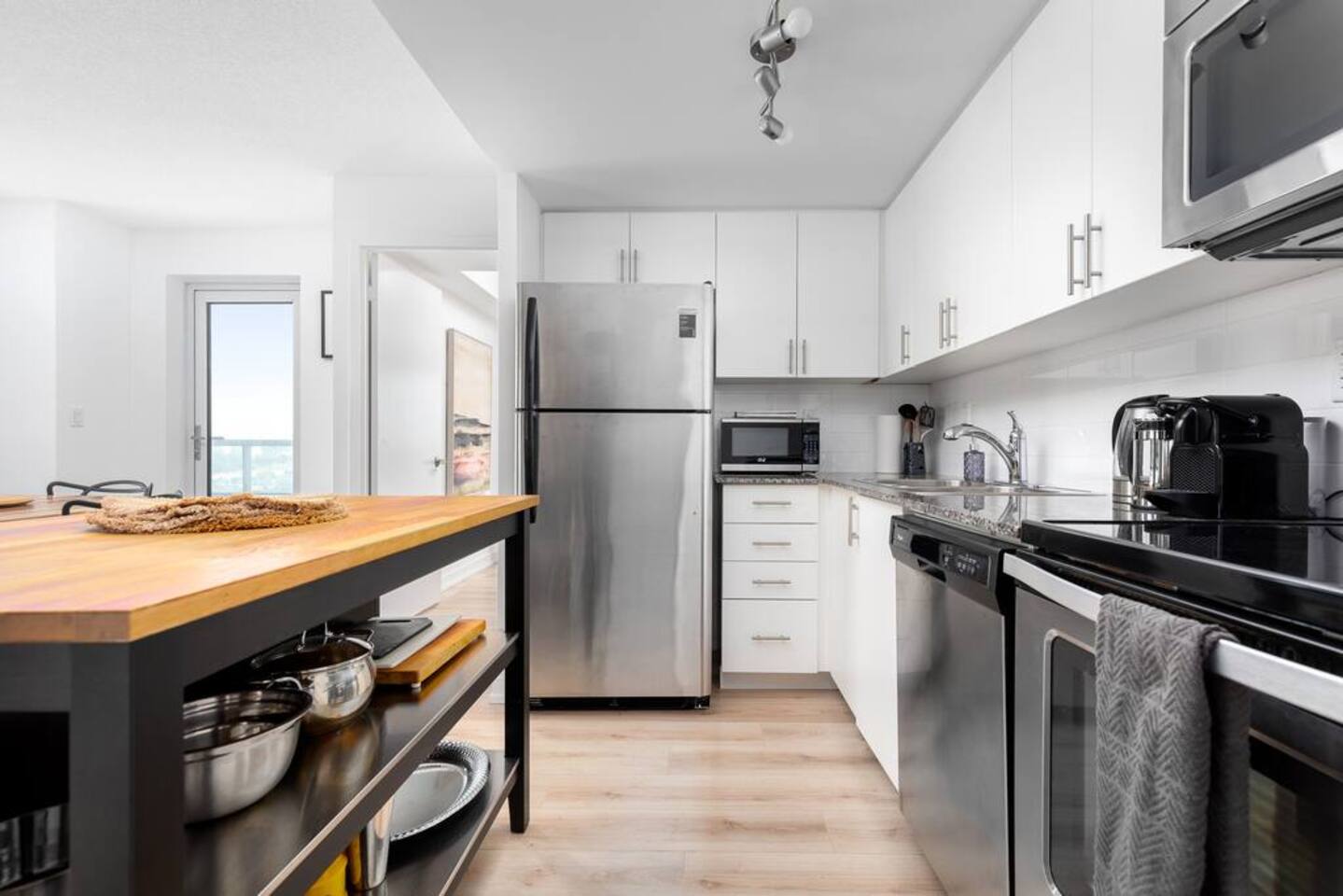 This fully furnished, 2 bedroom 2 bathroom suite is carefully curated with a particular attention to design. The suite is spacious and warm and has everything you need during your stay. Both bedrooms are furnished with plush foam Mattresses and high quality linens and towels. The master bedroom has a king size bed, an ensuite bathroom with a tub and shower, lots of closet space, extra pillows and blankets and a full length mirror. The second bedroom has a queen size bed, spacious closet and extra pillows and blankets. Both rooms have room darkening roller shades. The second bathroom has a massive walk-in shower. The living room has a comfortable couch, with a large flatscreen TV that comes with applications like Netflix and Youtube. There is also a Chromecast that allows you to stream your favourite content from your phone or laptop. The suite also comes equipped with unlimited high speed Bell Fibe internet. In the kitchen, we offer a Nespresso coffee maker and a French Press with coffee, tea, kettle, as well as basic condiments and spices. All top of the line appliances including a dishwasher, ensuite washer and dryer. The wrap around balcony shows an impressive view of the city, and since it is slightly west of downtown, the skyline view is stunning! Free designated parking for one vehicle is available is also available.