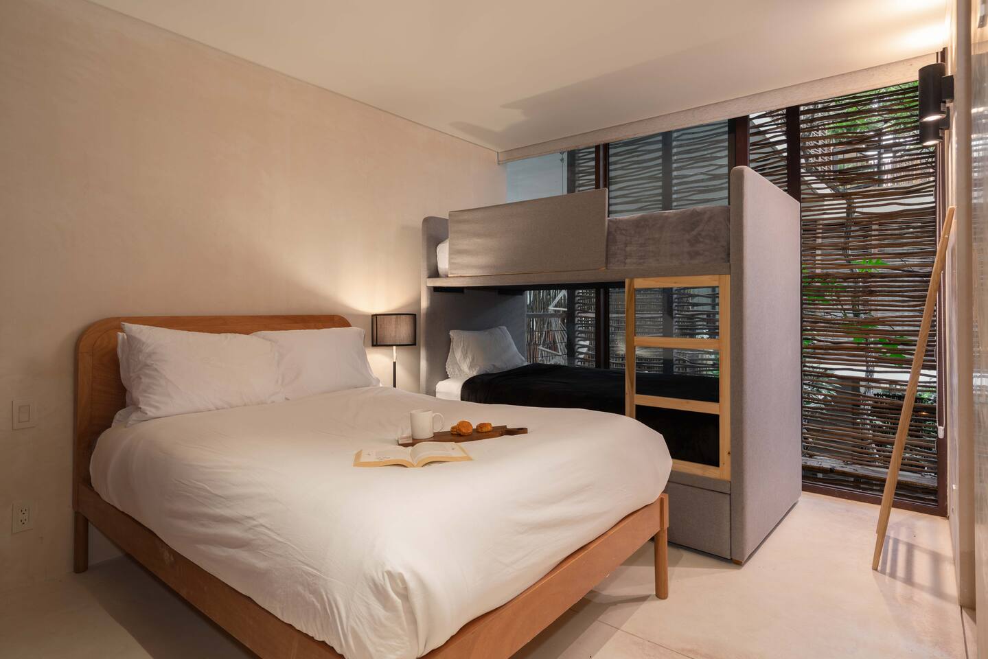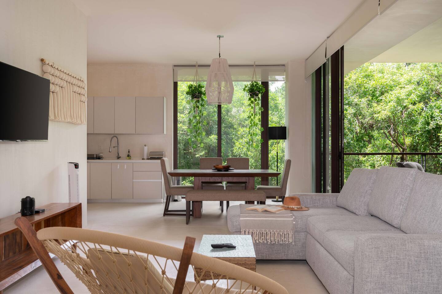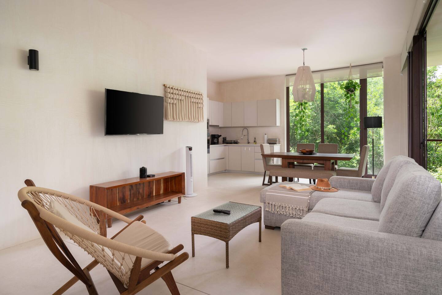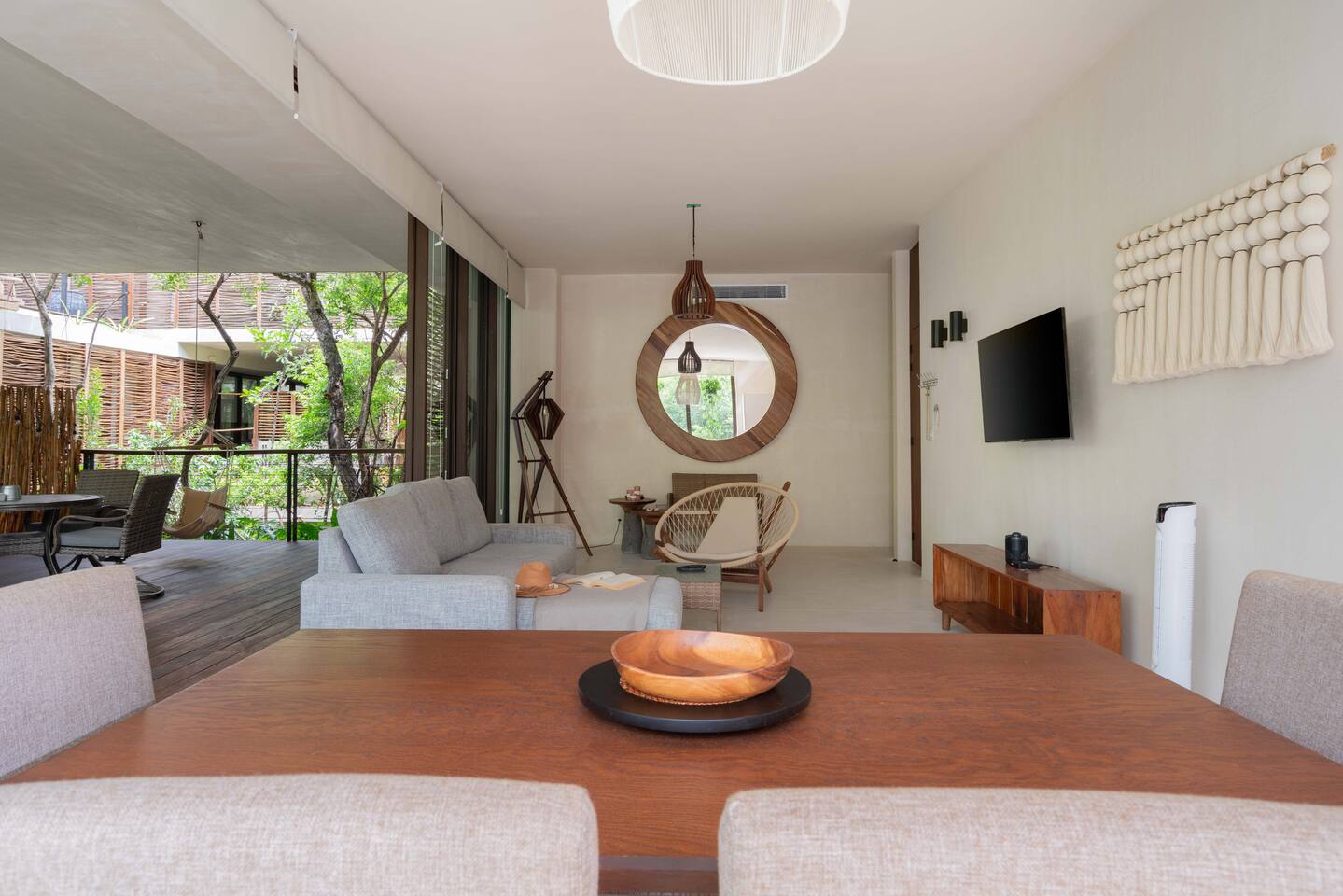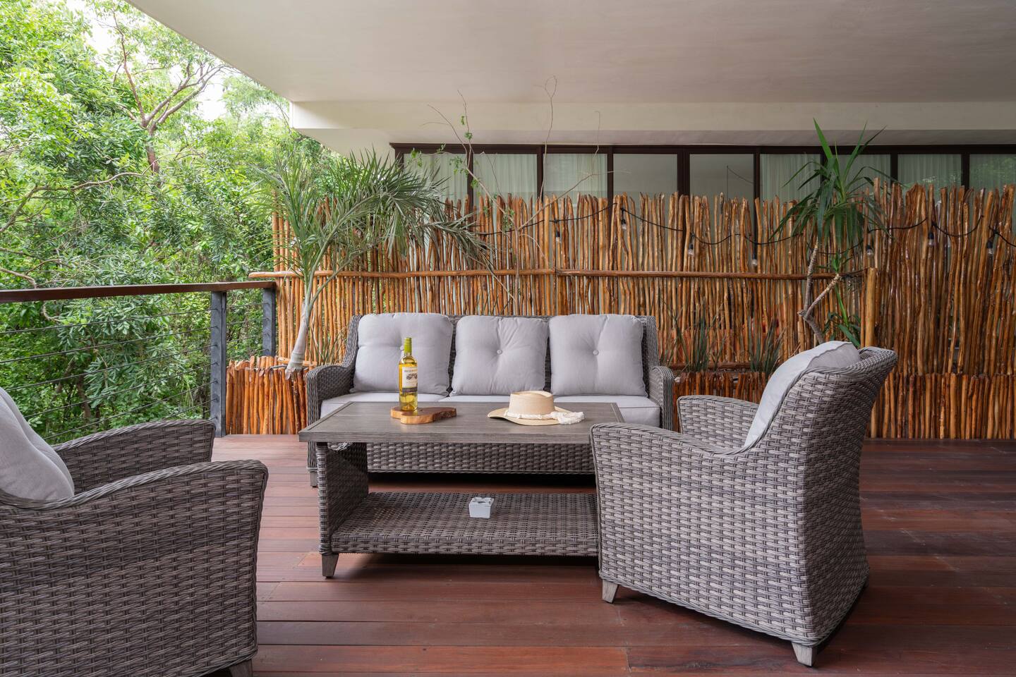 The condo is a very spacious two bedroom, with lots of natural light, high end finishes and warm natural style, high-speed wifi, and hot and cold water. The kitchen is fully equipped with high end appliances such as refrigerator, electric stovetop, high end toaster oven, blender, and coffee maker. Lots of cookware, plates and utensils. The living room has a super comfortable sectional sofa, with a SMART TV and applications like Netflix and Youtube. A great place to relax day or night. Open the sliding doors to the terrace for a great indoor/outdoor living space that overlooks beautiful trees and greenery. The master bedroom has a comfortable King bed with plush mattress, plenty of space and closet space and and ensuite bathroom. The junior bedroom has a Queen bed and a very comfortable cozy bunk bed with lots of closet space and an ensuite bathroom. Additionally there are baby amenities like a portable crib and a baby bath. The highlight of this condo is the massive private terrace, with outdoor dining, and lounge space. A great place to enjoy the jungle view with friends and family. The building has a rooftop pool and lounge, a gym, security and private parking. Your reservation also includes a full service concierge that can assist you with airport transportation, private chef services, massage and wellness services, tours and excursions, ATVs and scooter rentals, beach club reservations, and much more. We look forward to hosting you and providing an unforgettable stay in Tulum!