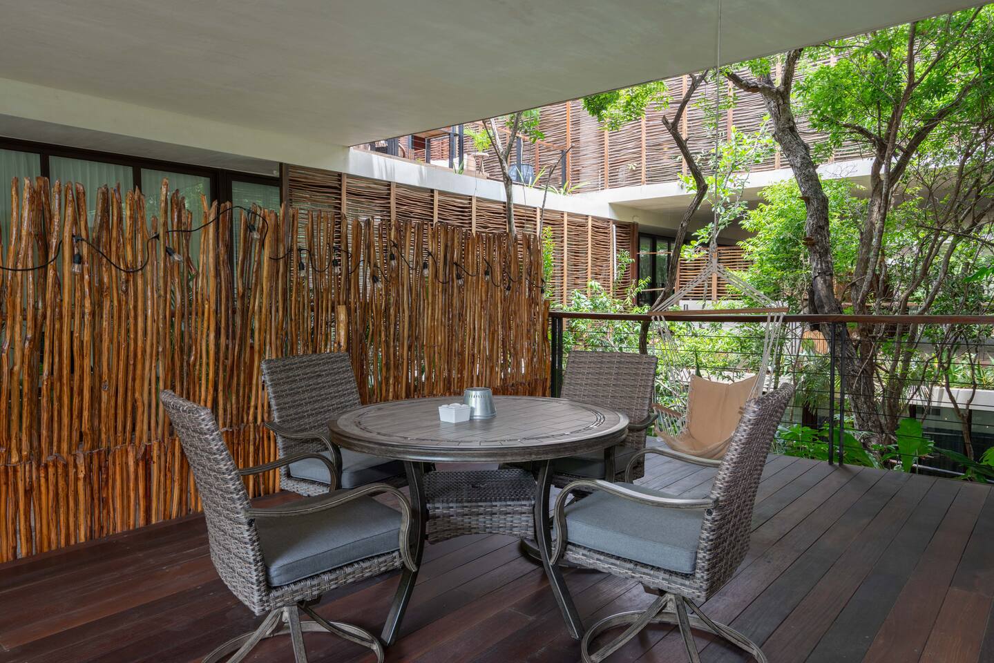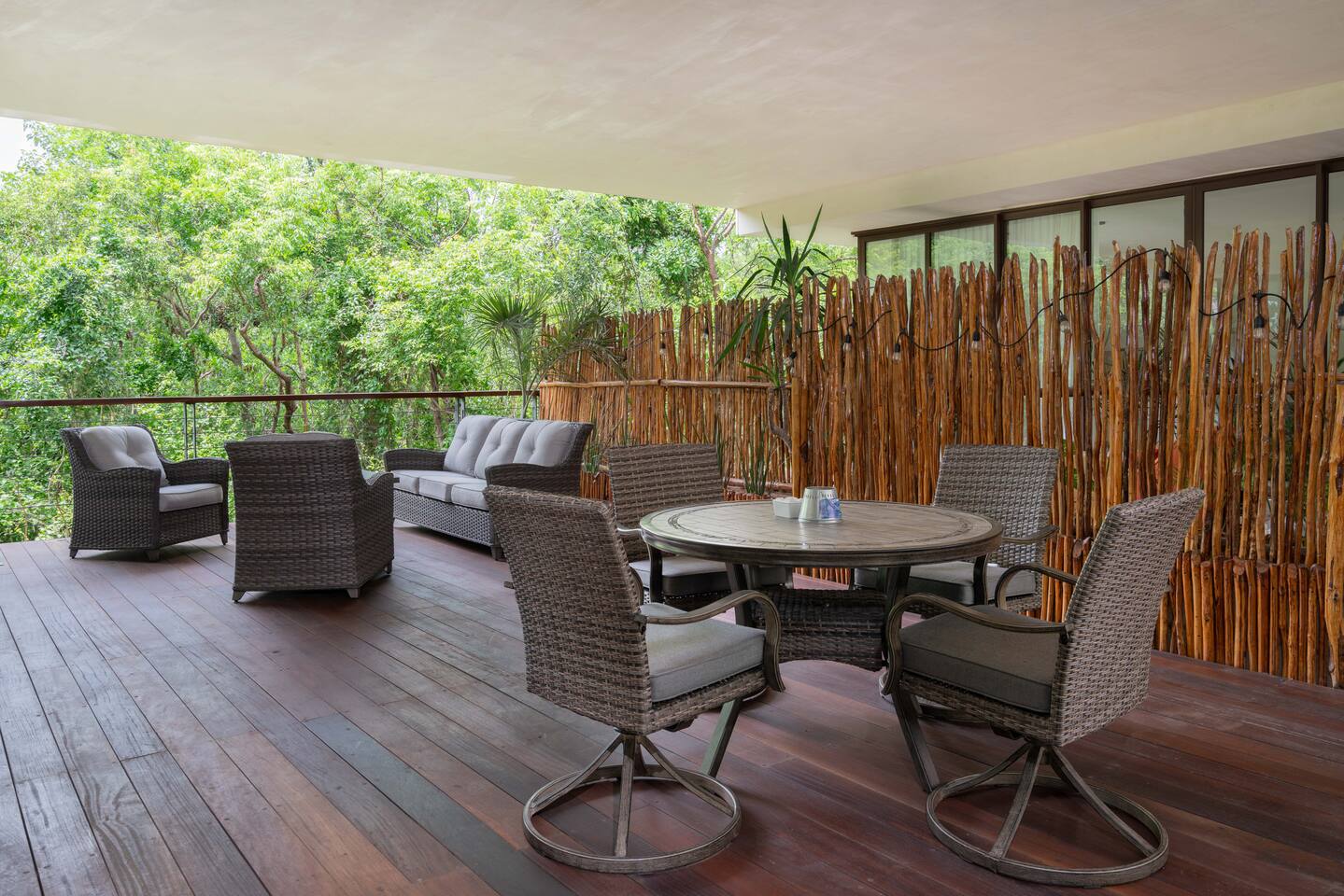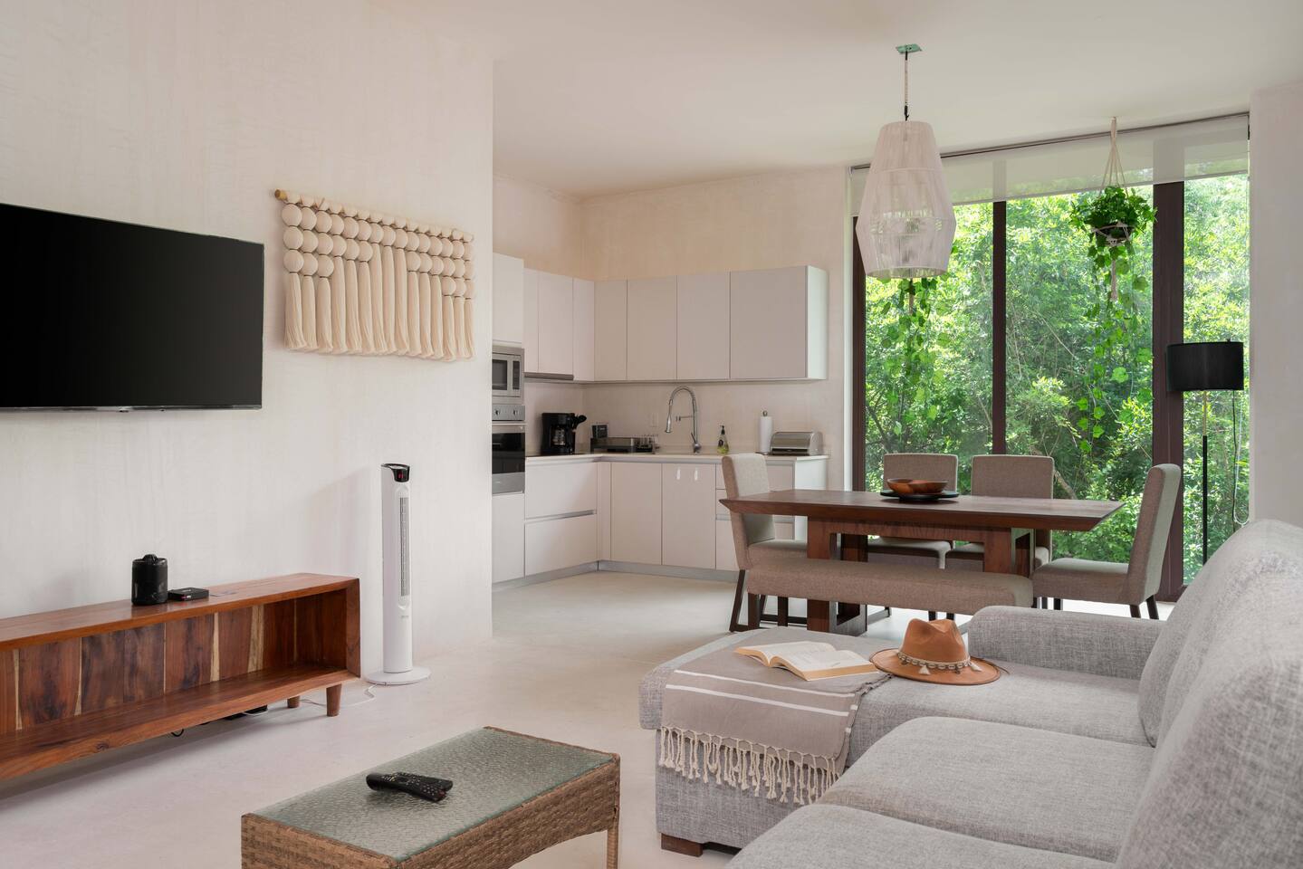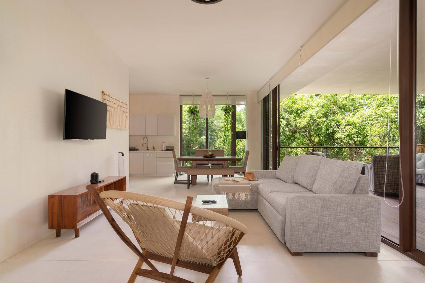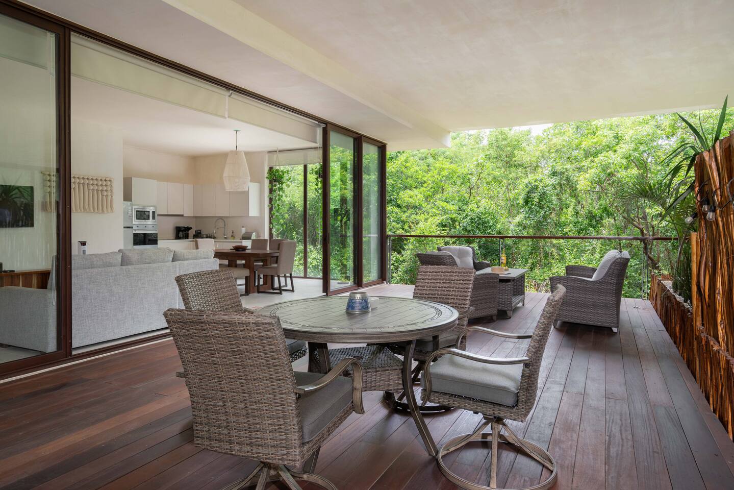 The condo is a very spacious two bedroom, with lots of natural light, high end finishes and warm natural style, high-speed wifi, and hot and cold water. The kitchen is fully equipped with high end appliances such as refrigerator, electric stovetop, high end toaster oven, blender, and coffee maker. Lots of cookware, plates and utensils. The living room has a super comfortable sectional sofa, with a SMART TV and applications like Netflix and Youtube. A great place to relax day or night. Open the sliding doors to the terrace for a great indoor/outdoor living space that overlooks beautiful trees and greenery. The master bedroom has a comfortable King bed with plush mattress, plenty of space and closet space and and ensuite bathroom. The junior bedroom has a Queen bed and a very comfortable cozy bunk bed with lots of closet space and an ensuite bathroom. Additionally there are baby amenities like a portable crib and a baby bath. The highlight of this condo is the massive private terrace, with outdoor dining, and lounge space. A great place to enjoy the jungle view with friends and family. The building has a rooftop pool and lounge, a gym, security and private parking. Your reservation also includes a full service concierge that can assist you with airport transportation, private chef services, massage and wellness services, tours and excursions, ATVs and scooter rentals, beach club reservations, and much more. We look forward to hosting you and providing an unforgettable stay in Tulum!