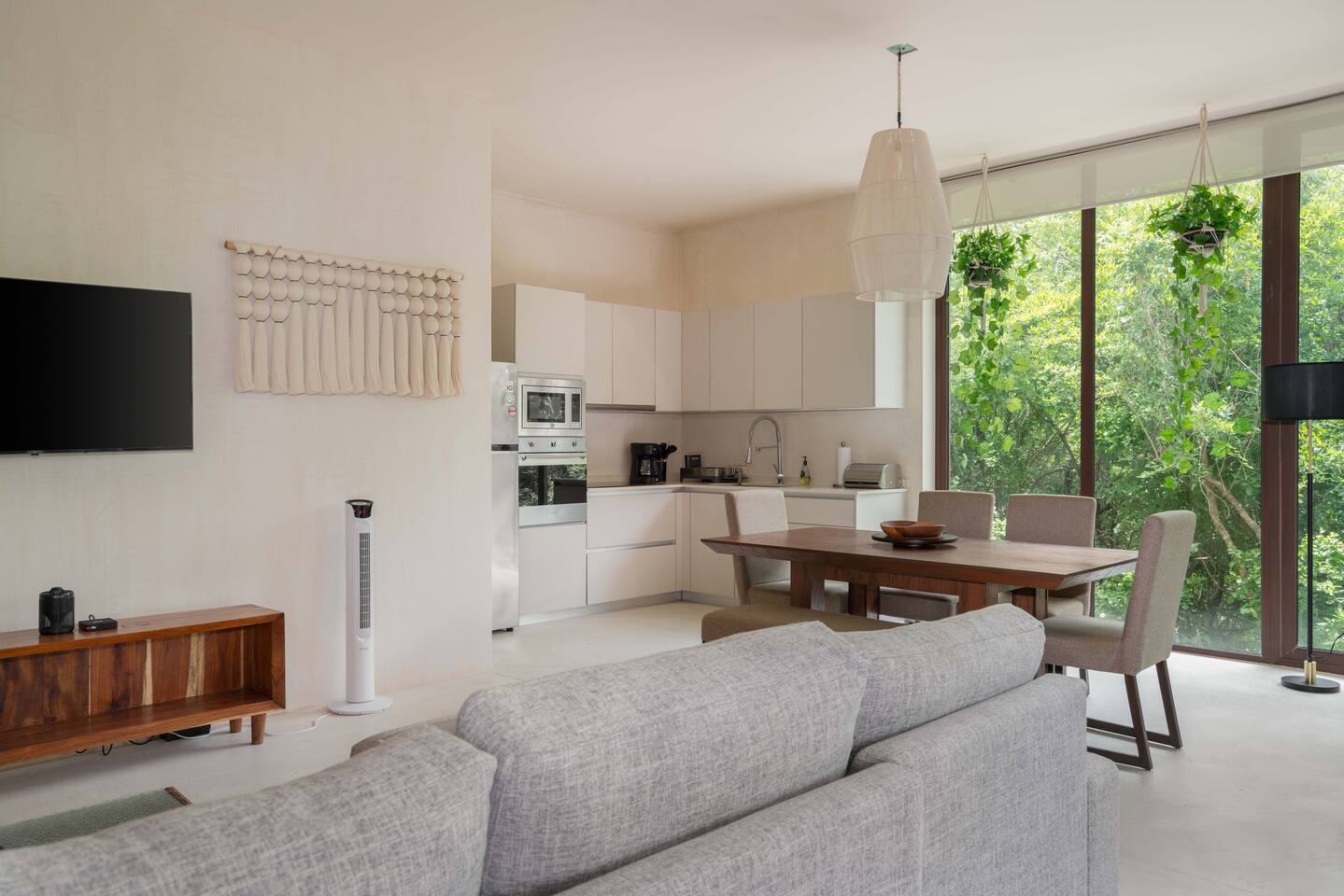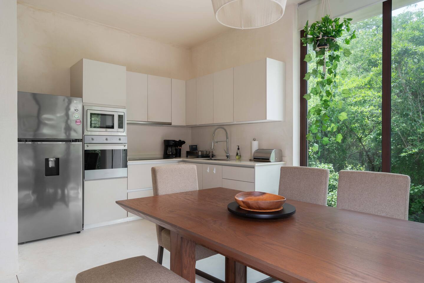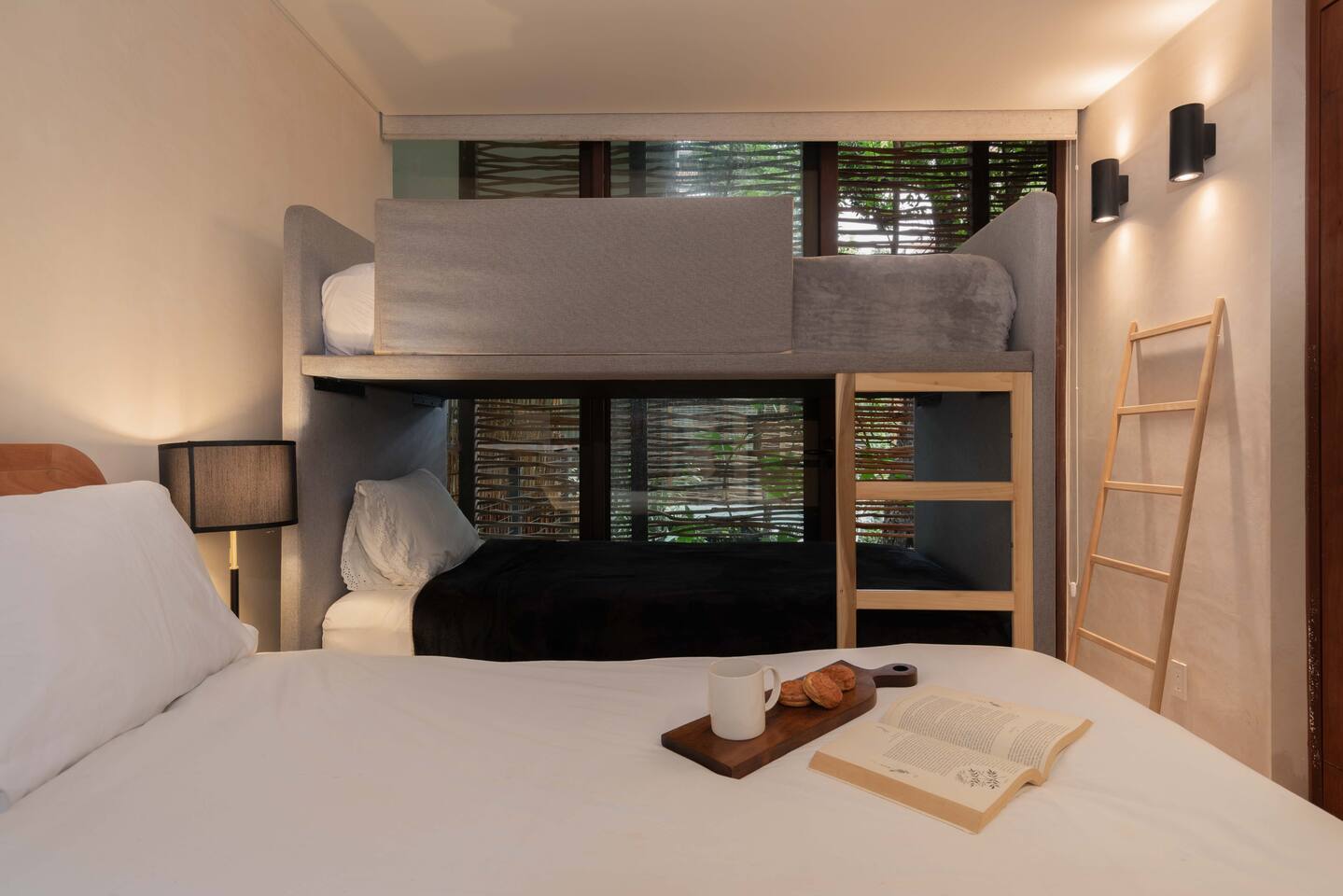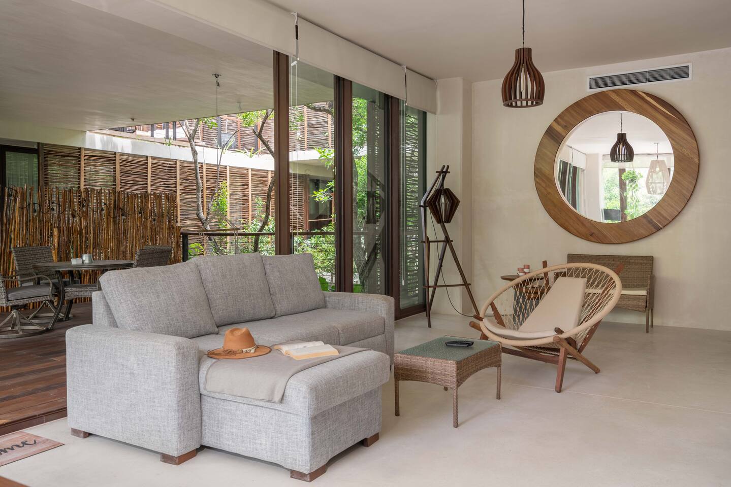 The condo is a very spacious two bedroom, with lots of natural light, high end finishes and warm natural style, high-speed wifi, and hot and cold water. The kitchen is fully equipped with high end appliances such as refrigerator, electric stovetop, high end toaster oven, blender, and coffee maker. Lots of cookware, plates and utensils. The living room has a super comfortable sectional sofa, with a SMART TV and applications like Netflix and Youtube. A great place to relax day or night. Open the sliding doors to the terrace for a great indoor/outdoor living space that overlooks beautiful trees and greenery. The master bedroom has a comfortable King bed with plush mattress, plenty of space and closet space and and ensuite bathroom. The junior bedroom has a Queen bed and a very comfortable cozy bunk bed with lots of closet space and an ensuite bathroom. Additionally there are baby amenities like a portable crib and a baby bath. The highlight of this condo is the massive private terrace, with outdoor dining, and lounge space. A great place to enjoy the jungle view with friends and family. The building has a rooftop pool and lounge, a gym, security and private parking. Your reservation also includes a full service concierge that can assist you with airport transportation, private chef services, massage and wellness services, tours and excursions, ATVs and scooter rentals, beach club reservations, and much more. We look forward to hosting you and providing an unforgettable stay in Tulum!
