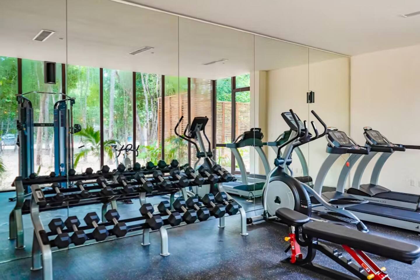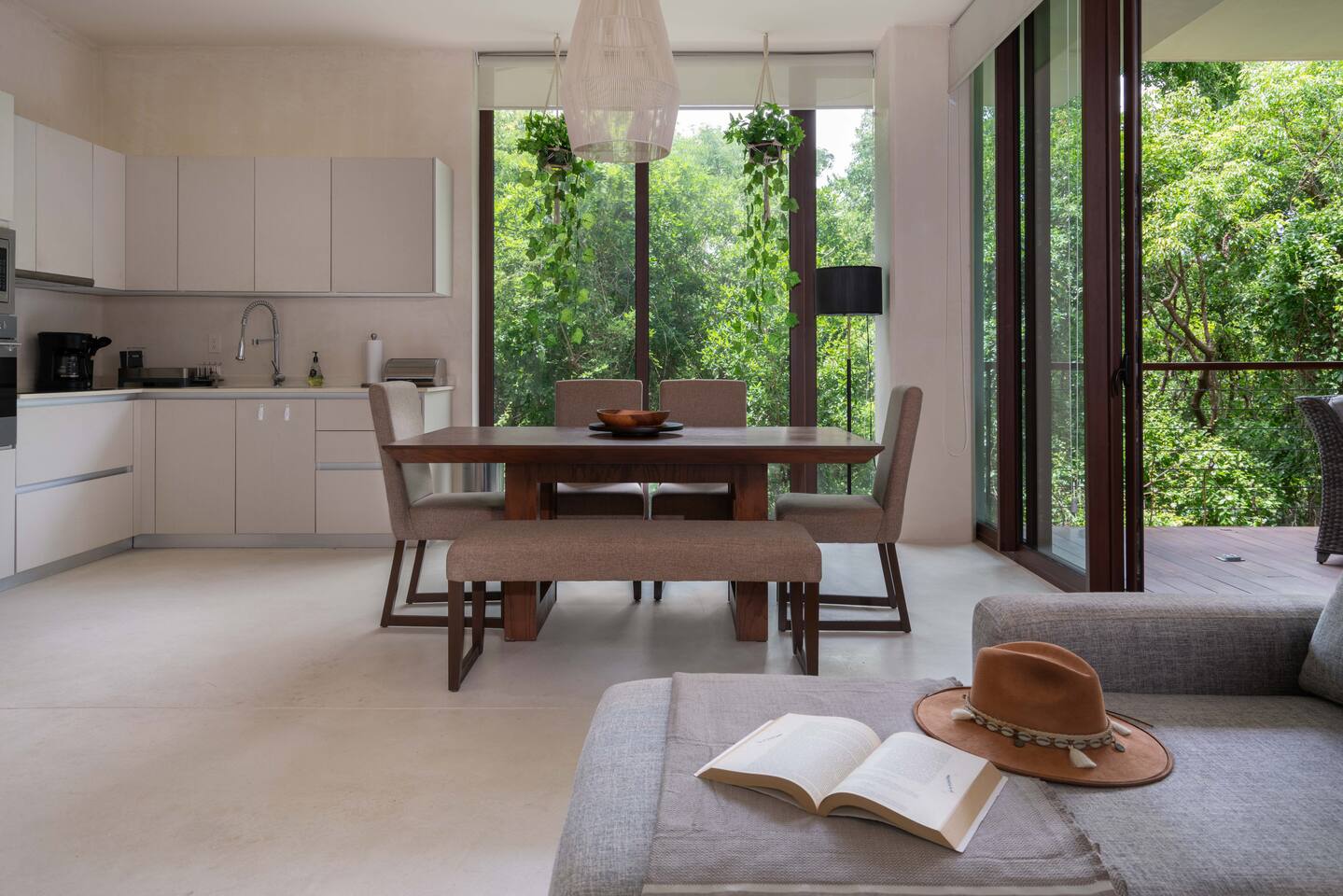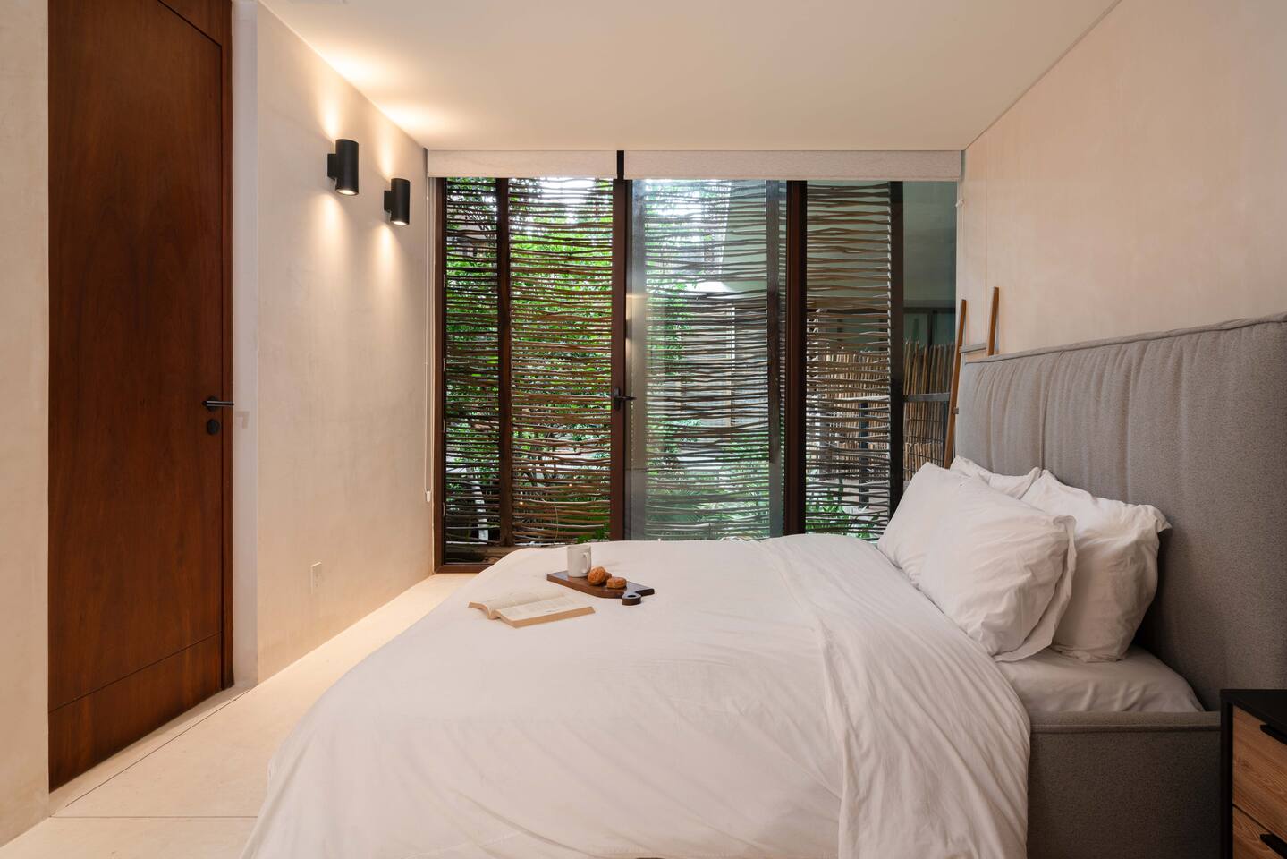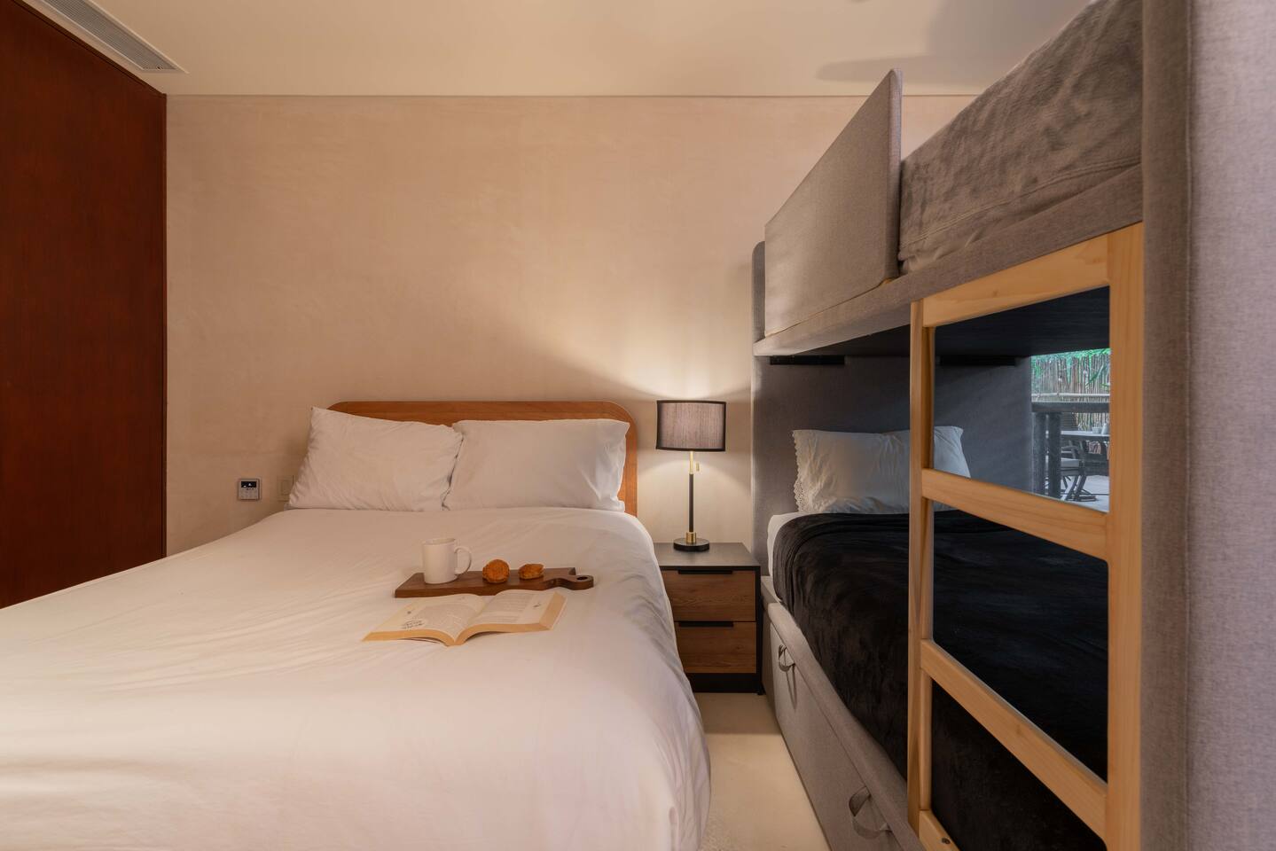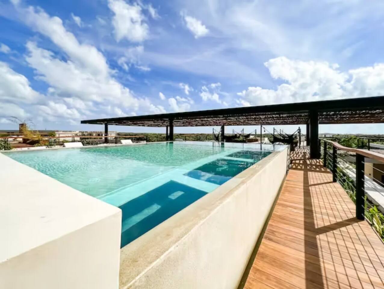 The condo is a very spacious two bedroom, with lots of natural light, high end finishes and warm natural style, high-speed wifi, and hot and cold water. The kitchen is fully equipped with high end appliances such as refrigerator, electric stovetop, high end toaster oven, blender, and coffee maker. Lots of cookware, plates and utensils. The living room has a super comfortable sectional sofa, with a SMART TV and applications like Netflix and Youtube. A great place to relax day or night. Open the sliding doors to the terrace for a great indoor/outdoor living space that overlooks beautiful trees and greenery. The master bedroom has a comfortable King bed with plush mattress, plenty of space and closet space and and ensuite bathroom. The junior bedroom has a Queen bed and a very comfortable cozy bunk bed with lots of closet space and an ensuite bathroom. Additionally there are baby amenities like a portable crib and a baby bath. The highlight of this condo is the massive private terrace, with outdoor dining, and lounge space. A great place to enjoy the jungle view with friends and family. The building has a rooftop pool and lounge, a gym, security and private parking. Your reservation also includes a full service concierge that can assist you with airport transportation, private chef services, massage and wellness services, tours and excursions, ATVs and scooter rentals, beach club reservations, and much more. We look forward to hosting you and providing an unforgettable stay in Tulum!