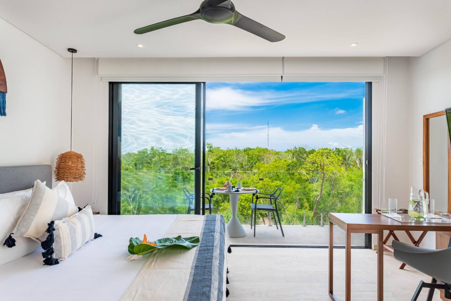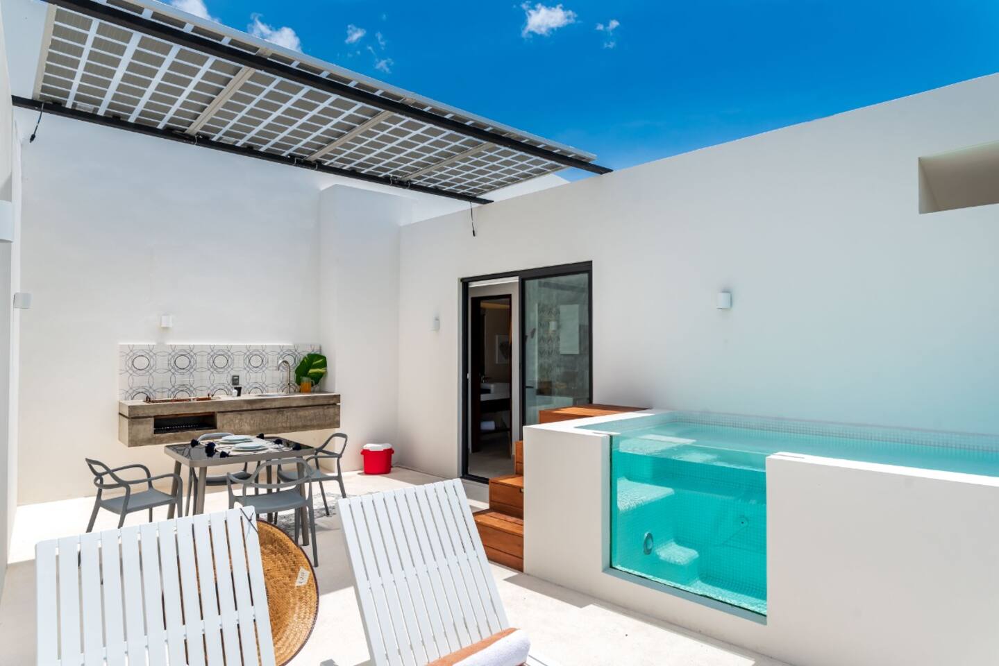 Experience a sense of calm when you arrive. The main level common space and panoramic pools are absolutely stunning, especially at night with the warm lighting. The suite is a cozy studio with both a balcony and a terrace with private pool. The kitchenette is equipped with a mini fridge refrigerator, electric stovetop, coffee machine, microwave, and other necessities. Cookware, plates and utensils, and an outdoor dining table. High end King mattress with hotel quality linens and pillows and room darkening shades. a SMART TV and applications like Netflix and Youtube. A great place to relax day or night. The highlight of this suite is the large terrace. An amazing place to wake up, enjoy the sun, have a BBQ and meal, and stargaze. The building has amazing amenities including a Gym, co-working space, free parking, 24 hour reception desk, on-site spa, wrap around ground level pools and lounge deck and an on-site restaurant. Your reservation also includes a full service concierge that can assist you with airport transportation, private chef services, massage and wellness services, tours and excursions, ATVs and scooter rentals, beach club reservations, and much more.