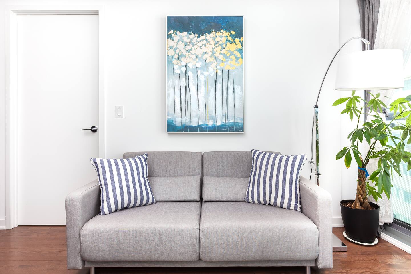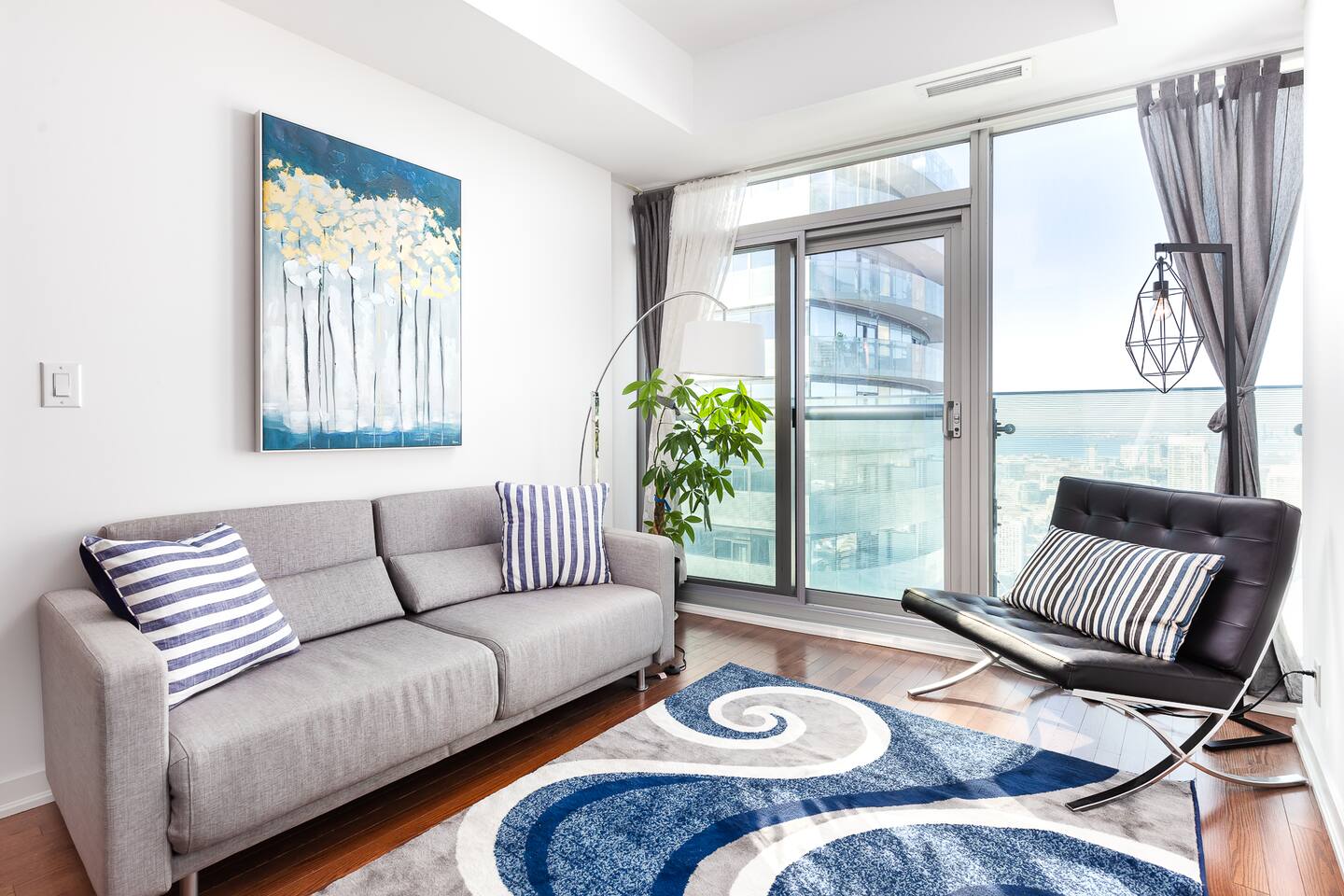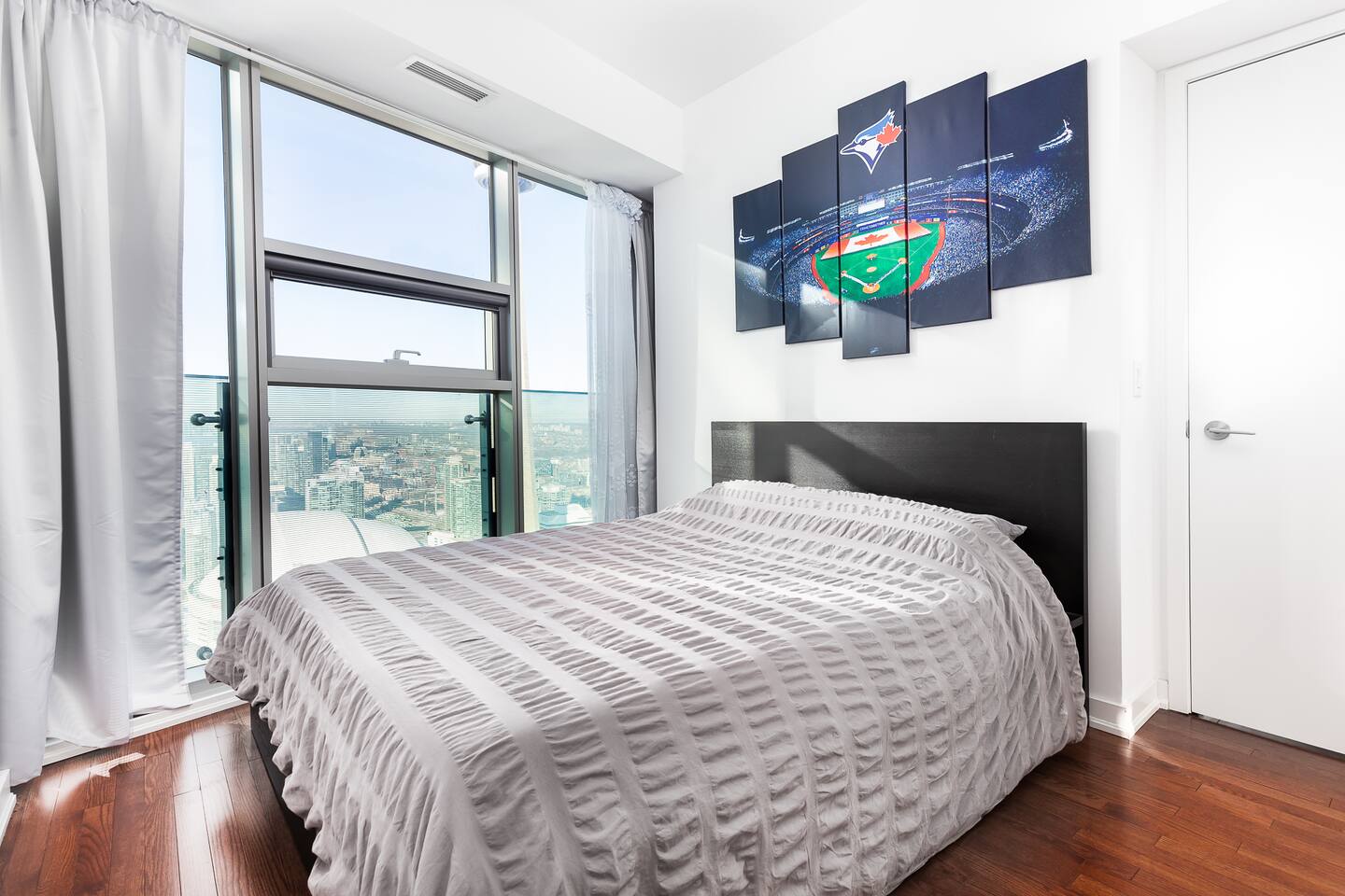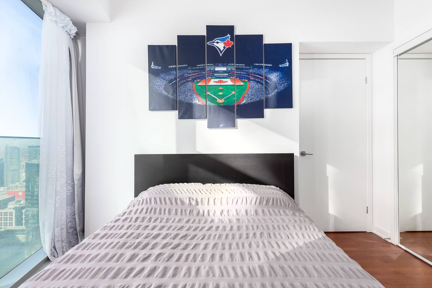Our beautiful, spacious suite comes equipped with everything you'll need during your stay. You'll find a lovely southwest view from the balcony and floor to ceiling windows. You can start your day with a cup of coffee and soak in the view of the Toronto skyline and Lake Ontario. Beautifully decorated and carefully furnished, you'll enjoy the following during your stay with us: * Free underground parking * Spacious bedroom with a queen size memory-foam mattress and plush pillows * Hotel quality linens and towels * Essential toiletries such as shampoo, conditioner, shower gel, and a hairdryer * Fully stocked kitchen with cookware, bakeware, utensils, a coffeemaker and more * Living Room TV installed with Roku and Netflix * High speed, unlimited wifi throughout the suite and balcony * In suite washer and dryer
