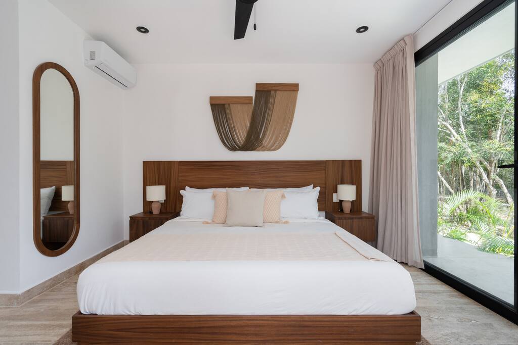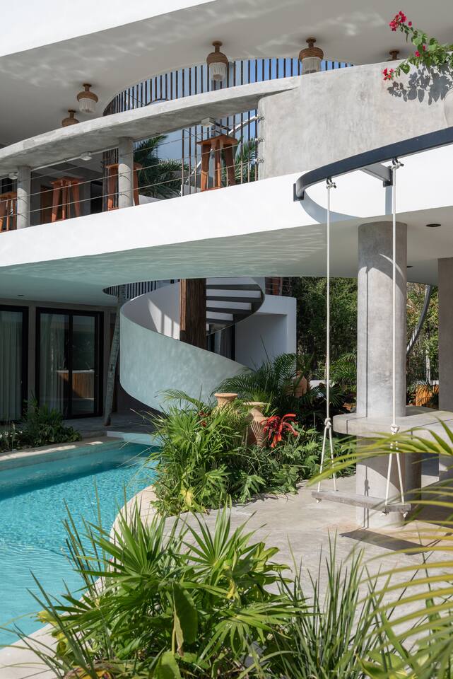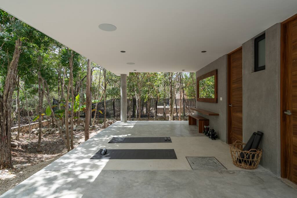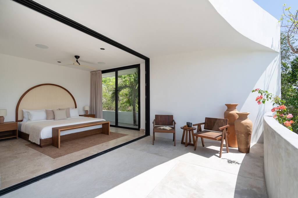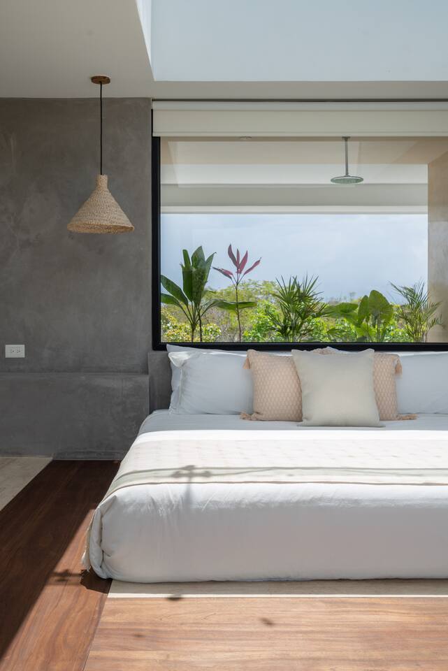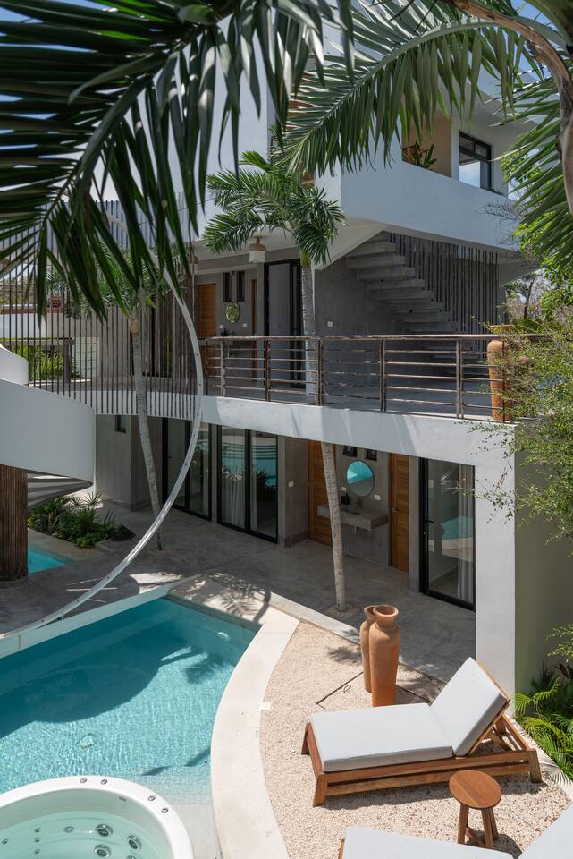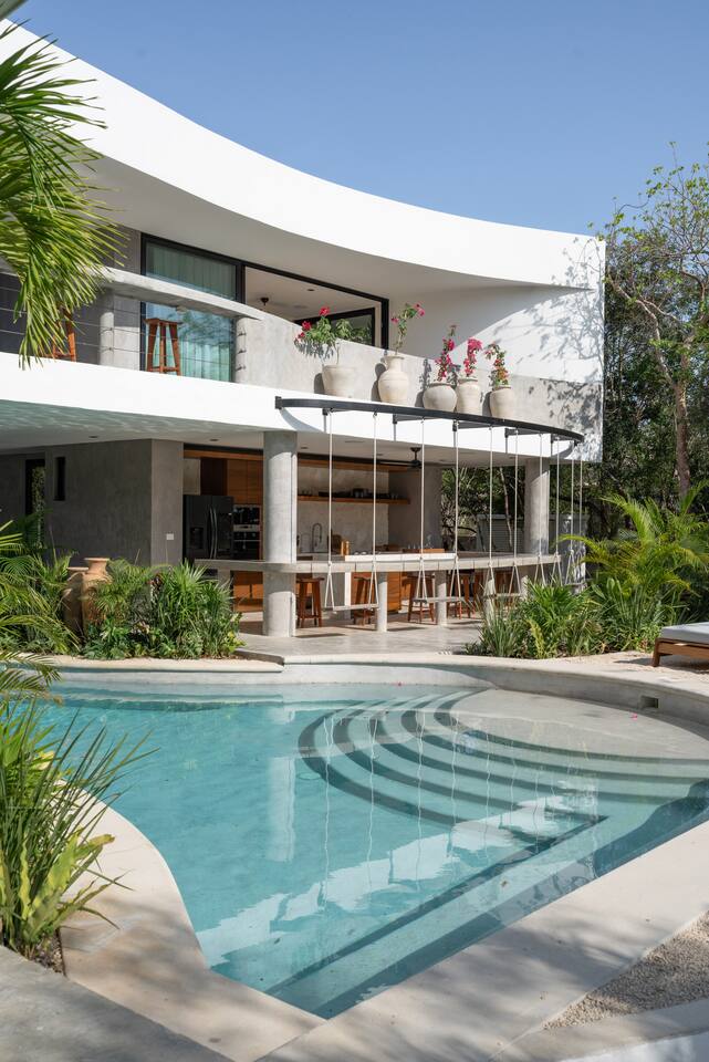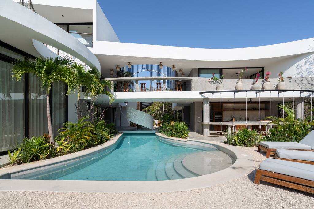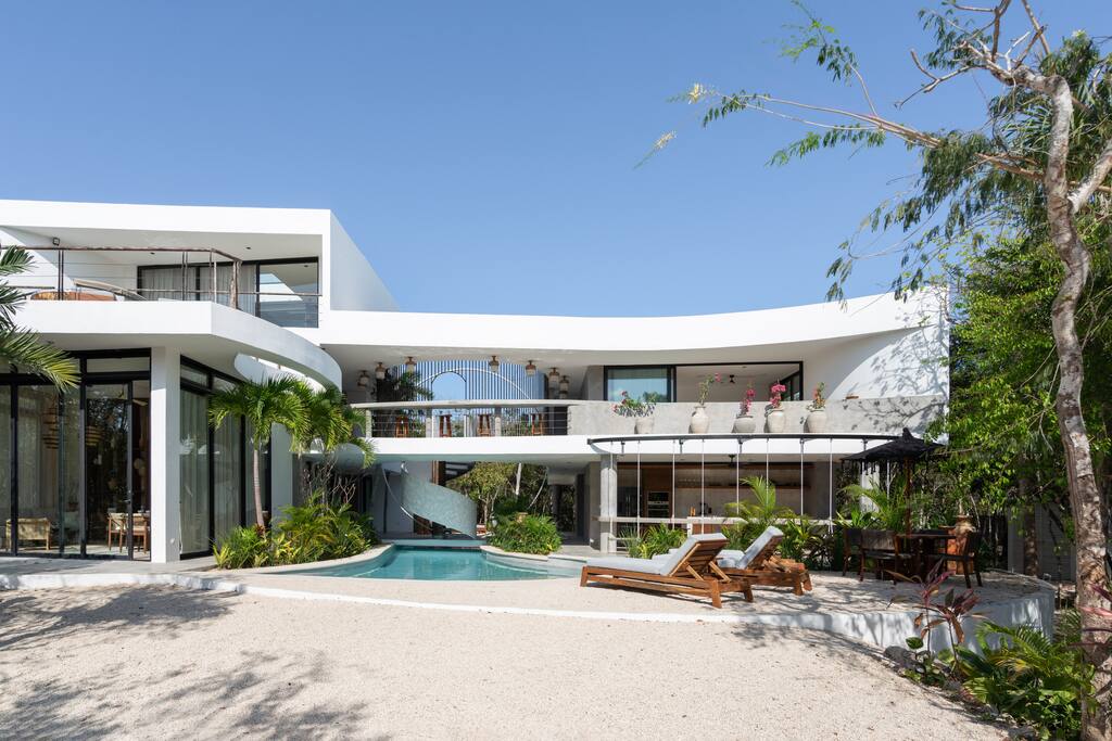 Welcome to your dream escape in the heart of the Tulum jungle - a luxurious 9-bedroom villa designed for unforgettable experiences, ideal for large groups, retreats, family gatherings, or private events. This secluded three-level villa seamlessly blends indoor-outdoor living with modern comforts and natural beauty, all tucked within a secure gated community with 24-hour security and private parking. **Villa Layout & Common Spaces:** A stunning open-concept home where nature and luxury coexist in perfect harmony. The villa features soaring ceilings in the enclosed main living room, outfitted with plush lounge seating, a large flat screen TV with streaming services, and built-in surround sound speakers throughout the house. The living space includes a dining area perfect for shared meals and celebrations. A wall of glass doors connects the indoors to the expansive outdoor area, where the impressive swimming pool stretches the entire length of the home. Surrounding the pool are multiple sun loungers, tropical greenery, and shaded lounge areas—ideal for soaking up the jungle vibes by day and stargazing by night. Three spacious terraces throughout the house offer panoramic views over the lush Tulum jungle, with one perfectly positioned for breathtaking sunsets. **Wellness & Leisure Amenities:** For those seeking balance and relaxation, the villa features a tranquil spa room with a large spa jacuzzi and a small, fully-equipped fitness space/yoga terrace. Two additional spa jacuzzis are placed throughout the property, offering relaxing spots for unwinding after a day of adventure. The natural beauty of the surroundings includes an exclusive, private cenote accessible only to the homes within the gated community—an unforgettable place for a morning swim or quiet meditation. **Bedrooms & Comfort:** Each of the nine bedrooms is thoughtfully designed for rest and privacy, with hotel-quality linens, high-end mattresses, and plenty of natural light. Every room includes its own closet, air conditioning, and tranquil jungle views. The sleeping arrangements offer flexibility for any group, with king beds in all rooms to accommodate up to 18 guests comfortably. Several bedrooms have private balconies or access to one of the villa’s stunning terraces. **Additional Features:** * Fully equipped modern kitchen * Indoor/outdoor speaker system * Hotel-style high-quality towels and linens * Private parking on-site * Housekeeping, concierge, and trip planning and design * Wi-Fi throughout the property Whether you’re planning a yoga retreat, a milestone birthday, or simply want to relax in secluded luxury, this villa is a one-of-a-kind experience in Tulum. Surrounded by tropical birds and untouched jungle, yet just a short drive to Tulum’s beach and town, it offers the best of both worlds—privacy and convenience, nature and indulgence. This is more than just a stay—this is your private jungle sanctuary.
