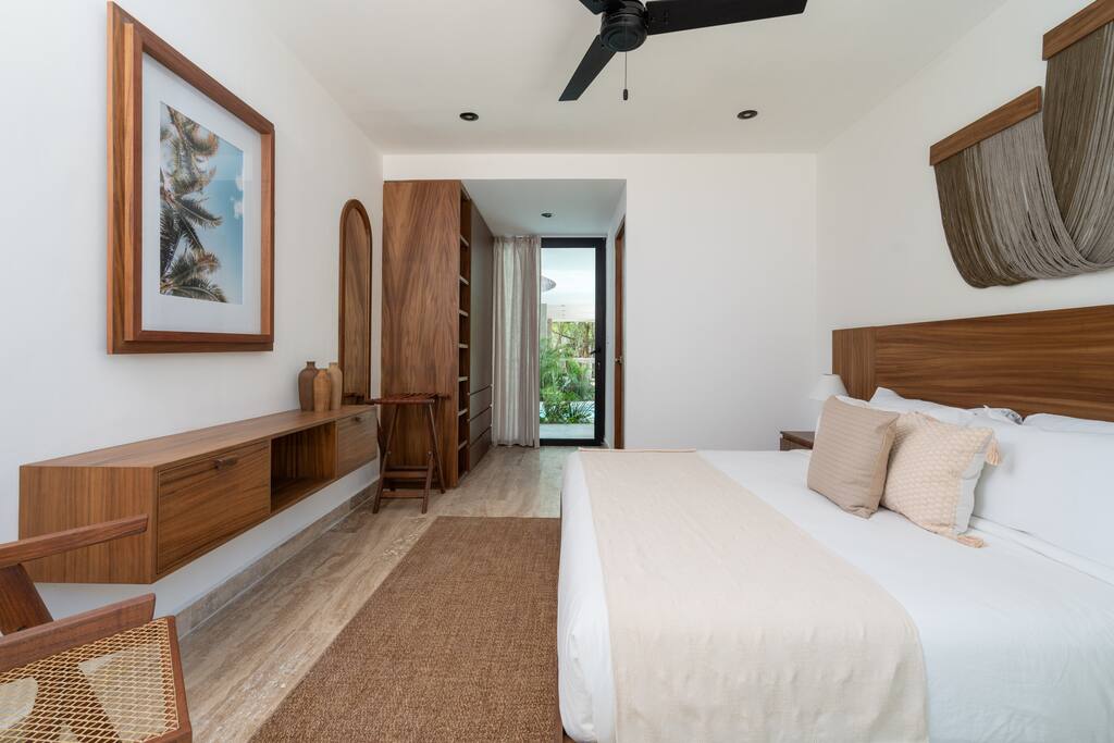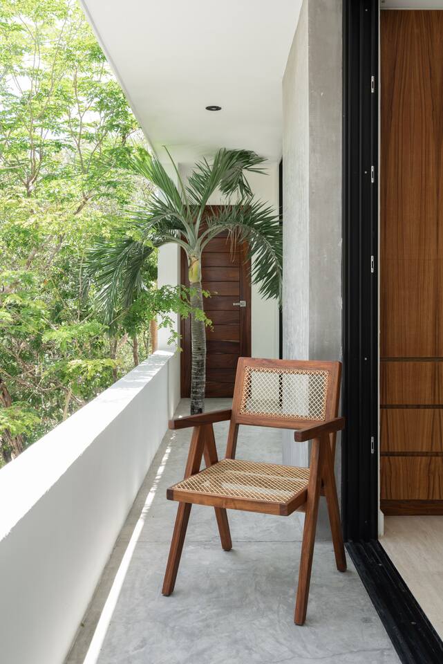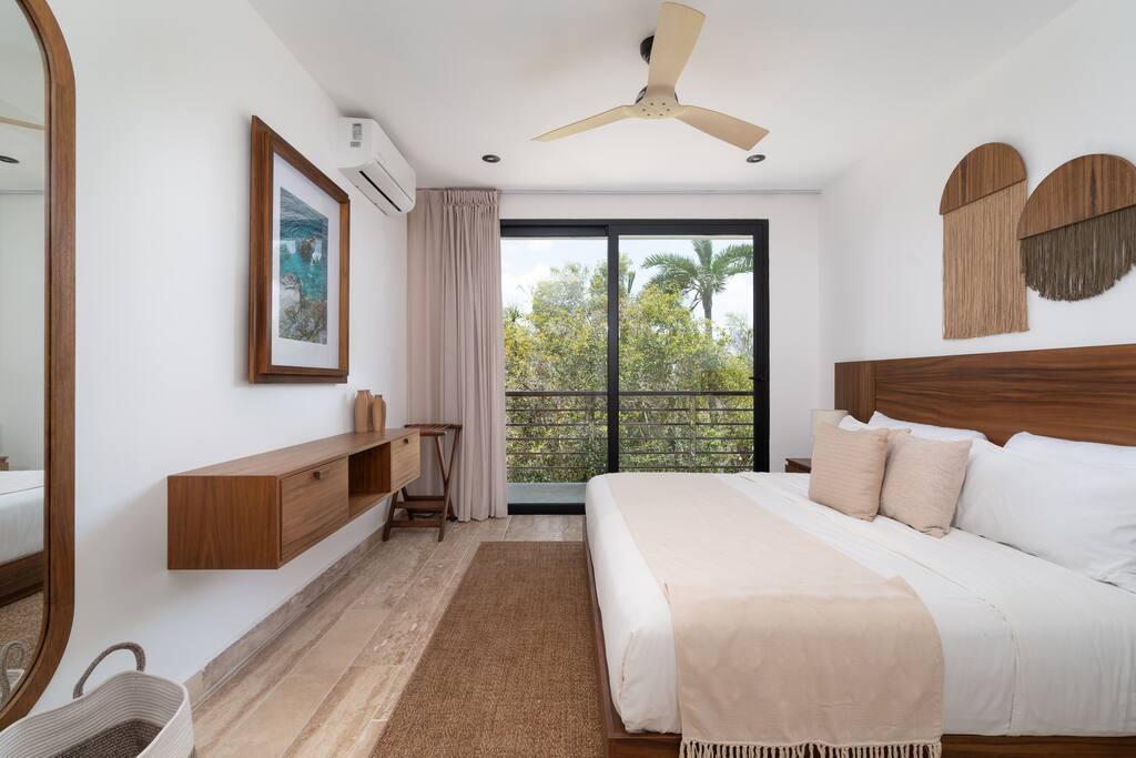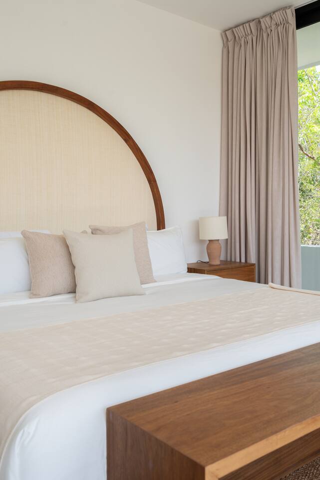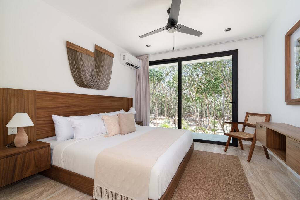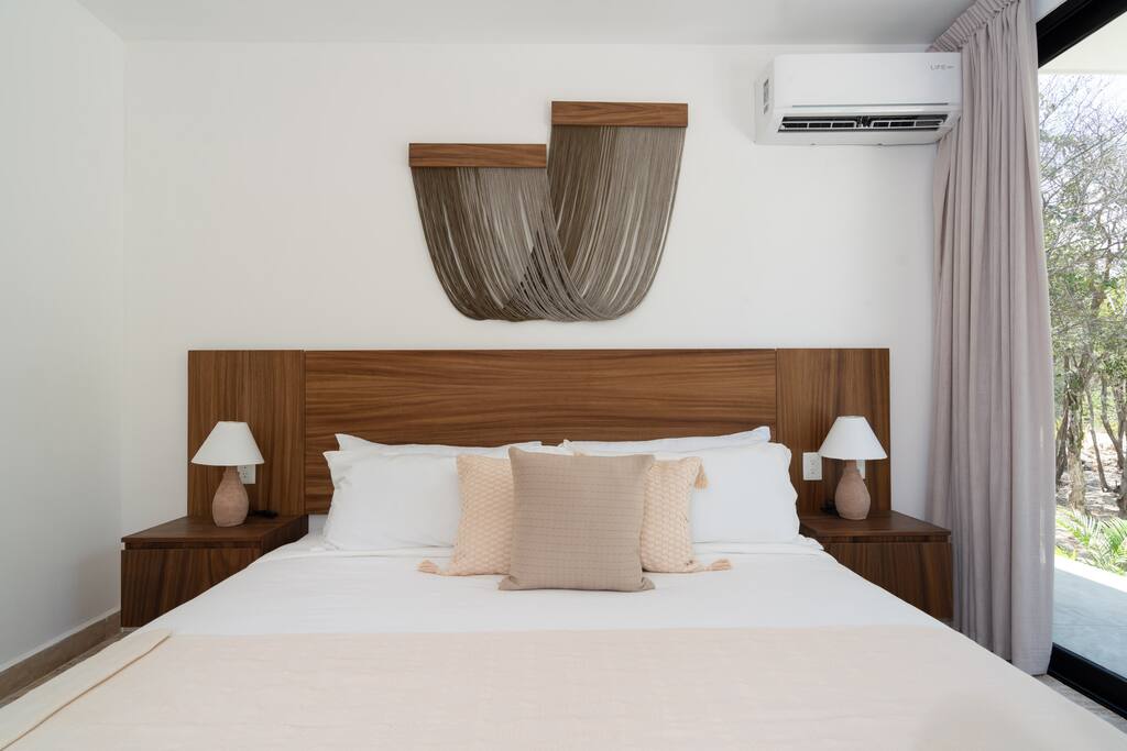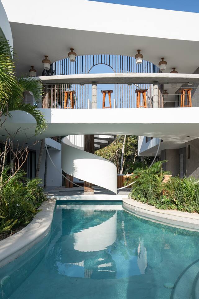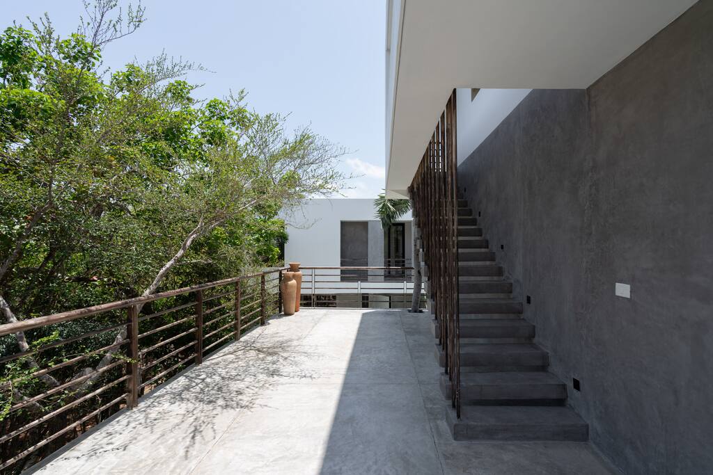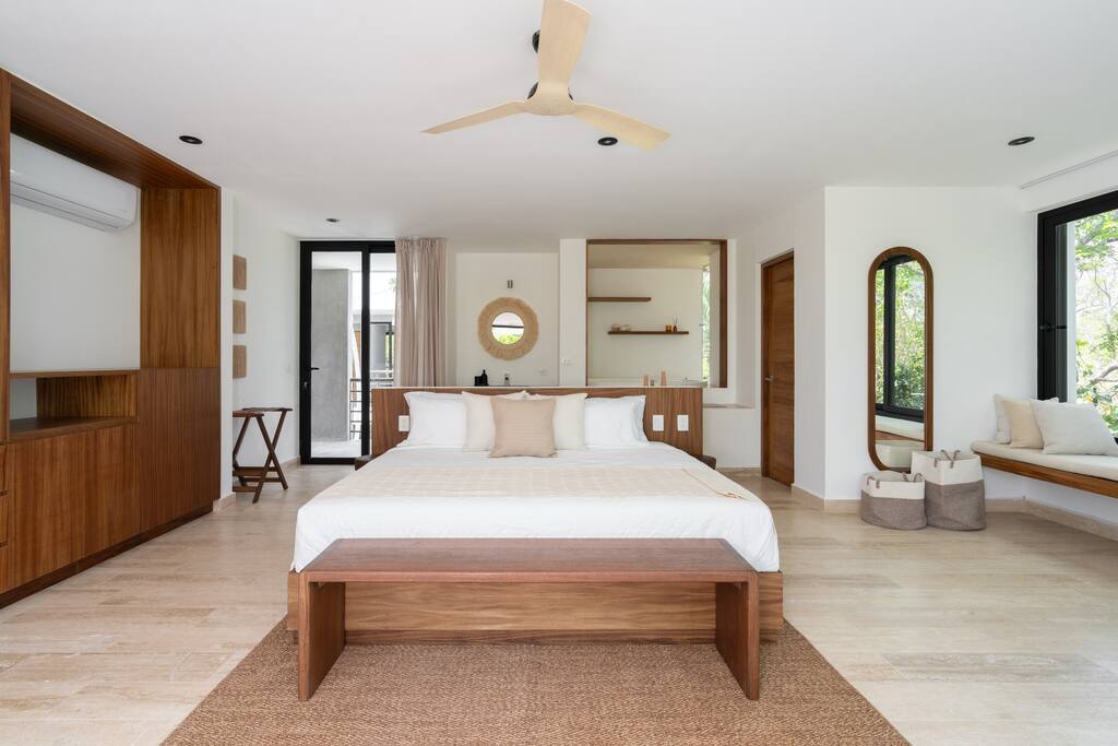 Welcome to your dream escape in the heart of the Tulum jungle - a luxurious 9-bedroom villa designed for unforgettable experiences, ideal for large groups, retreats, family gatherings, or private events. This secluded three-level villa seamlessly blends indoor-outdoor living with modern comforts and natural beauty, all tucked within a secure gated community with 24-hour security and private parking. **Villa Layout & Common Spaces:** A stunning open-concept home where nature and luxury coexist in perfect harmony. The villa features soaring ceilings in the enclosed main living room, outfitted with plush lounge seating, a large flat screen TV with streaming services, and built-in surround sound speakers throughout the house. The living space includes a dining area perfect for shared meals and celebrations. A wall of glass doors connects the indoors to the expansive outdoor area, where the impressive swimming pool stretches the entire length of the home. Surrounding the pool are multiple sun loungers, tropical greenery, and shaded lounge areas—ideal for soaking up the jungle vibes by day and stargazing by night. Three spacious terraces throughout the house offer panoramic views over the lush Tulum jungle, with one perfectly positioned for breathtaking sunsets. **Wellness & Leisure Amenities:** For those seeking balance and relaxation, the villa features a tranquil spa room with a large spa jacuzzi and a small, fully-equipped fitness space/yoga terrace. Two additional spa jacuzzis are placed throughout the property, offering relaxing spots for unwinding after a day of adventure. The natural beauty of the surroundings includes an exclusive, private cenote accessible only to the homes within the gated community—an unforgettable place for a morning swim or quiet meditation. **Bedrooms & Comfort:** Each of the nine bedrooms is thoughtfully designed for rest and privacy, with hotel-quality linens, high-end mattresses, and plenty of natural light. Every room includes its own closet, air conditioning, and tranquil jungle views. The sleeping arrangements offer flexibility for any group, with king beds in all rooms to accommodate up to 18 guests comfortably. Several bedrooms have private balconies or access to one of the villa’s stunning terraces. **Additional Features:** * Fully equipped modern kitchen * Indoor/outdoor speaker system * Hotel-style high-quality towels and linens * Private parking on-site * Housekeeping, concierge, and trip planning and design * Wi-Fi throughout the property Whether you’re planning a yoga retreat, a milestone birthday, or simply want to relax in secluded luxury, this villa is a one-of-a-kind experience in Tulum. Surrounded by tropical birds and untouched jungle, yet just a short drive to Tulum’s beach and town, it offers the best of both worlds—privacy and convenience, nature and indulgence. This is more than just a stay—this is your private jungle sanctuary.