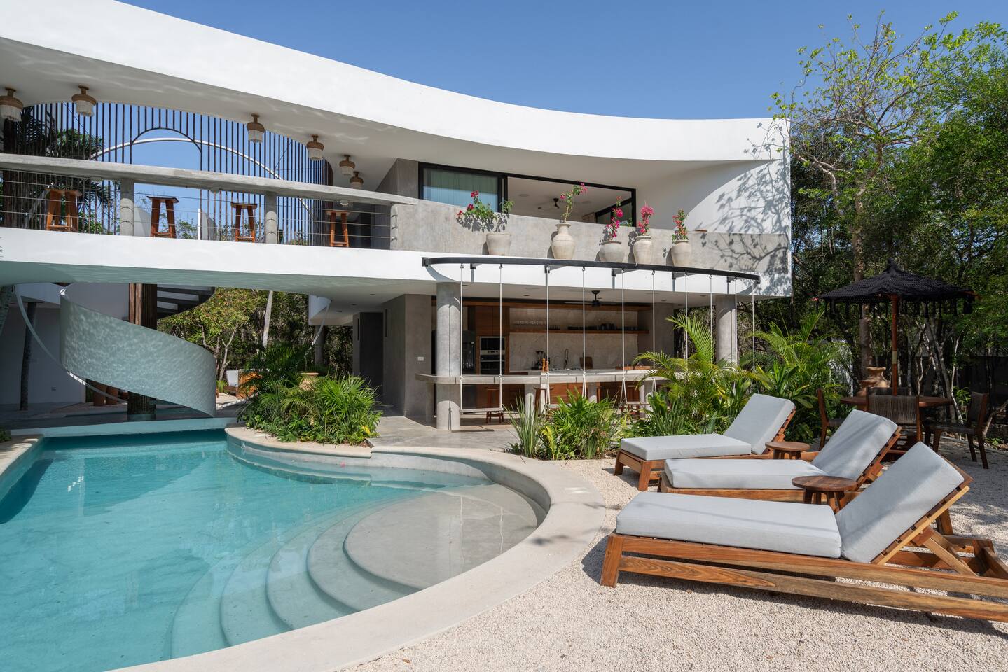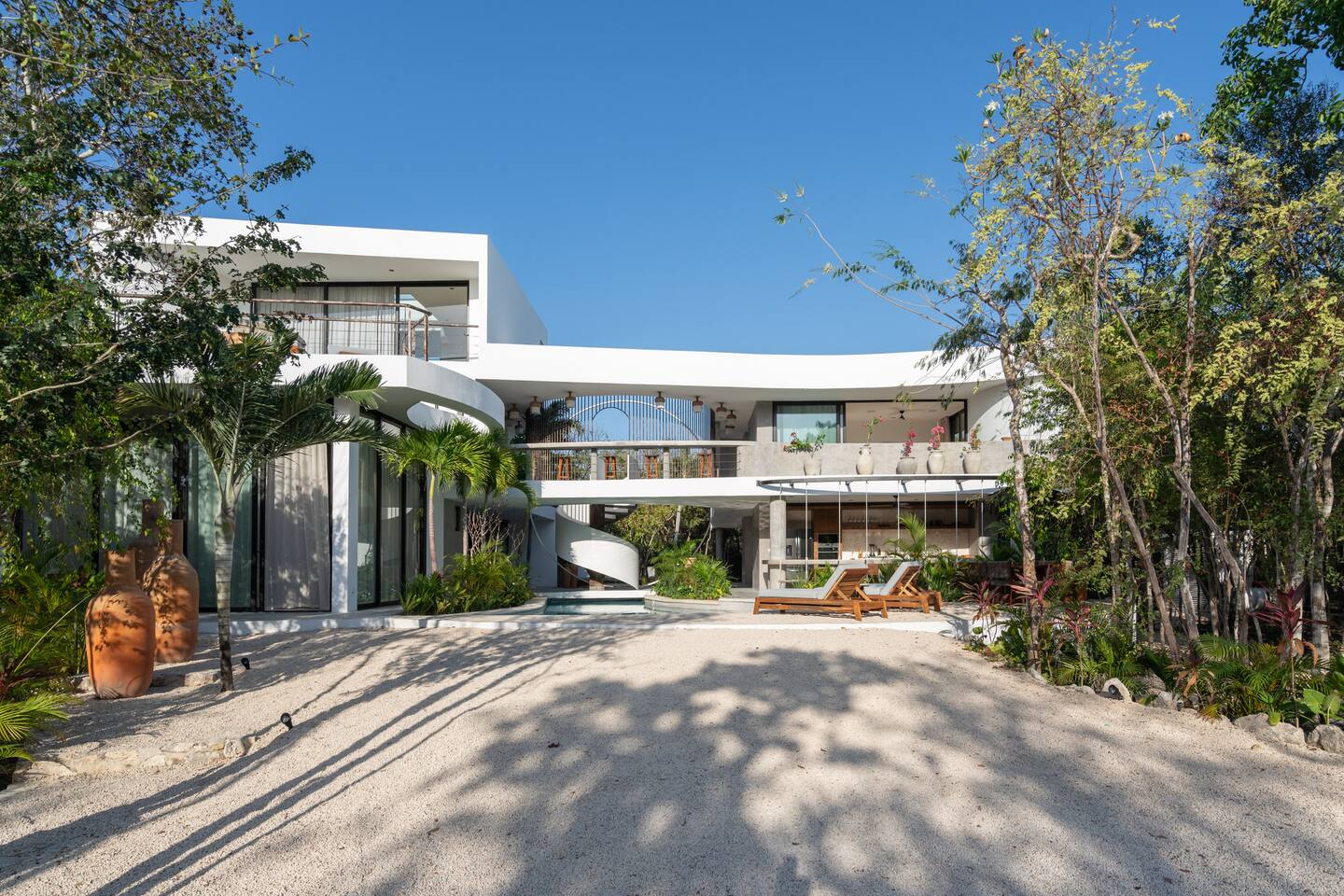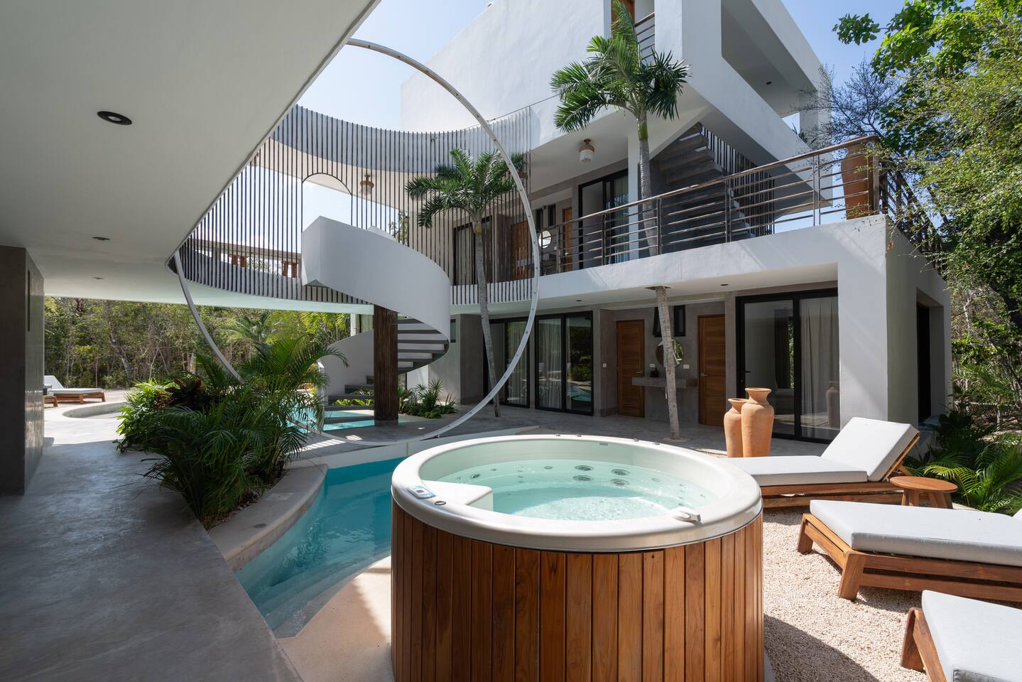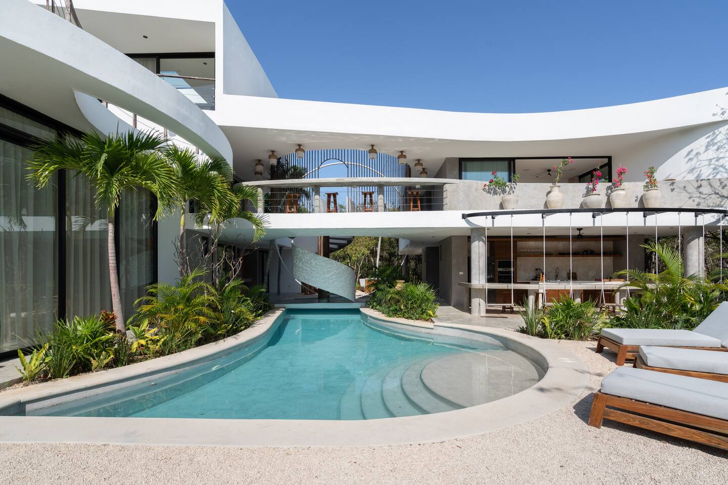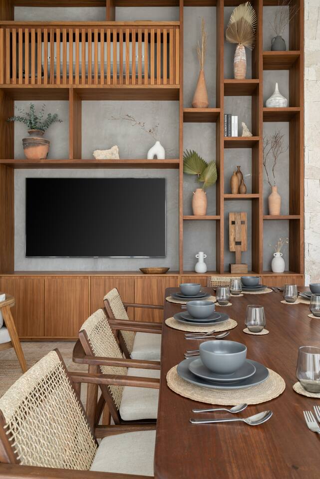 Welcome to your dream escape in the heart of the Tulum jungle - a luxurious 9-bedroom villa designed for unforgettable experiences, ideal for large groups, retreats, family gatherings, or private events. This secluded three-level villa seamlessly blends indoor-outdoor living with modern comforts and natural beauty, all tucked within a secure gated community with 24-hour security and private parking. **Villa Layout & Common Spaces:** A stunning open-concept home where nature and luxury coexist in perfect harmony. The villa features soaring ceilings in the enclosed main living room, outfitted with plush lounge seating, a large flat screen TV with streaming services, and built-in surround sound speakers throughout the house. The living space includes a dining area perfect for shared meals and celebrations. A wall of glass doors connects the indoors to the expansive outdoor area, where the impressive swimming pool stretches the entire length of the home. Surrounding the pool are multiple sun loungers, tropical greenery, and shaded lounge areas—ideal for soaking up the jungle vibes by day and stargazing by night. Three spacious terraces throughout the house offer panoramic views over the lush Tulum jungle, with one perfectly positioned for breathtaking sunsets. **Wellness & Leisure Amenities:** For those seeking balance and relaxation, the villa features a tranquil spa room with a large spa jacuzzi and a small, fully-equipped fitness space/yoga terrace. Two additional spa jacuzzis are placed throughout the property, offering relaxing spots for unwinding after a day of adventure. The natural beauty of the surroundings includes an exclusive, private cenote accessible only to the homes within the gated community—an unforgettable place for a morning swim or quiet meditation. **Bedrooms & Comfort:** Each of the nine bedrooms is thoughtfully designed for rest and privacy, with hotel-quality linens, high-end mattresses, and plenty of natural light. Every room includes its own closet, air conditioning, and tranquil jungle views. The sleeping arrangements offer flexibility for any group, with king beds in all rooms to accommodate up to 18 guests comfortably. Several bedrooms have private balconies or access to one of the villa’s stunning terraces. **Additional Features:** * Fully equipped modern kitchen * Indoor/outdoor speaker system * Hotel-style high-quality towels and linens * Private parking on-site * Housekeeping, concierge, and trip planning and design * Wi-Fi throughout the property Whether you’re planning a yoga retreat, a milestone birthday, or simply want to relax in secluded luxury, this villa is a one-of-a-kind experience in Tulum. Surrounded by tropical birds and untouched jungle, yet just a short drive to Tulum’s beach and town, it offers the best of both worlds—privacy and convenience, nature and indulgence. This is more than just a stay—this is your private jungle sanctuary.