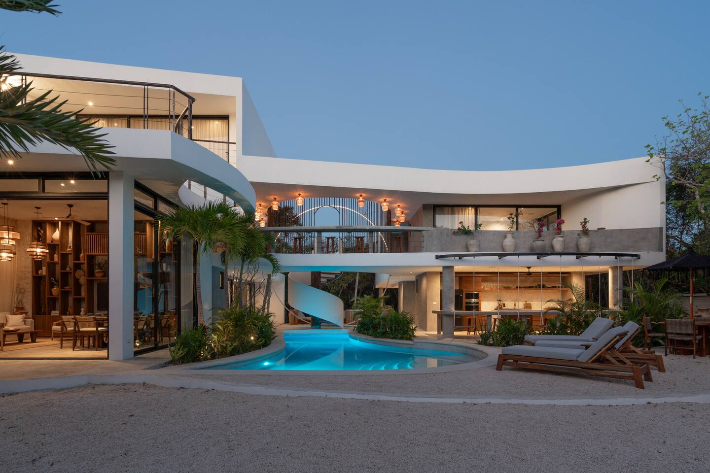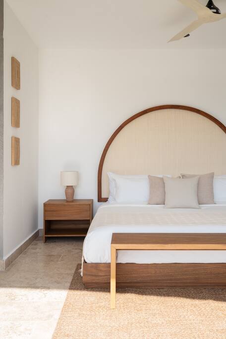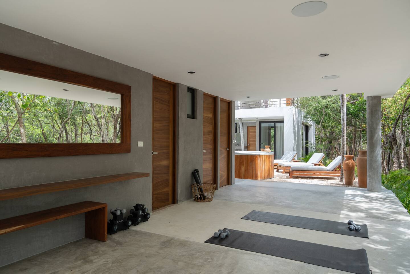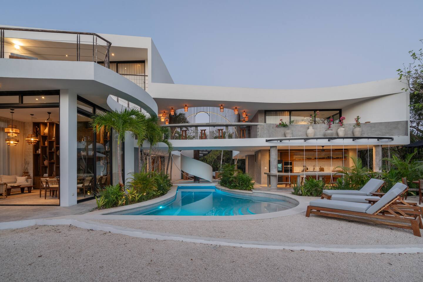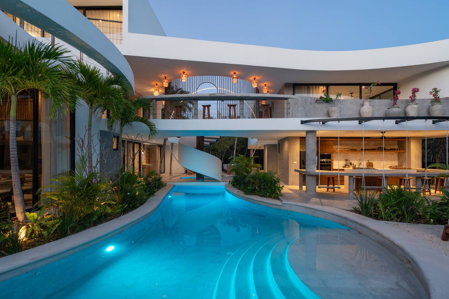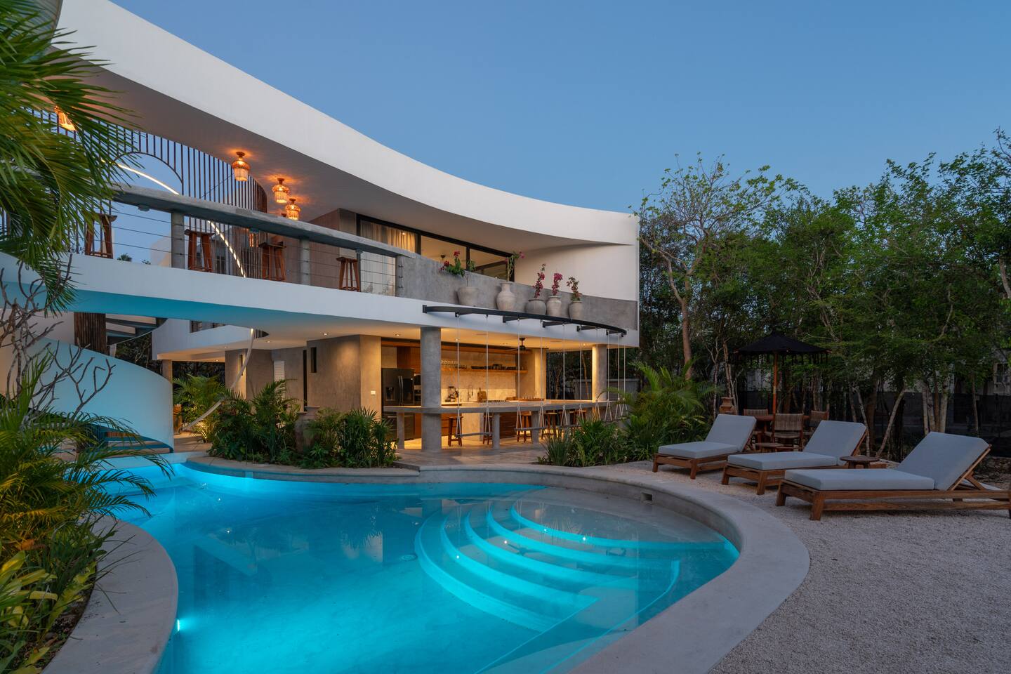 Welcome to your dream escape in the heart of the Tulum jungle - a luxurious 9-bedroom villa designed for unforgettable experiences, ideal for large groups, retreats, family gatherings, or private events. This secluded three-level villa seamlessly blends indoor-outdoor living with modern comforts and natural beauty, all tucked within a secure gated community with 24-hour security and private parking. **Villa Layout & Common Spaces:** A stunning open-concept home where nature and luxury coexist in perfect harmony. The villa features soaring ceilings in the enclosed main living room, outfitted with plush lounge seating, a large flat screen TV with streaming services, and built-in surround sound speakers throughout the house. The living space includes a dining area perfect for shared meals and celebrations. A wall of glass doors connects the indoors to the expansive outdoor area, where the impressive swimming pool stretches the entire length of the home. Surrounding the pool are multiple sun loungers, tropical greenery, and shaded lounge areas—ideal for soaking up the jungle vibes by day and stargazing by night. Three spacious terraces throughout the house offer panoramic views over the lush Tulum jungle, with one perfectly positioned for breathtaking sunsets. **Wellness & Leisure Amenities:** For those seeking balance and relaxation, the villa features a tranquil spa room with a large spa jacuzzi and a small, fully-equipped fitness space/yoga terrace. Two additional spa jacuzzis are placed throughout the property, offering relaxing spots for unwinding after a day of adventure. The natural beauty of the surroundings includes an exclusive, private cenote accessible only to the homes within the gated community—an unforgettable place for a morning swim or quiet meditation. **Bedrooms & Comfort:** Each of the nine bedrooms is thoughtfully designed for rest and privacy, with hotel-quality linens, high-end mattresses, and plenty of natural light. Every room includes its own closet, air conditioning, and tranquil jungle views. The sleeping arrangements offer flexibility for any group, with king beds in all rooms to accommodate up to 18 guests comfortably. Several bedrooms have private balconies or access to one of the villa’s stunning terraces. **Additional Features:** * Fully equipped modern kitchen * Indoor/outdoor speaker system * Hotel-style high-quality towels and linens * Private parking on-site * Housekeeping, concierge, and trip planning and design * Wi-Fi throughout the property Whether you’re planning a yoga retreat, a milestone birthday, or simply want to relax in secluded luxury, this villa is a one-of-a-kind experience in Tulum. Surrounded by tropical birds and untouched jungle, yet just a short drive to Tulum’s beach and town, it offers the best of both worlds—privacy and convenience, nature and indulgence. This is more than just a stay—this is your private jungle sanctuary.