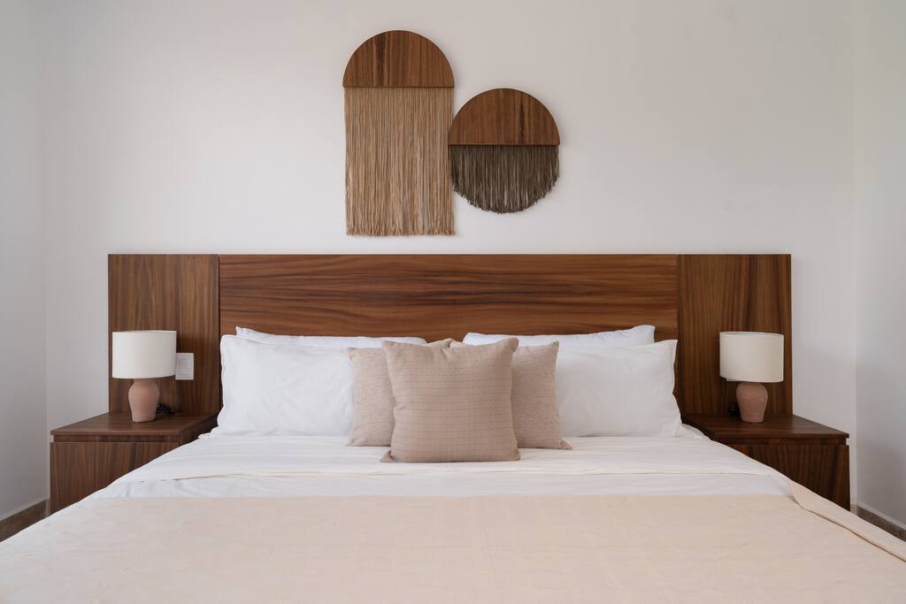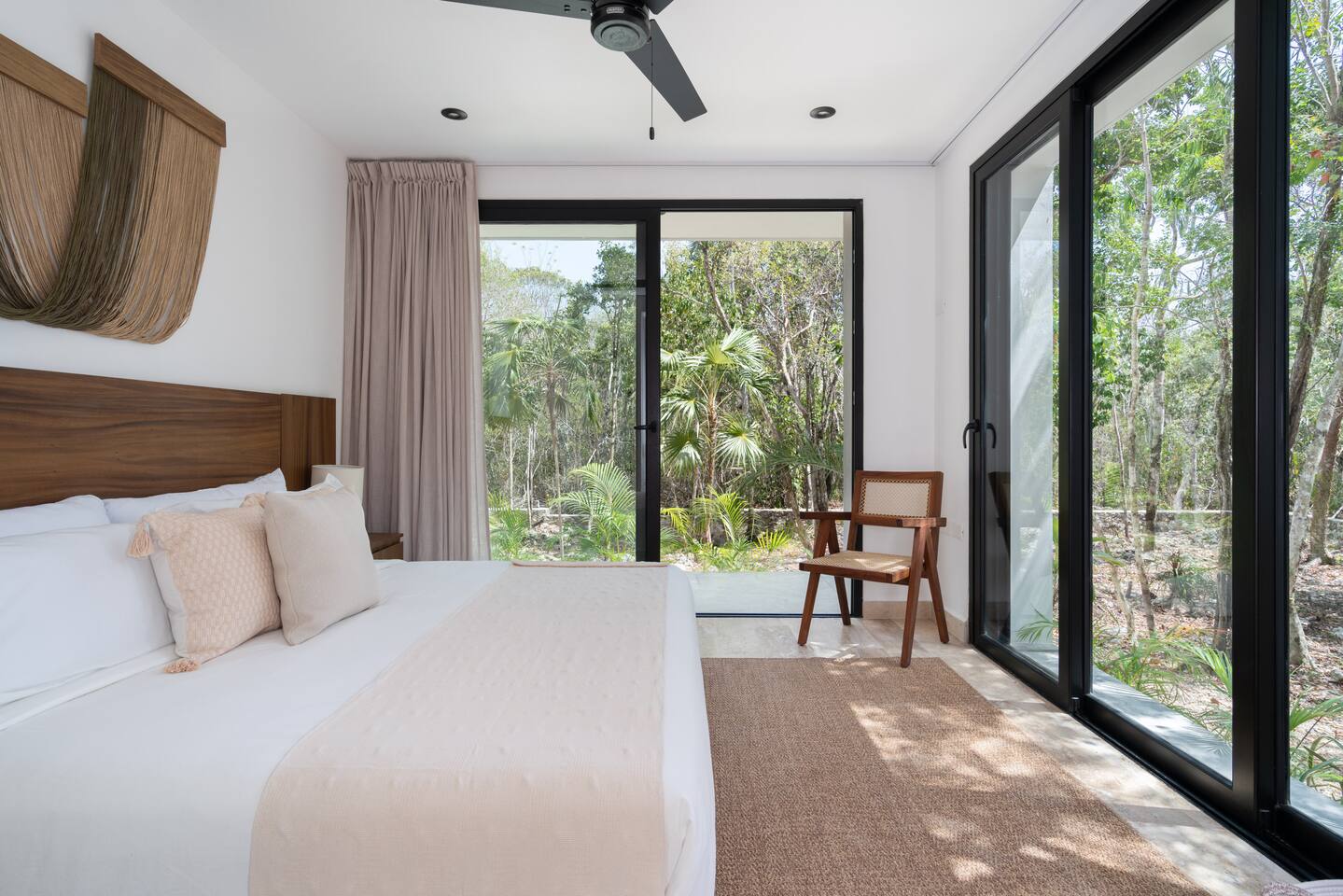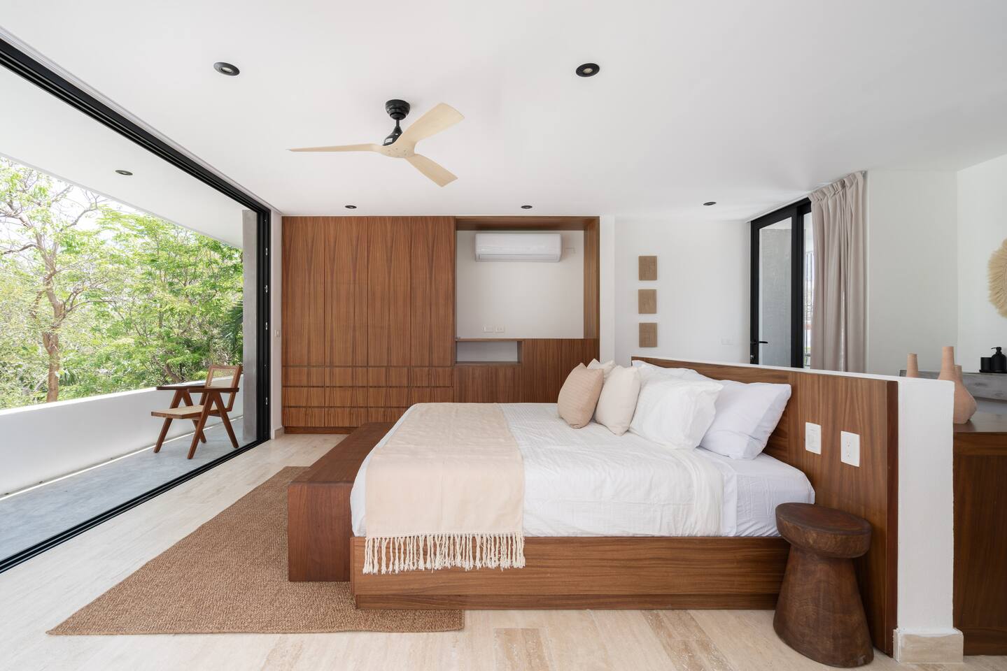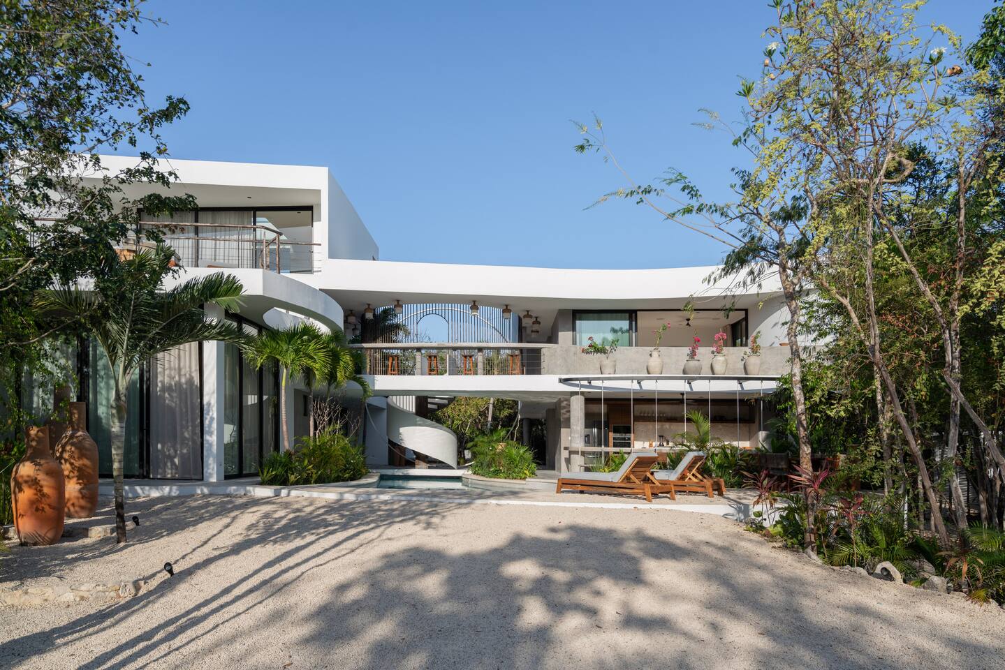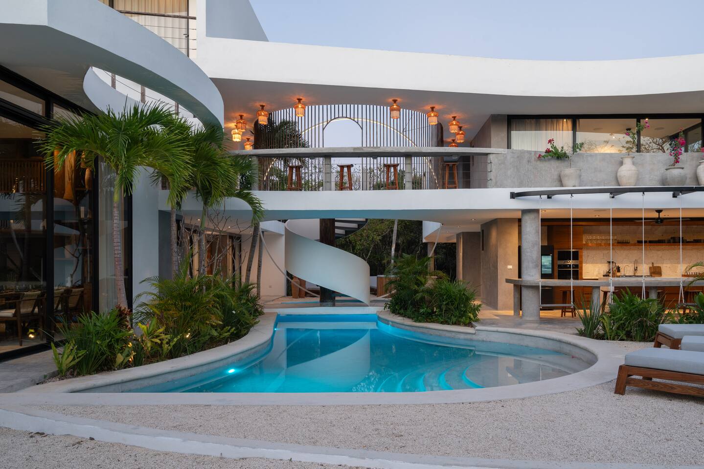 Welcome to your dream escape in the heart of the Tulum jungle - a luxurious 9-bedroom villa designed for unforgettable experiences, ideal for large groups, retreats, family gatherings, or private events. This secluded three-level villa seamlessly blends indoor-outdoor living with modern comforts and natural beauty, all tucked within a secure gated community with 24-hour security and private parking. **Villa Layout & Common Spaces:** A stunning open-concept home where nature and luxury coexist in perfect harmony. The villa features soaring ceilings in the enclosed main living room, outfitted with plush lounge seating, a large flat screen TV with streaming services, and built-in surround sound speakers throughout the house. The living space includes a dining area perfect for shared meals and celebrations. A wall of glass doors connects the indoors to the expansive outdoor area, where the impressive swimming pool stretches the entire length of the home. Surrounding the pool are multiple sun loungers, tropical greenery, and shaded lounge areas—ideal for soaking up the jungle vibes by day and stargazing by night. Three spacious terraces throughout the house offer panoramic views over the lush Tulum jungle, with one perfectly positioned for breathtaking sunsets. **Wellness & Leisure Amenities:** For those seeking balance and relaxation, the villa features a tranquil spa room with a large spa jacuzzi and a small, fully-equipped fitness space/yoga terrace. Two additional spa jacuzzis are placed throughout the property, offering relaxing spots for unwinding after a day of adventure. The natural beauty of the surroundings includes an exclusive, private cenote accessible only to the homes within the gated community—an unforgettable place for a morning swim or quiet meditation. **Bedrooms & Comfort:** Each of the nine bedrooms is thoughtfully designed for rest and privacy, with hotel-quality linens, high-end mattresses, and plenty of natural light. Every room includes its own closet, air conditioning, and tranquil jungle views. The sleeping arrangements offer flexibility for any group, with king beds in all rooms to accommodate up to 18 guests comfortably. Several bedrooms have private balconies or access to one of the villa’s stunning terraces. **Additional Features:** * Fully equipped modern kitchen * Indoor/outdoor speaker system * Hotel-style high-quality towels and linens * Private parking on-site * Housekeeping, concierge, and trip planning and design * Wi-Fi throughout the property Whether you’re planning a yoga retreat, a milestone birthday, or simply want to relax in secluded luxury, this villa is a one-of-a-kind experience in Tulum. Surrounded by tropical birds and untouched jungle, yet just a short drive to Tulum’s beach and town, it offers the best of both worlds—privacy and convenience, nature and indulgence. This is more than just a stay—this is your private jungle sanctuary.