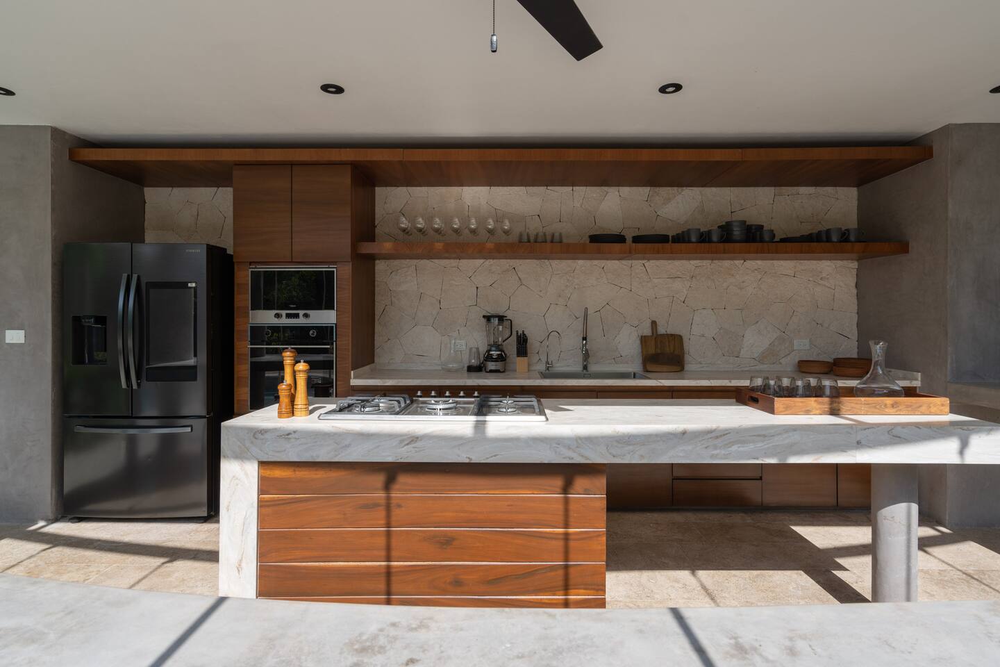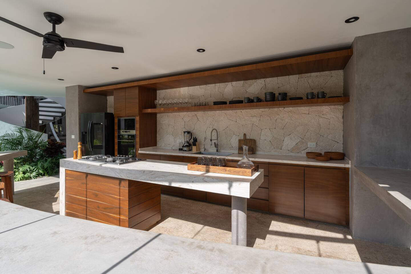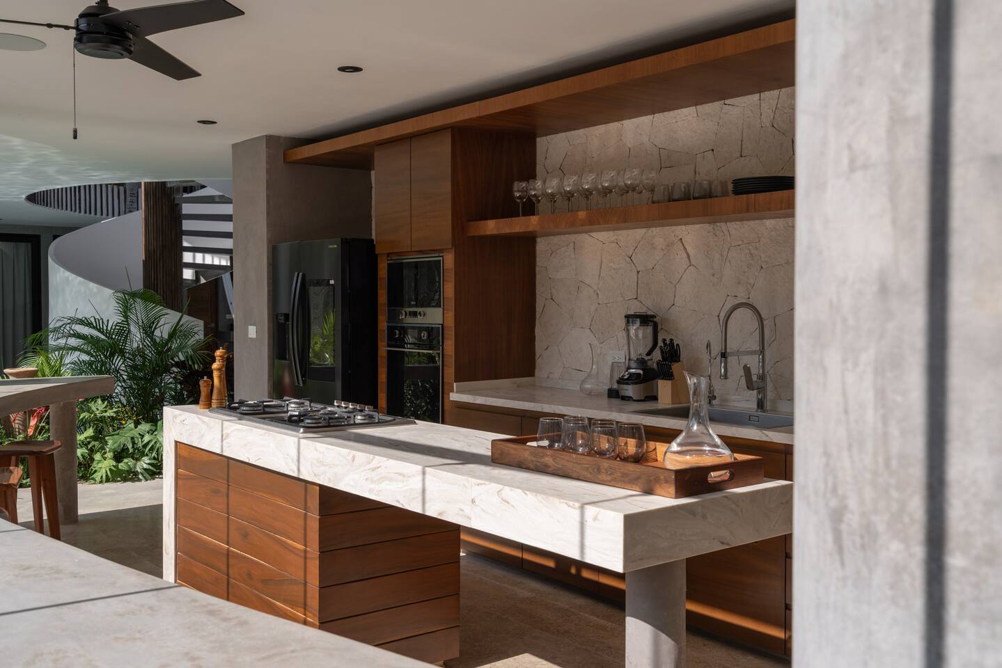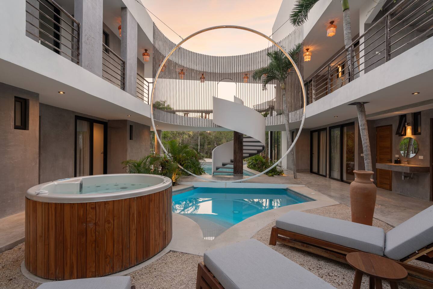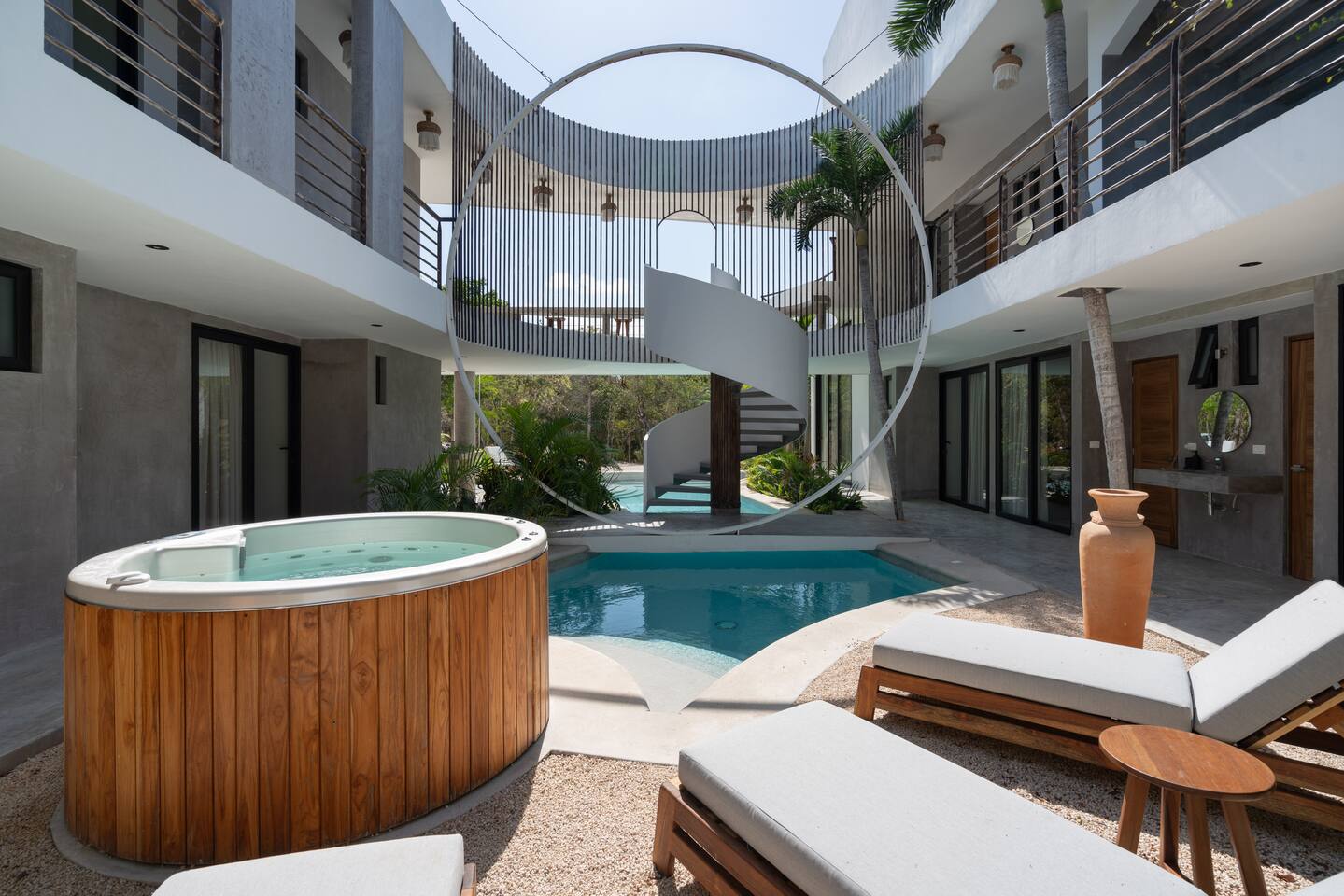 Welcome to Villa Aqua, Escape to a luxurious 9-bedroom villa nestled in the heart of Tulum’s lush jungle. Perfect for large groups, retreats, and events, this secluded haven is an open concept villa embracing the nature surrounding it. It features a large pool, 2 spa jacuzzis, a small gym/yoga terrace, a spa room, and an open outdoor kitchen. Guests also enjoy access to a private cenote shared only by villa in the complex. Full time cleaning and concierge staff are included with your stay.