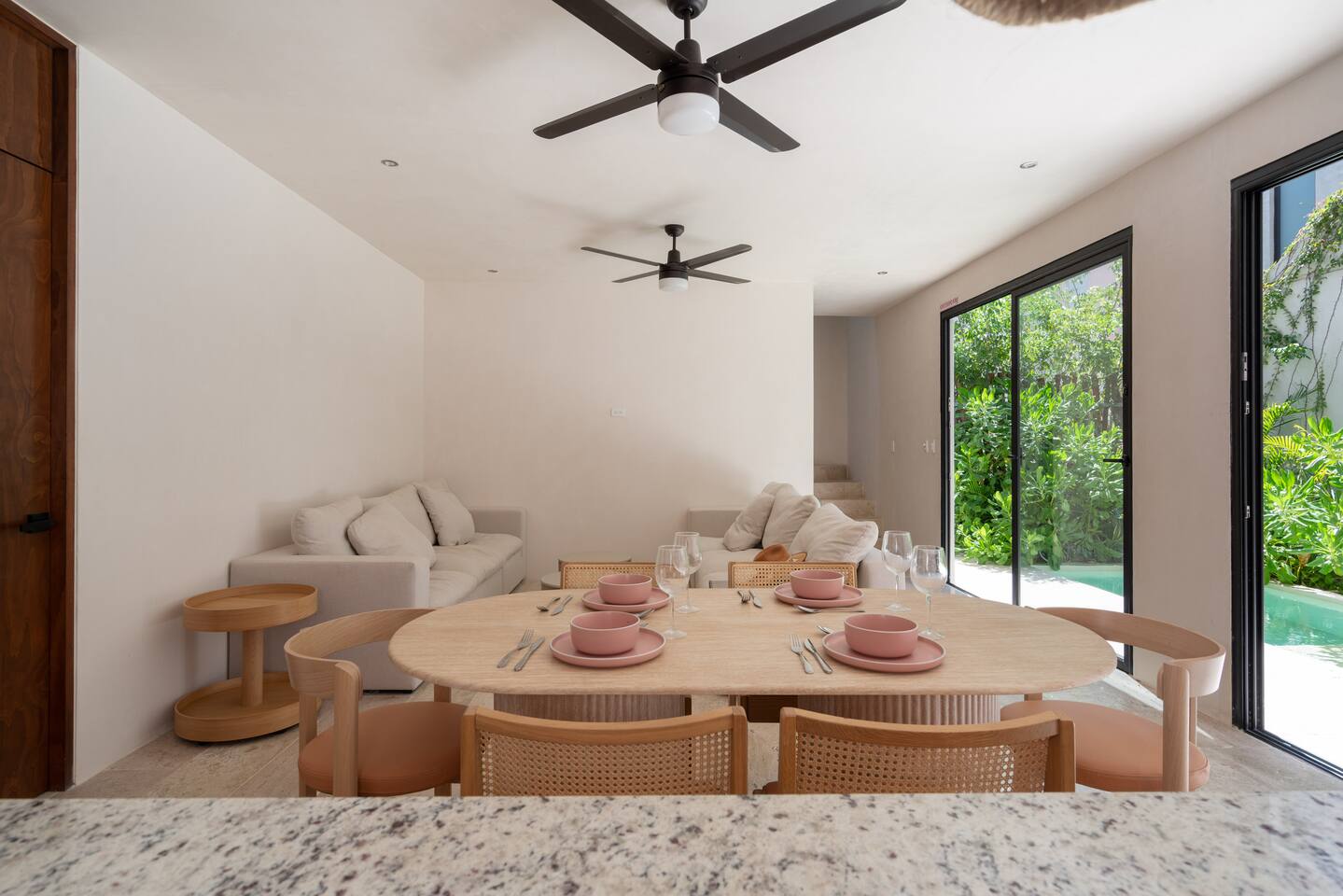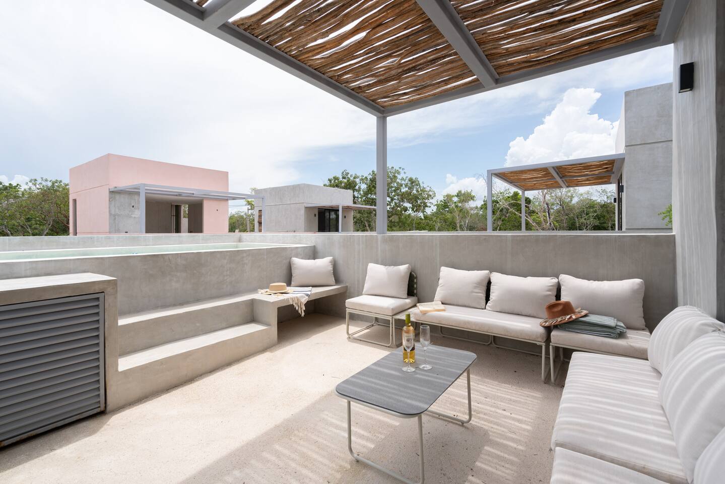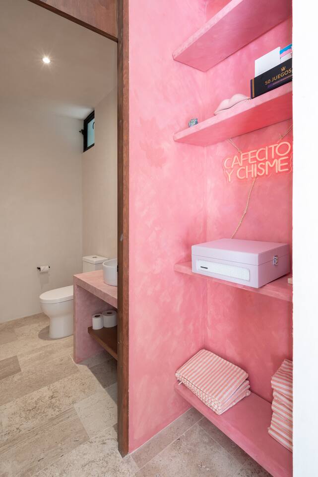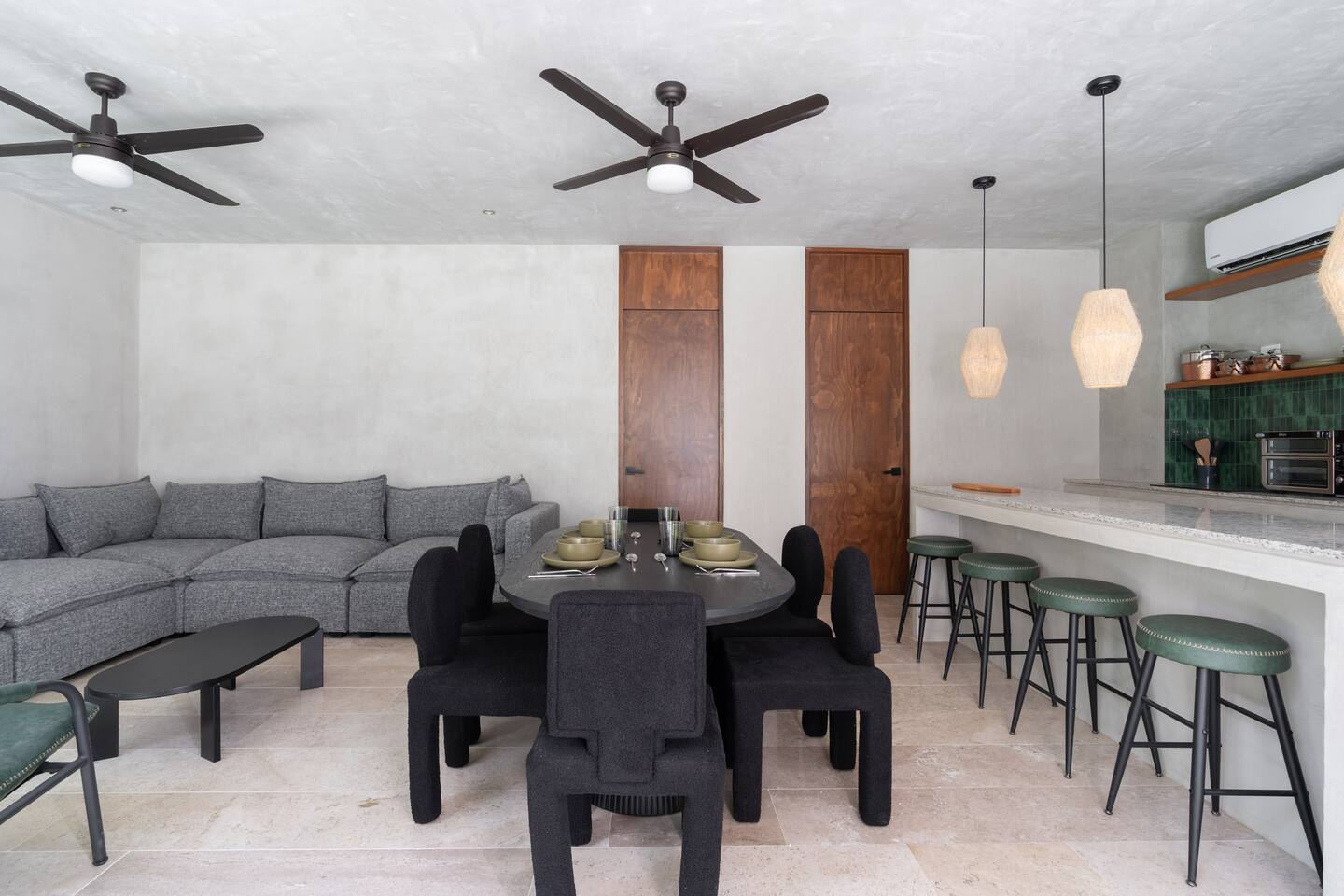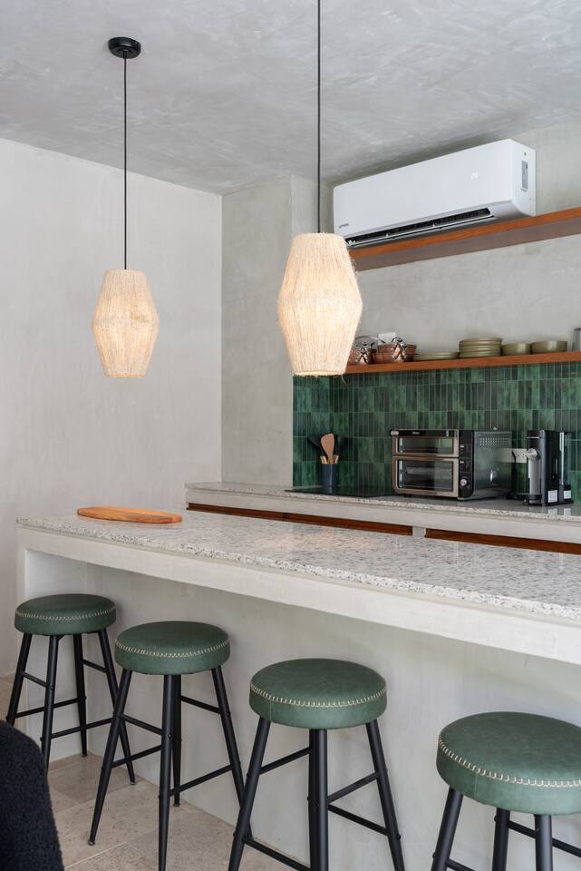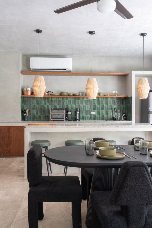 This house has a unique layout, two houses that combine into one large villa with capacity for 12 people. There are two separate kitchens and living rooms in each side of the house. 6 bedrooms, 2 ground level pools and two rooftop pools on each side of the house. The house comes equipped with air conditioning in every room as well as high speed wifi. Each of the 6 bedrooms has it's own ensuite bathroom, ceiling fan, plush mattresses and pillows, and hotel quality linens. Bath towels and pool towels are also provided during your stay. The ground level of the villa has open concept living-dining spaces with fully equipped kitchens and large dining tables. There is a projector to watch movies during your stay. Your reservation also includes a full service concierge that can assist you with airport transportation, private chef services, massage and wellness services, tours and excursions, ATVs and scooter rentals, beach club reservations, and much more.